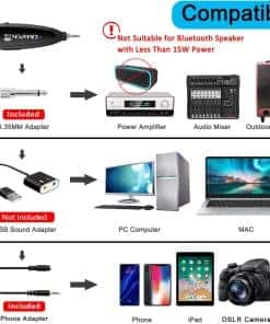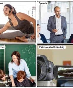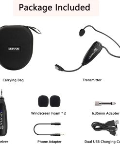 El dispositivo que capta el sonido consta de una carcasa a prueba de polvo y anti-corrosión y un condensador profesional impermeable. Puede eliminar eficazmente las interferencias ambientales y lograr una alta fidelidad y restauración de la recepción de voz. Además, el cuello de cisne y el micrófono de diadema están construidos con materiales impermeables y a prueba de sudor. Nuestro objetivo es proporcionar un micrófono confiable y cómodo para los clientes de fitness. El micrófono de diadema 2.4G adopta transmisión inalámbrica internacional de 2,4 GHz que puede conectarse automáticamente en 2 segundos. El paquete incluye un adaptador de teléfono para teléfonos Android e iPhone, y un adaptador de 6.35 mm (1/4″) para amplificador de voz, mezclador de audio y altavoz externo. Cuando use este micrófono en computadora portátil/computadora, por favor ordene una tarjeta de sonido USB. Una vez instalado el micrófono en su dispositivo con el adaptador adecuado, puede obtener la mejor calidad de sonido grabando el audio o video. El transmisor y el receptor inalámbricos son alimentados por baterías de litio integradas. Pueden cargarse simultáneamente con el cable USB dual. La luz indicadora se volverá roja al cargar y se apagará cuando esté completamente cargada. El transmisor y el receptor pueden cargarse completamente en 3-4 horas y utilizarse durante 6-8 horas. Por favor, use un cargador de 5V, 1A-2A para cargar. El cargador no está incluido. El paquete incluye una bolsa de transporte de alta calidad, fácil de almacenar y llevar. El micrófono se puede utilizar de dos maneras: como un micrófono de diadema general, o retirar el soporte para la cabeza, se convertirá en un micrófono de mano. El transmisor inalámbrico está fijado en el soporte para la cabeza. Puede ayudarte a deshacerte de las ataduras de los cables para disfrutar de la máxima comodidad y libertad de movimiento. El micrófono es adecuado para entrenadores de fitness, entrenadores de spinning, entrenadores de aeróbicos, entrenadores de yoga, entrenadores de pilates, deportes acuáticos, profesores de gimnasia, maestros, discursos, grabación de video/audio en YouTube, y mucho más.