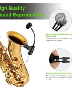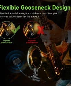 4. Diseño flexible de cuello de ganso El clip de micrófono de saxofón inalámbrico, que cuenta con almohadillas de goma, es firme y estable, sin causar daños a su saxofón, trompeta, tuba, etc. El cuello de ganso está diseñado para la flexibilidad y está fabricado con materiales de alta calidad, asegurando estabilidad y facilidad de ajuste sin el molesto rebote.