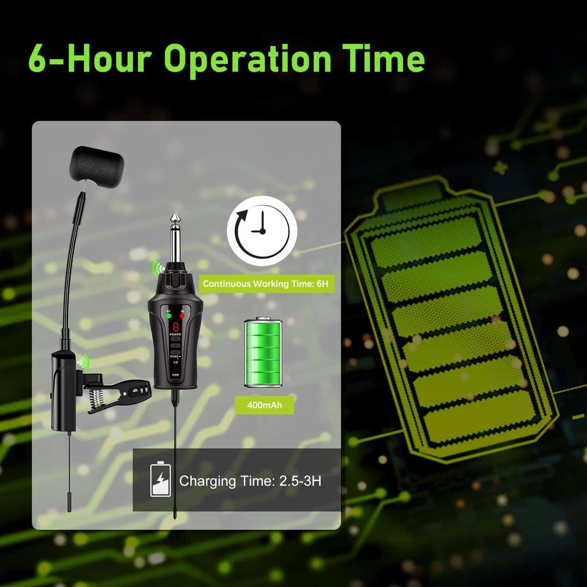 5. Tiempo de uso continuo de 6 horas Este sistema de micrófono para saxofón está equipado con una batería recargable incorporada, ofrece 6 horas de uso continuo después de una carga de 2.5 a 3 horas. Incluido en el paquete hay un cable de carga 2 en 1 para cargar simultáneamente tanto el transmisor como el receptor. Ideal para conciertos, bodas, iglesias, enseñanza, actuaciones de bandas, espectáculos en bares, actuaciones de músicos personales y pequeños conciertos.