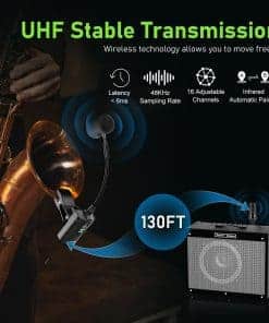 1. Transmisión estable UHF El sistema de micrófono inalámbrico para saxofón utiliza frecuencia UHF y tecnología avanzada de transmisión de audio digital, con emparejamiento automático por infrarrojos, una frecuencia de muestreo de 48 kHz y un retardo de audio ultra corto. Esto asegura una transmisión de sonido de calidad de grabación. El sistema ofrece una transmisión estable de hasta 130 pies en áreas abiertas. (Nota: Asegúrese de que la antena en la parte inferior del receptor esté instalada antes del uso formal.).