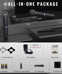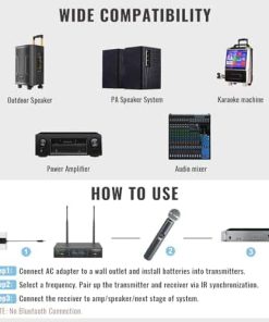 En Phenyx, nos enfocamos constantemente en los detalles, exploramos mejores técnicas de producción y utilizamos materiales resistentes para construir nuestros productos. Estamos decididos a ofrecer soluciones mejores y más sencillas para el rendimiento del sonido y proporcionar a nuestros clientes un valor de alta gama sin pagar de más. El Sistema de Micrófono Inalámbrico de Doble Canal UHF Phenyx PTU-71 está diseñado para proporcionar una excelente reproducción del sonido en cualquier entorno formal o recreativo: La Tecnología de Sincronización por Infrarrojos mejora la búsqueda de frecuencias y empareja rápidamente el receptor con el transmisor. La Tecnología PLL-Sintetizada ofrece un alto nivel de estabilidad y precisión de frecuencia, lo que garantiza una excelente calidad de sonido y disminuye las desconexiones. hasta 80 selecciones de canales y hasta 250 pies de distancia operativa en espacios abiertos. El adaptador de cable de audio de 6.5 mm a 3.5 mm proporciona más flexibilidad. ESPECIFICACIONES: Sistema General Rango de frecuencia portadora: UHF 530-580 MHz Estabilidad de frecuencia: 0,003% Respuesta de frecuencia: 50Hz – 18kHz Nivel de salida de audio: interfaz: 0-500mV; Interfaz XLR: 0 – 500mV Distancia de trabajo: Hasta 80m/260 pies Receptor Impedancia de salida: Conector XLR: 200 Sensibilidad RF: -105dBm Rechazo de imagen: 110dB Rechazo de espurias: 90dB Potencia: 5W Requisitos de energía: DC 12- 18V, Corriente: 400mA, Adaptador de corriente externo. ATENCIÓN: 1. Utilice los 80 canales de 530-580 MHz en EE. UU. debido a regulaciones locales. 2. Este paquete solo contiene el sistema de micrófono inalámbrico. Aún necesita tener un dispositivo de audio adicional (altavoz o amplificador) para reproducir el sonido. 3. Este paquete no contiene cable de micrófono con conector XLR.