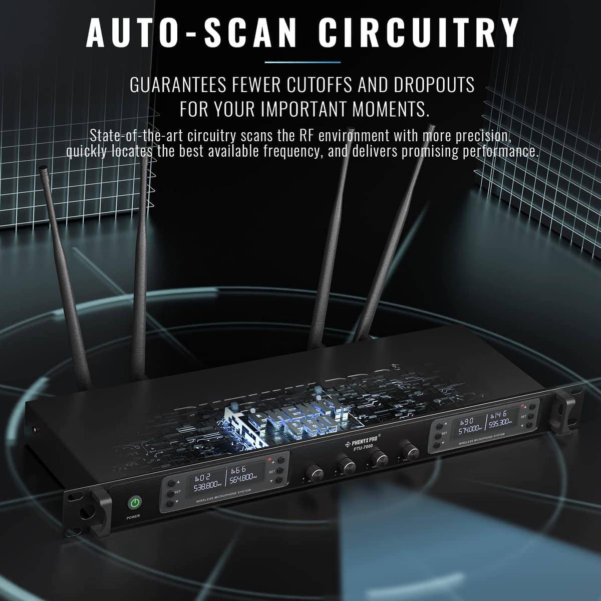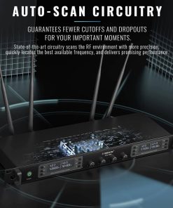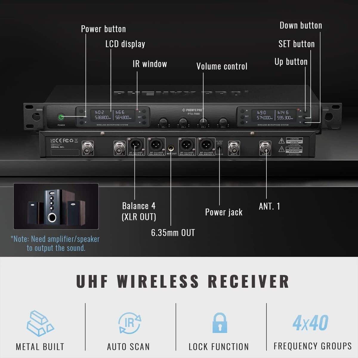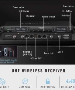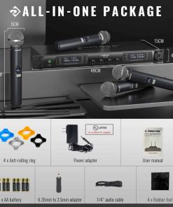 Sistema de micrófono inalámbrico de 4 canales UHF con frecuencias seleccionables. La operación a larga distancia permite un alcance de hasta 328 pies en línea de visión. La función de auto escaneo permite buscar el canal con menos interferencia para emparejar transmisores. Construcción robusta para el receptor inalámbrico y los micrófonos dinámicos. El sistema de micrófono inalámbrico Phenyx Pro es adecuado para iglesias, bodas, karaoke, DJ, discursos públicos, etc. Viene con receptor inalámbrico de metal de cuatro canales, 4 micrófonos de mano UHF inalámbricos, cable de audio de 1/4, adaptador de corriente, antena, anillo anti-rodadura, baterías AA para 16 horas de uso, manual de usuario. Los productos de audio Phenyx Pro cuentan con garantía de 12 meses y servicio al cliente dedicado.