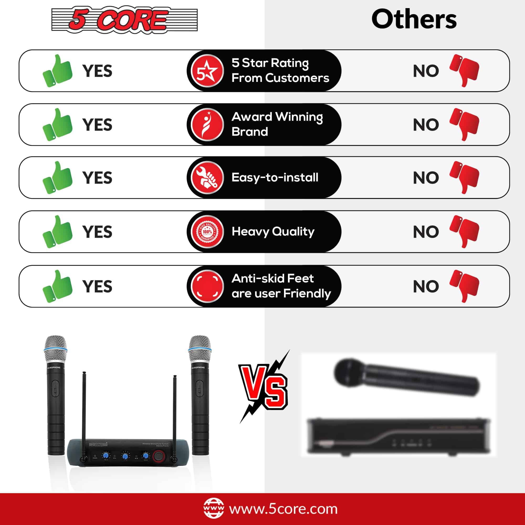 1. Calidad de audio clara y prístina que preserva el tono natural y elimina ruidos de fondo y aullidos. 2. Estabilidad de señal mejorada y rango de transmisión largo de 200 pies en espacio abierto que garantiza libertad de movimiento. 3. Micrófono resistente y duradero con rejilla de malla de acero que mantiene seguros los componentes internos y aumenta la longevidad. 4. Fácil de operar, simplemente encienda los receptores y micrófonos, y deberían emparejarse automáticamente rapidamente. 5. Patrón de captación unidireccional cardioide que captura el sonido desde el frente mientras minimiza el ruido lateral y trasero.