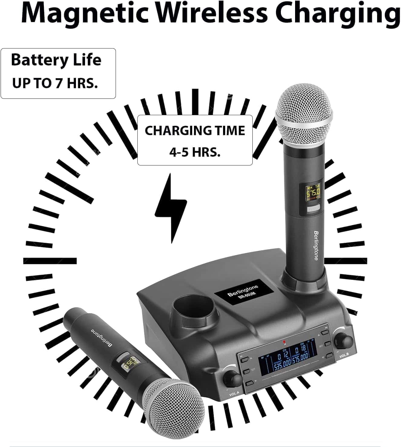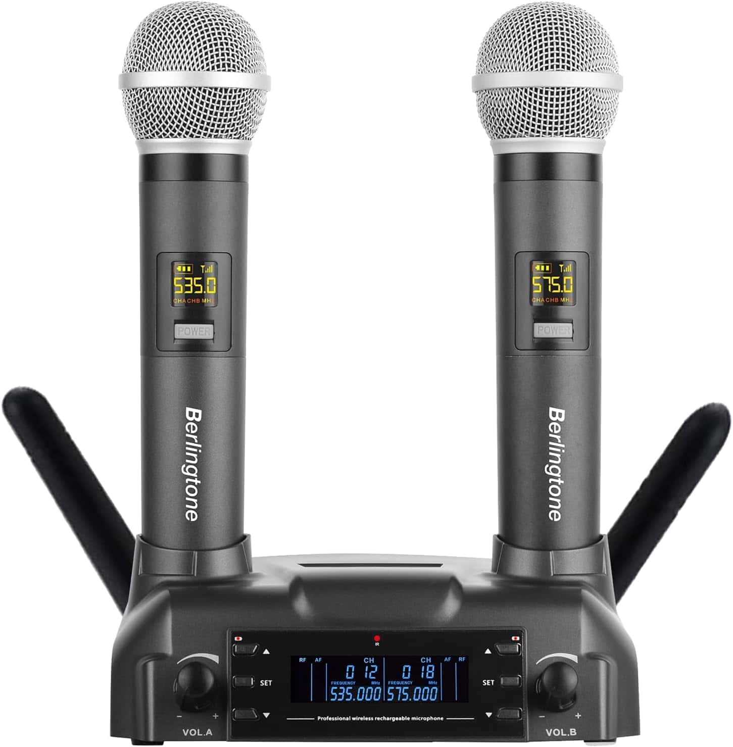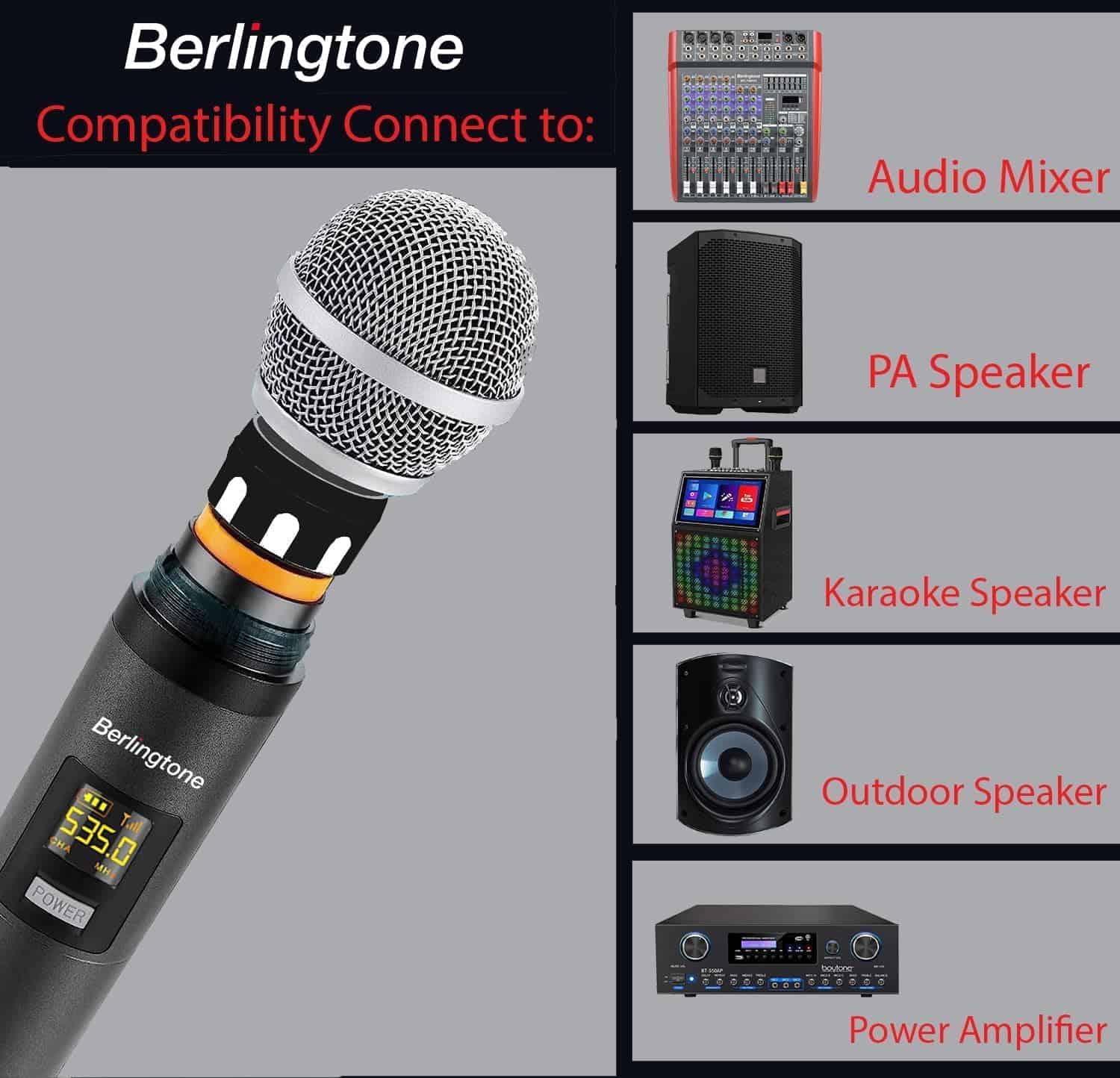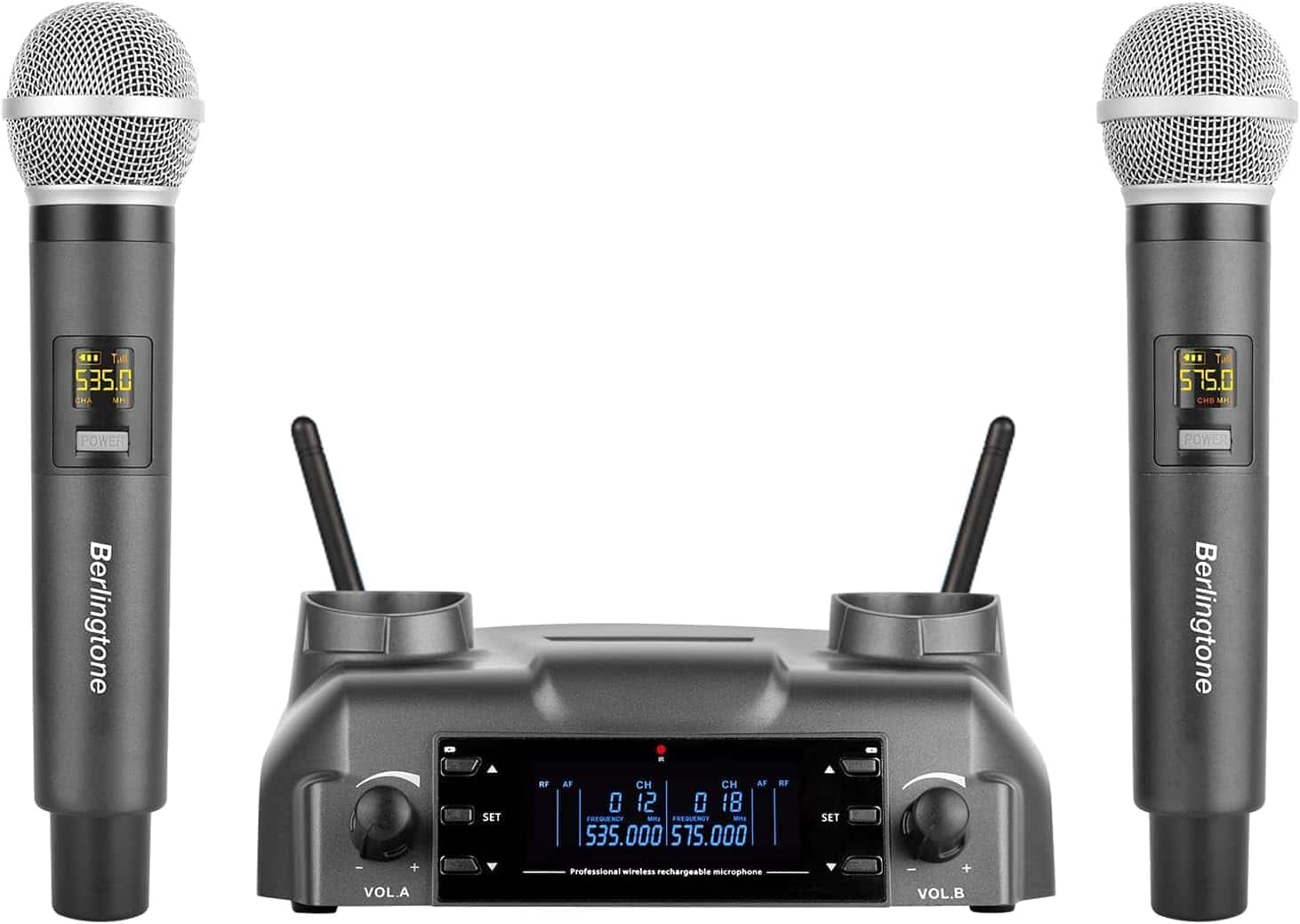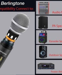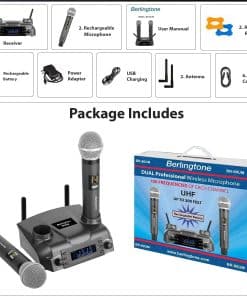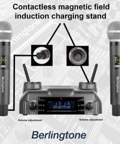 Berlingtone: Rango de Frecuencia: 480 a 585MHz. 100 frecuencias seleccionables por canal. Respuesta de Frecuencia: 40Hz a 18KHz. Estabilidad de Frecuencia: +10ppm. Sensibilidad: -90dBm. T.H.D.: <0.5%. Salida Mix: 300mv. Balance: 150mV. Alimentación: 12-15V. Relación S/N: 90dB. Potencia del Transmisor: 10dBm. Velocidad de Transmisión: 204.8Kbps. Alimentación: 3.7V/1200mAh (batería recargable). Estuche de Aluminio. Pantalla Digital. Indicador de Carga para Canto.