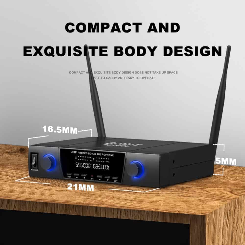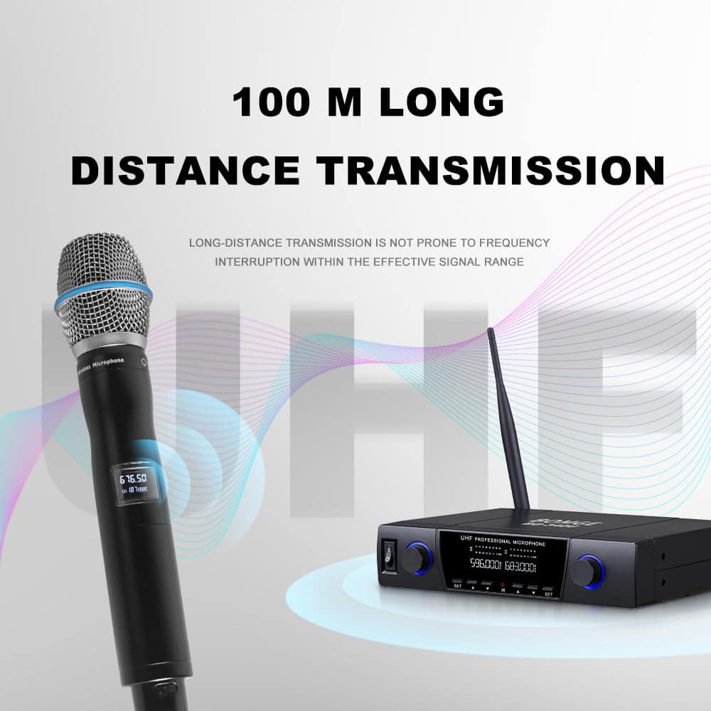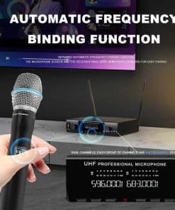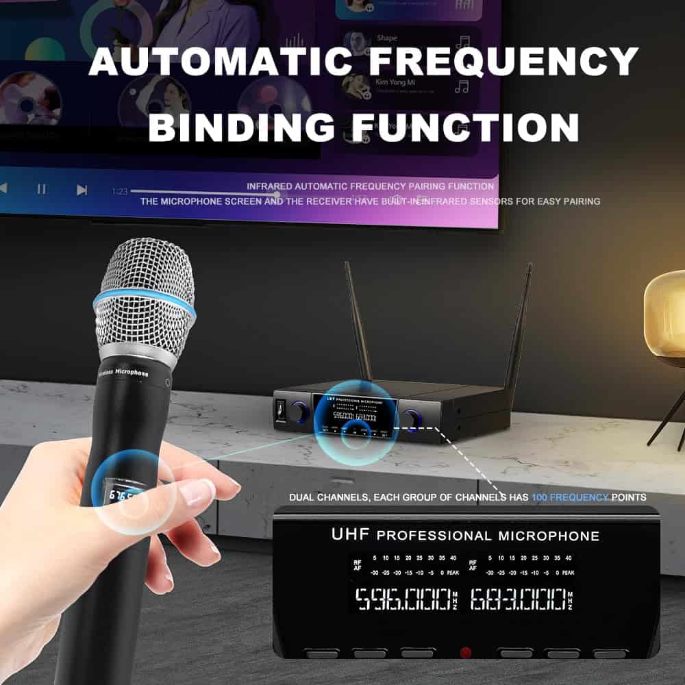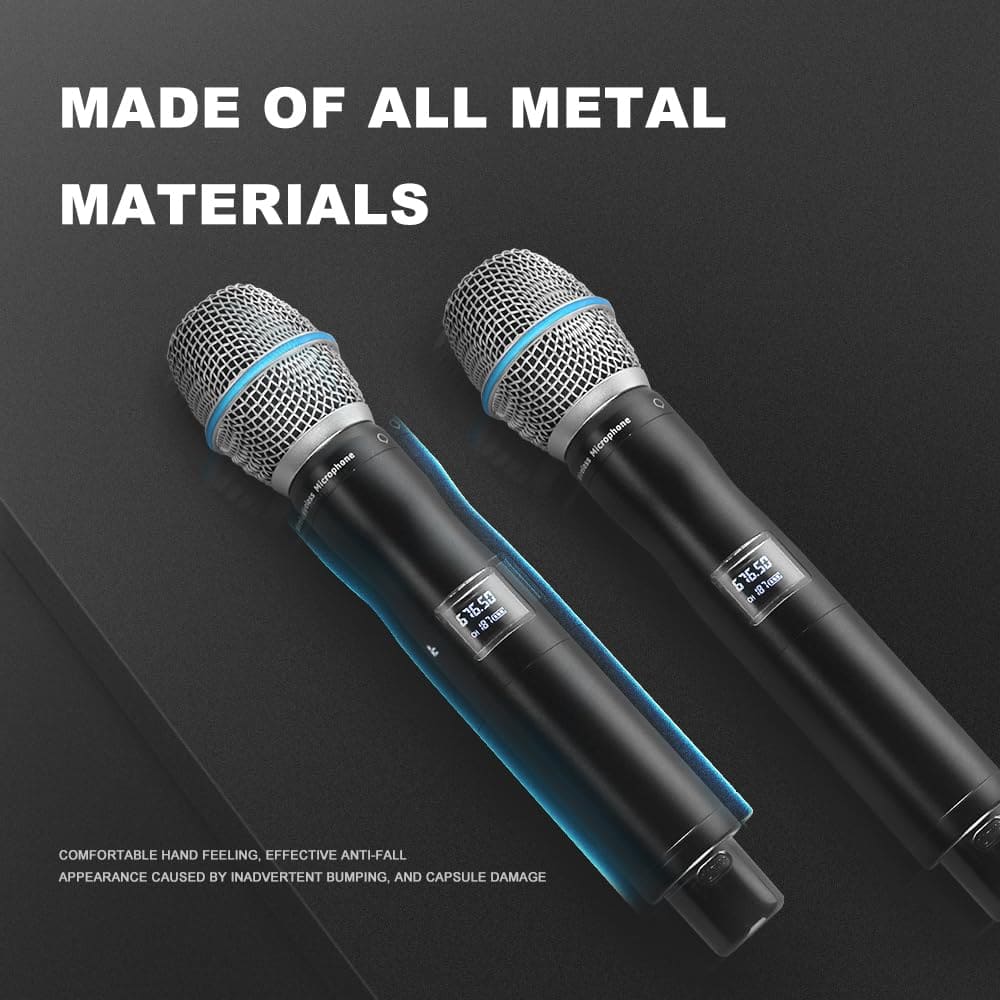 4. CONSTRUCCIÓN ROBUSTA CON DETALLES: El receptor inalámbrico UHF de metal y los micrófonos inalámbricos están diseñados para durar, siendo adecuados para un uso intensivo. El sistema de micrófono inalámbrico para karaoke también incluye un estuche sólido para un transporte seguro. El set de micrófono inalámbrico también viene con 2 anillos antideslizantes para codificar por colores tus micrófonos de mano.