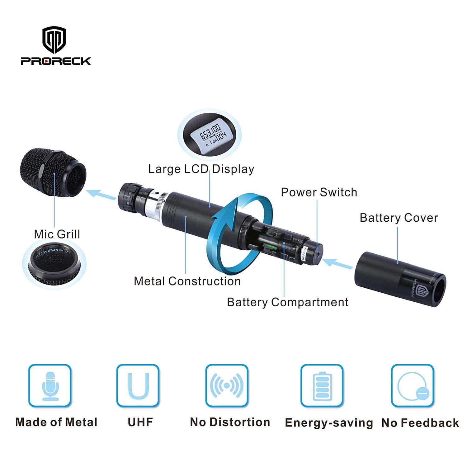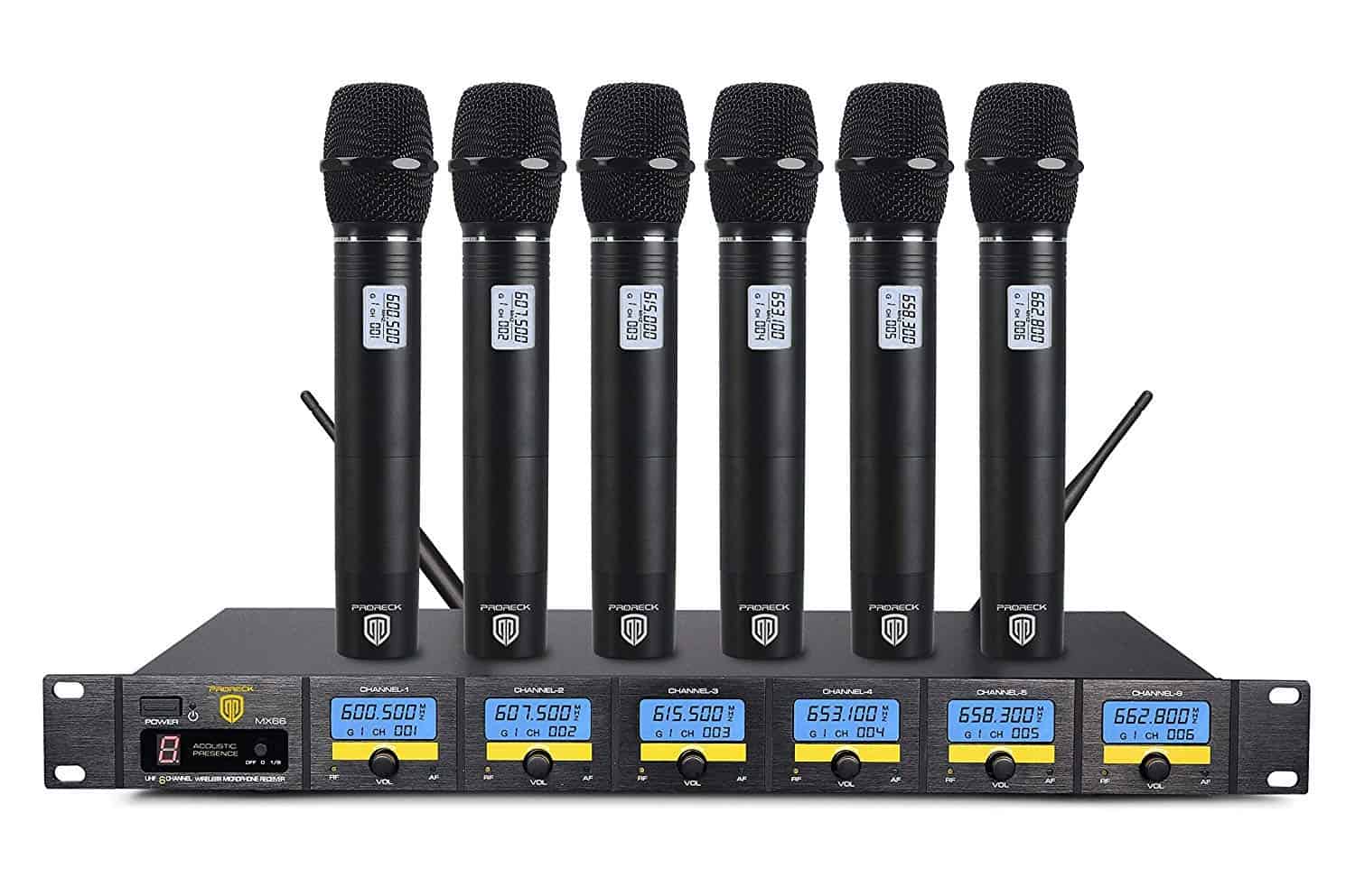 Sistema de micrófono inalámbrico UHF de 6 canales PRORECK MX66 con 6 micrófonos de mano para Máquina de Karaoke, ideal para todo tipo de actividades en interiores y exteriores como fiestas, iglesia, discursos, bodas, reuniones familiares, etc. Cuenta con certificación de la FCC y cumple con las nuevas reglas de la FCC. El sistema de micrófono UHF profesional ofrece una gran señal de audio y es mucho más estable que el VHF. Funciona muy bien con todos los altavoces PRORECK, con seis salidas XLR y una salida de mezcla de 1/4 (6.35mm) para conectar este sistema versátil a la mayoría de los amplificadores, mesas de mezclas y altavoces activos en el mercado. El rango de funcionamiento es de 200 pies dentro de la línea de visión, con controles de volumen separados y una gran pantalla LCD. Cuenta con indicador de señal AF y RF, 8 tipos de modos de EQ (JAZZ POP COUNTRY ROCK, etc) para diferentes lugares o espectáculos, y antenas mejoradas que aseguran una recepción de audio estable y eficaz. Los seis micrófonos cardioide unidireccionales del sistema ofrecen un sonido claro y fuerte, hechos de metal y con ahorro de energía. Cada micrófono necesita 2 pilas AA (no incluidas) y tiene una frecuencia fija de 600.5-607.5-615.5-653.1-658.3-662.8MHz. Nota: 2 juegos no se pueden usar juntos y es adecuado para 110V/230V. Viene con 1 receptor, 6 micrófonos, 1 cable TS de 6.35mm, 1 cargador de energía y 1 manual de usuario. El tamaño del receptor es de 21x 13.5x 3.2 pulgadas y el tamaño de cada micrófono es de 9.3 1.8 pulgadas. Disfruta de la garantía de alta calidad y fiabilidad con una garantía sin problemas de piezas y mano de obra por 1 año.
