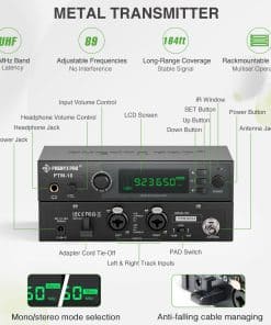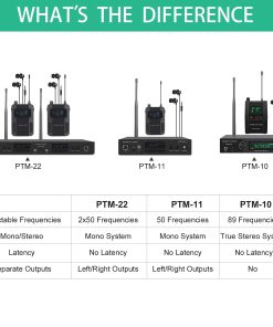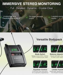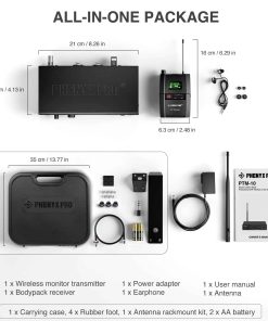 En Phenyx, nos enfocamos constantemente en los detalles, exploramos mejores técnicas de producción y utilizamos materiales resistentes para construir nuestros productos. Estamos comprometidos a ofrecer soluciones mejores y más fáciles para el rendimiento de sonido y proporcionar a nuestros clientes un valor de alta gama sin pagar de más. El Sistema de Monitor Inalámbrico Estéreo Phenyx Pro UHF es una solución práctica para bloquear el exceso de ruido en el escenario y proporcionar un sonido consistente siempre que suba al escenario, permitiendo diseños de escenarios despejados, aumentando la libertad de movimiento y mejorando las actuaciones de sonido. Características del sistema: Modo de operación estéreo/mono, Función de bloqueo para bloquear el sistema en un grupo/canal específico, Sistema montable en rack con 2 racks metálicos incluidos en el paquete, Estuche de PVC negro para proteger el sistema durante el transporte. Sonido claro, puro y sin distorsiones. Especificaciones del sistema: Frecuencia Portadora: Modo de oscilación PLL sintetizada, Estabilidad de Frecuencia: 0.005%, Rechazo Espurio: -60 dBc, T.H.D.: menos del 0.5%, Salida de auriculares: Jack estéreo de 1/4″ con volumen ajustable, Entrada de audio: Jack XLR balanceado izquierdo y derecho + 1/4 pulgadas.
