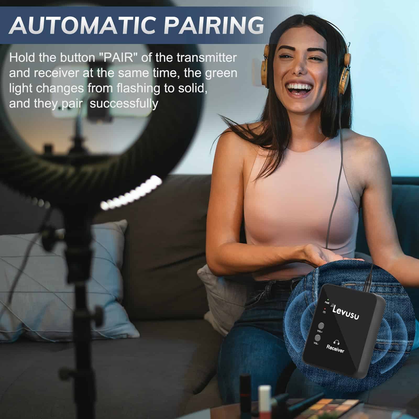 2. Fácil de usar El transmisor y el receptor inalámbricos pueden emparejarse automáticamente, no es necesario ajustar manualmente el canal. Encienda la alimentación, mantenga presionados los dos botones «PAIR» al mismo tiempo para emparejar, espere hasta que la luz verde esté encendida, emparejamiento exitoso y uso. Así de simple es.