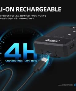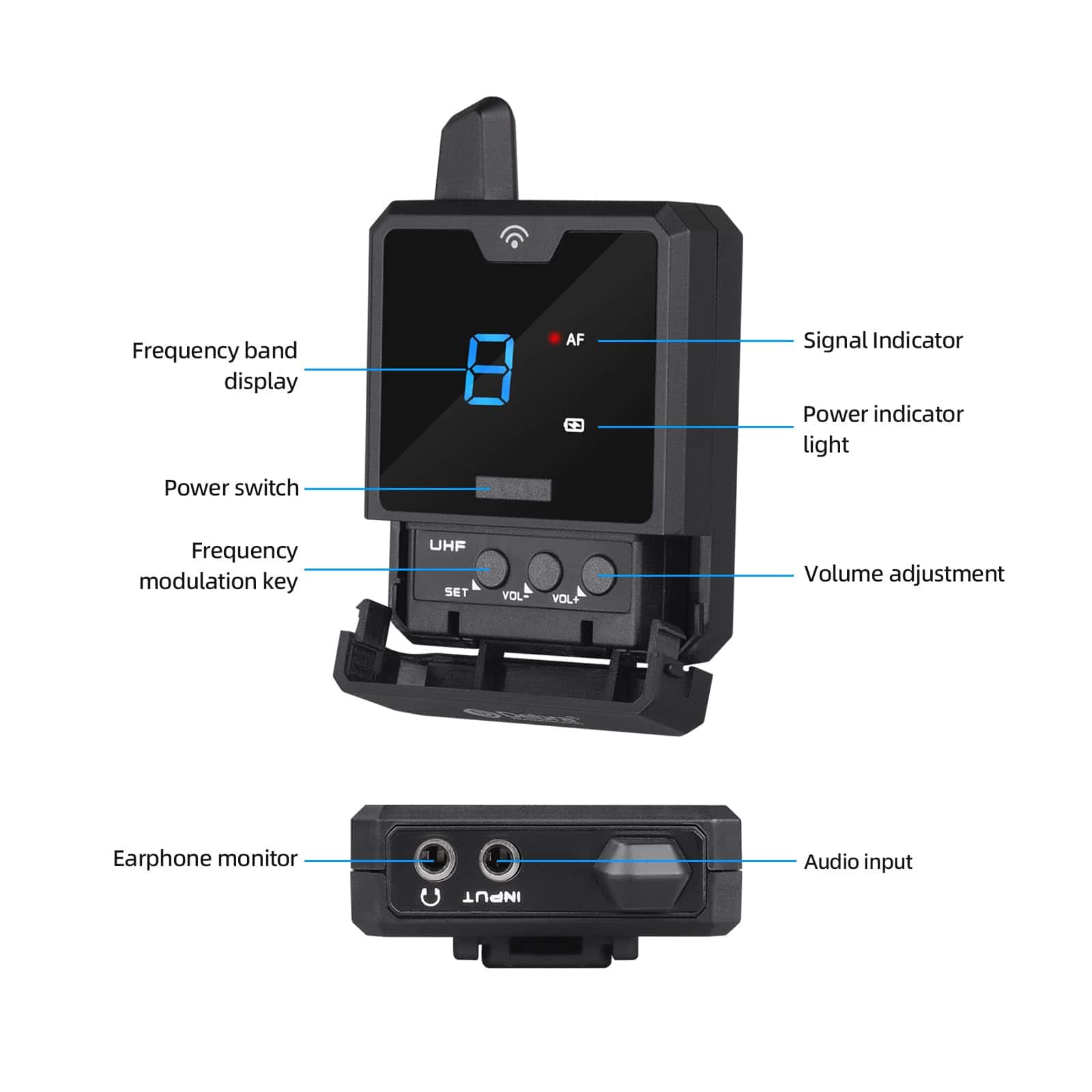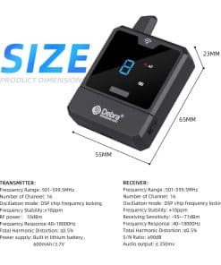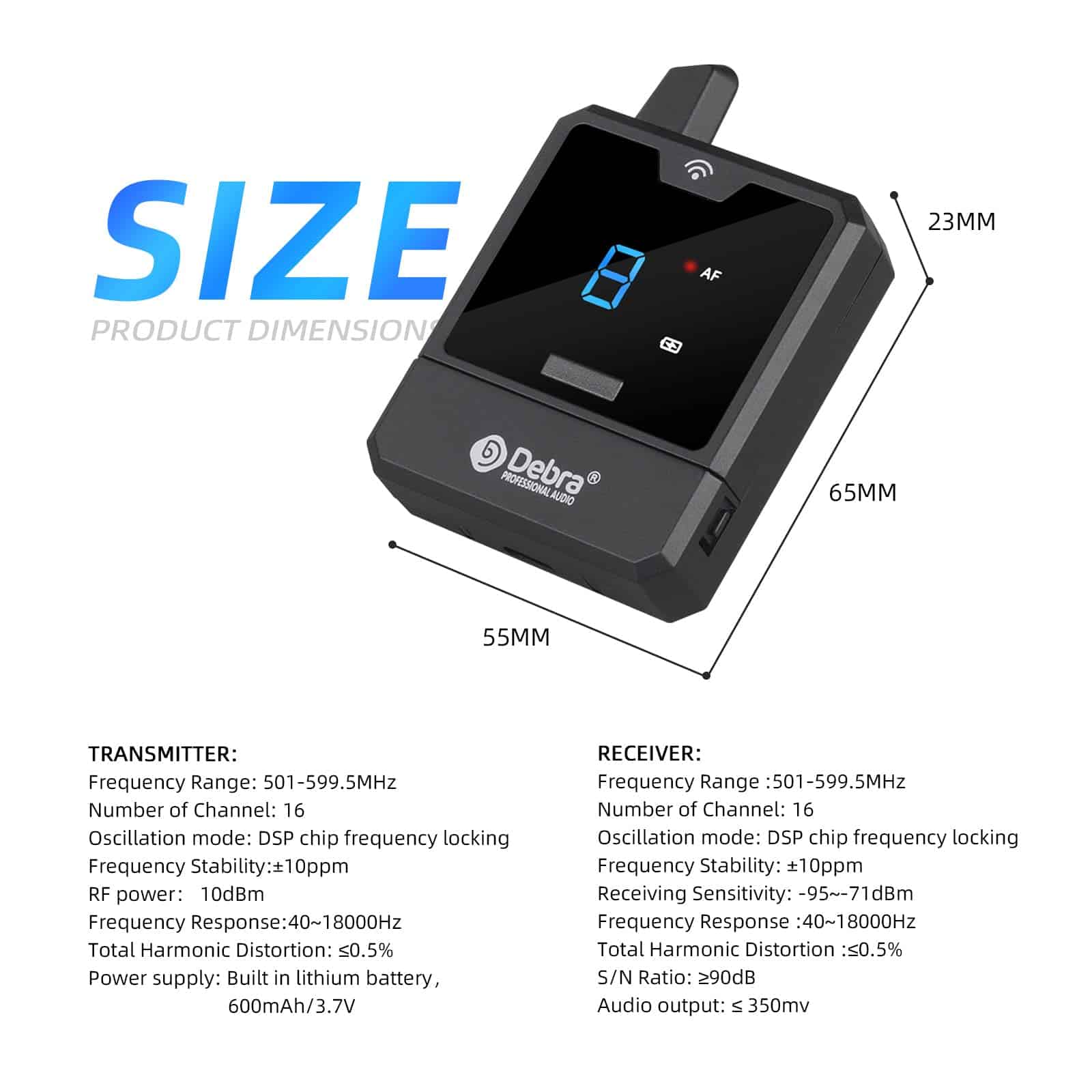 TRANSMISOR 1. Rango de Frecuencia: 501-599.5MHz 2. Número de Canales: 16 1,2,3,4,5,6,7,8,9 A,B,C,D,E,F,0 3. Modo de Oscilación: Bloqueo de frecuencia de chip DSP 4. Estabilidad de Frecuencia: 10ppm 5. Potencia de RF: 10dBm 6. Respuesta de Frecuencia: 40~18000Hz 7. Distorsión Armónica Total: 0.5% 8. Fuente de Alimentación: Batería de litio integrada 600mAh/3.7V Receptor 1. Rango de Frecuencia: 501-599.5MHz 2. Número de Canales: 16 1,2,3,4,5,6,7,8,9 A,B,C,D,E,F,0 3. Modo de Oscilación: Bloqueo de frecuencia de chip DSP 4. Estabilidad de Frecuencia: 10ppm 5. Sensibilidad de Recepción: -95~-71dBm 6. Respuesta de Frecuencia: 40~18000Hz 7. Distorsión Armónica Total: 0.5% 8. Relación Señal/Ruido: 90dB 9. Salida de Audio: 350mv 10. Fuente de Alimentación: Batería de litio integrada 600mAh/3.7V
