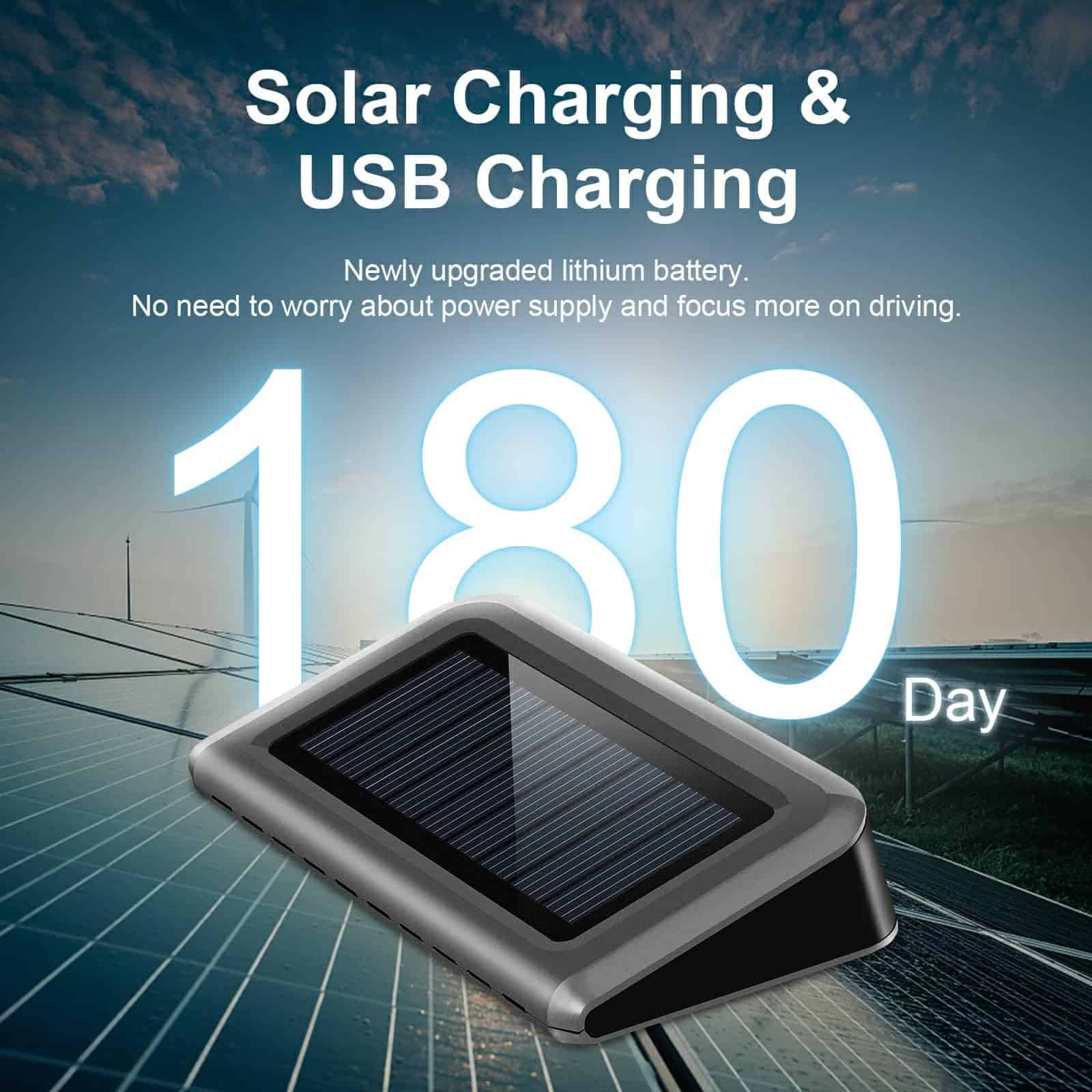 3. Carga Solar USB El TPMS admite tanto métodos de carga USB como solar. Permite una carga rápida sin necesidad de intervención manual, garantizando el funcionamiento continuo del sistema TPMS.