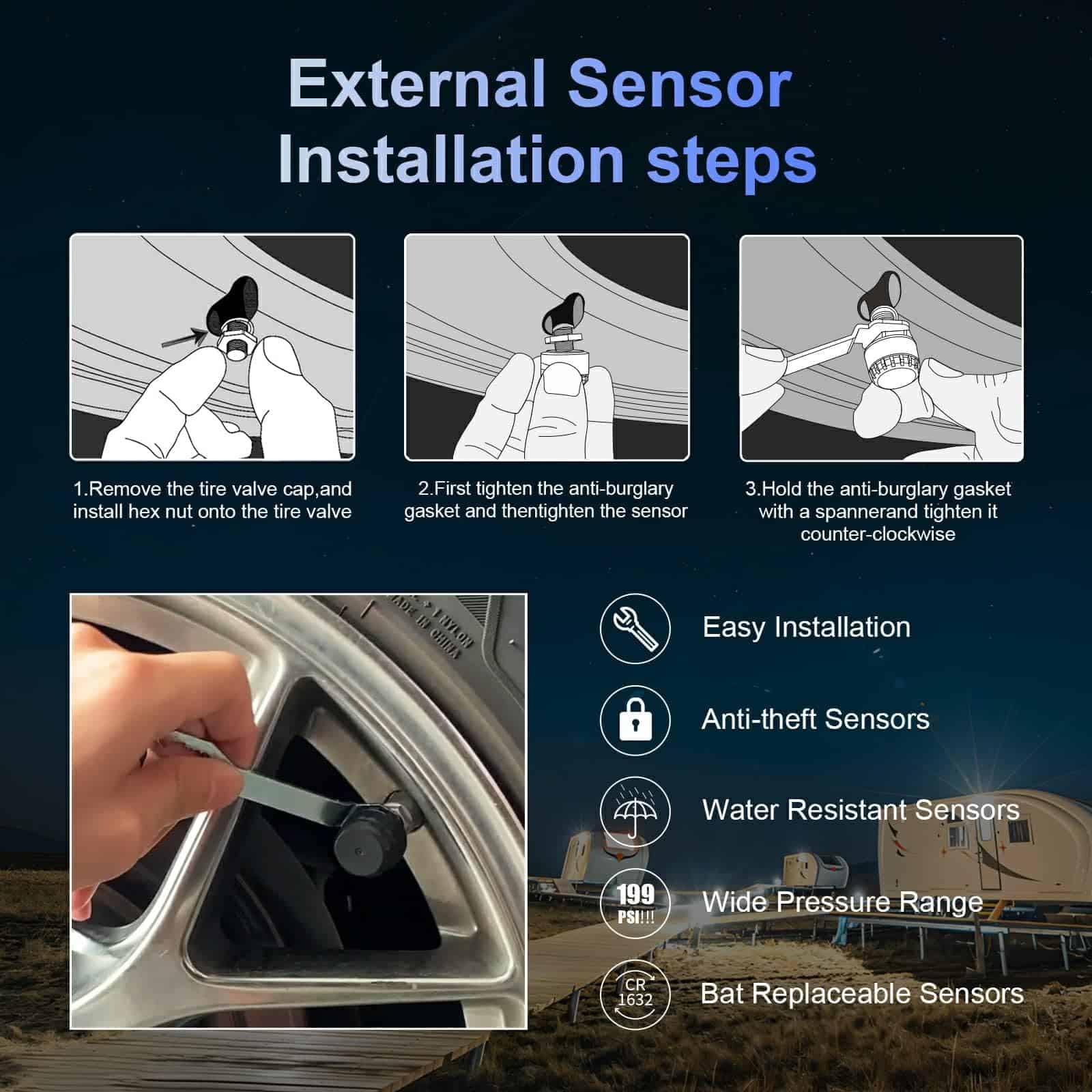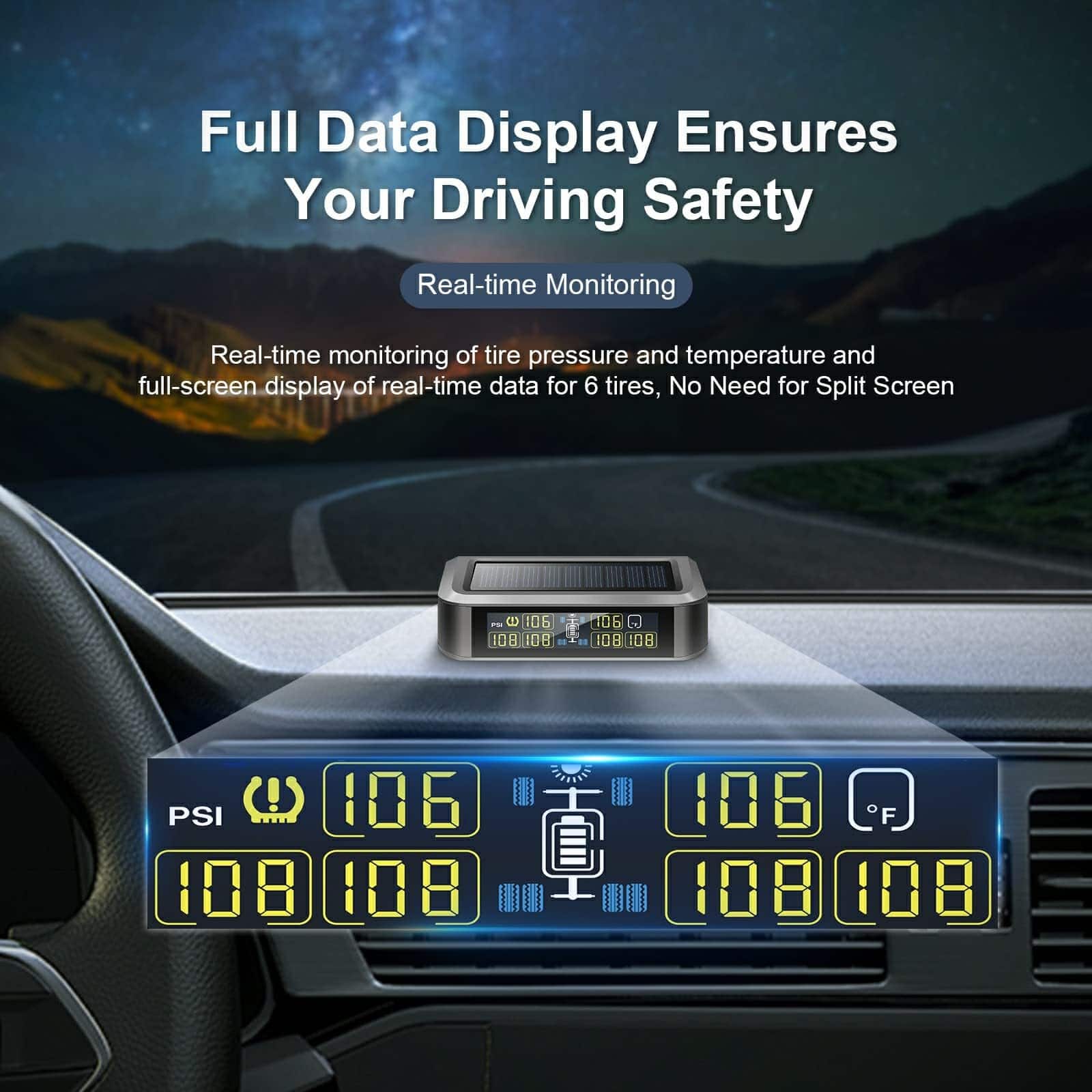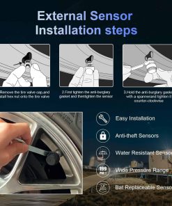 5. Amplia Compatibilidad y Servicio al Cliente Profesional Diseñado para SUV, campistas, RV y varios otros modelos, el TPMS brinda una solución integral de monitoreo de neumáticos. Si encuentras algún problema durante el uso, no dudes en contactar a nuestro equipo de servicio al cliente profesional para recibir asistencia.