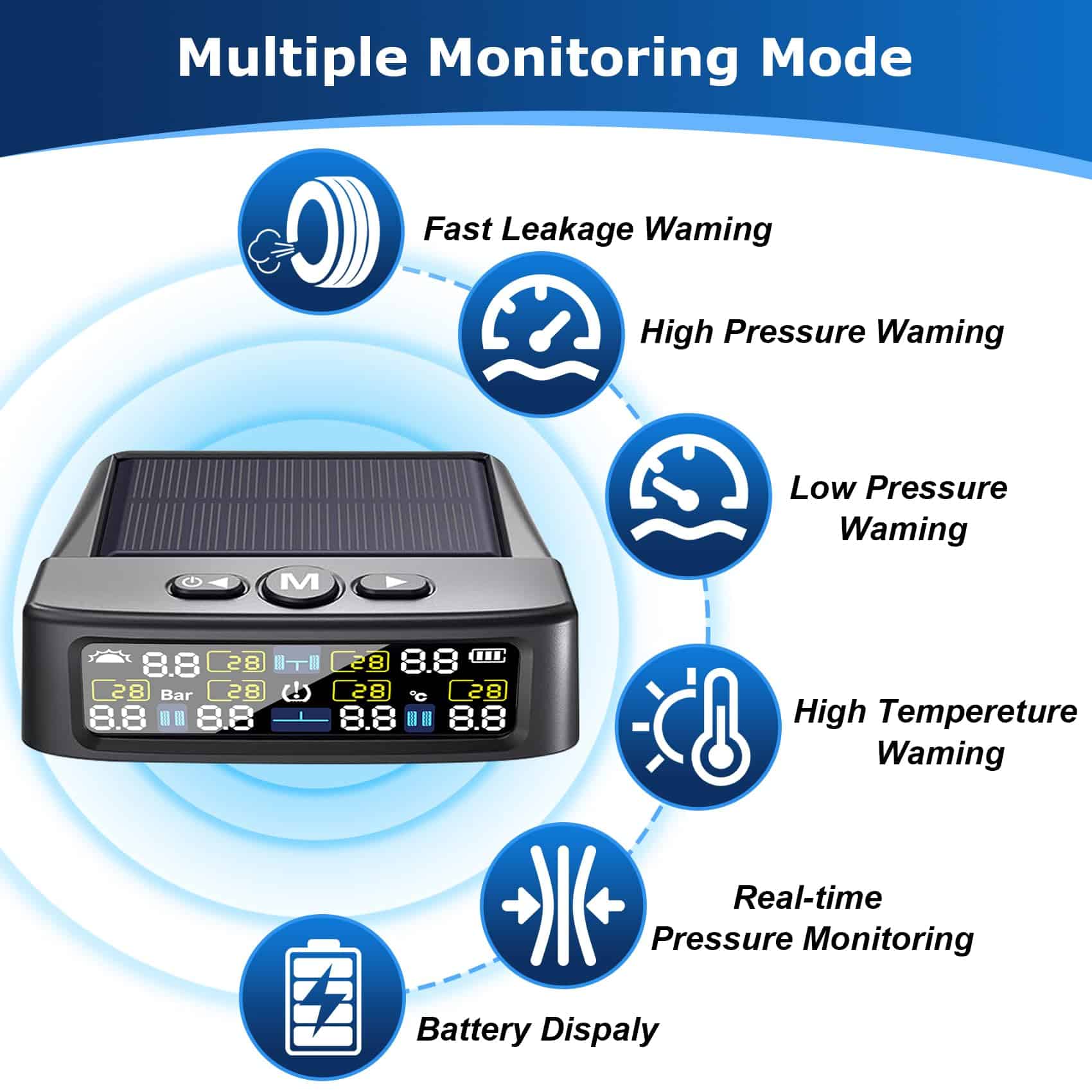 Cargador de energía dual: Solar y USB-C – ¡Nunca se preocupe por quedarse sin batería! El sistema TPMS LETOURWM 2025 New Upgrade está equipado con un panel solar de alta eficiencia para una carga continua bajo la luz solar y un puerto de carga USB-C para energía de respaldo, garantizando un funcionamiento ininterrumpido en cualquier condición climática.