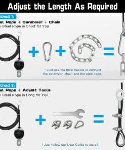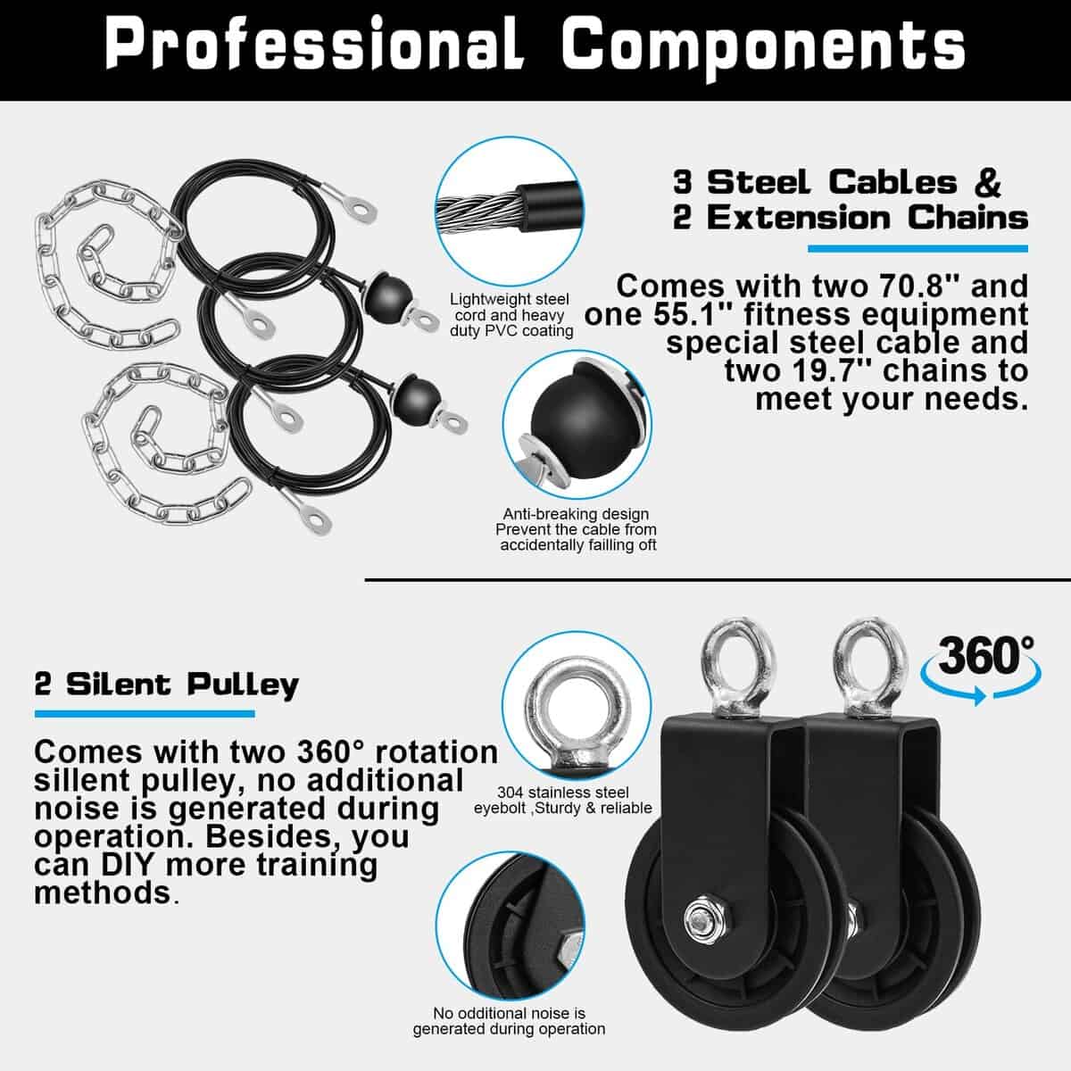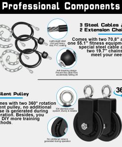 Sistema de poleas con pesas para gimnasio SERTT, accesorios de poleas mejorados para gimnasio LAT Pull Down, Curl de Bíceps, Tríceps, entrenamientos de brazos – Equipo adicional para gimnasio en casa. El kit de Sistema de Poleas SERTT Lat tiene 2 poleas y más accesorios de máquina de cable que otros sets de sistema de poleas de gimnasio, lo que te permite DIY flexible y elegir tu propia forma de hacer varios ejercicios, como Curl de Bíceps, Tríceps Pull Down, Lat Pull Down, Remo, Vuelo, entre otros. Cada accesorio de nuestro sistema de poleas para entrenamiento ha sido cuidadosamente construido y tiene buena calidad, lo que puede soportar sesiones intensas de ejercicio diario. Los materiales de alta resistencia y las soldaduras sólidas mantienen cada parte segura, reduciendo cualquier posibilidad de rotura o deslizamiento. El sistema de poleas para tríceps SERTT se puede conectar fácilmente a las estanterías de pesas, barras de dominadas, vigas y cualquier lugar donde se pueda instalar la correa. Proporciona una gran versatilidad para tus gimnasios en casa, garaje, estudios de entrenamiento, centros de terapia física y diversos entornos de ejercicios. Nuestro Sistema de Cable de Polea de Fitness es muy efectivo para quemar grasa y aumentar la fuerza muscular. También puede ayudarte a mejorar la coordinación, aumentar la resistencia y ejercitar diferentes grupos musculares. Como bíceps, tríceps, hombros, espalda, entre otros. Perfecto para todos, ya sean principiantes o expertos, mujeres u hombres. SERTT se compromete a simplificar tu gimnasio en casa y proporcionar los mejores productos de fitness para el hogar. Todos nuestros productos estarán respaldados por nuestra política de garantía de devolución de dinero sin preguntas de 120 días y garantía de reemplazo de 24 meses, y soporte de servicio técnico 24/7. Si tienes alguna pregunta sobre nuestro sistema de cables de poleas, no dudes en contactarnos, responderemos en un plazo de 12 horas normalmente.
