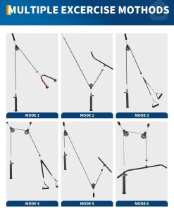 1. Sistema de Poleas con Cable: 10+ ejercicios (jalones de lat, curl, remo, vuelos de cable) con más accesorios. Transforma cualquier espacio en un gimnasio para desarrollar músculos.