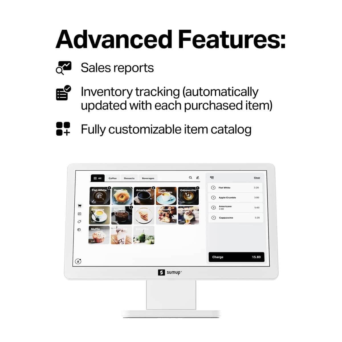 Controla tus ventas, crea catálogos de productos y genera informes con tu tablet POS y el software gratuito integrado.