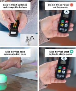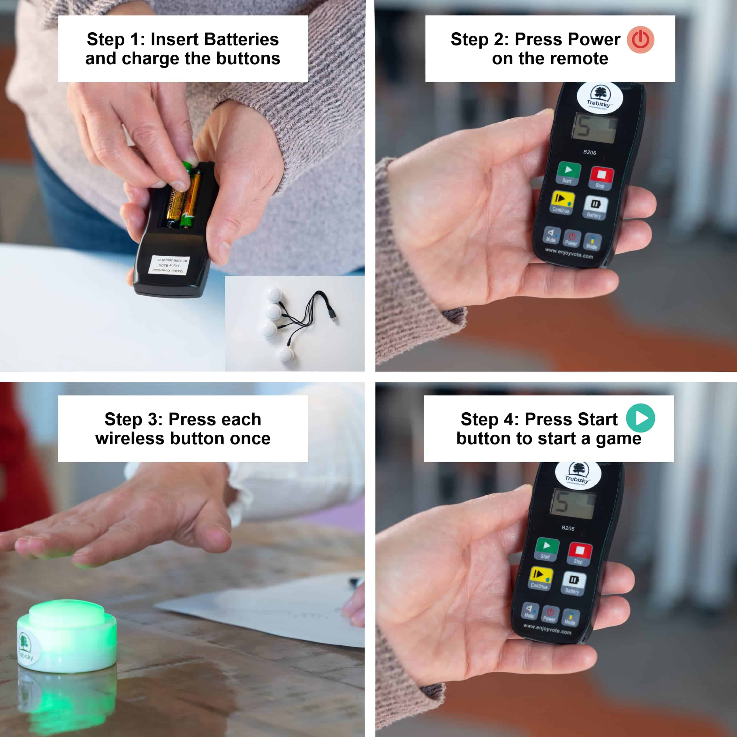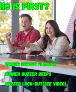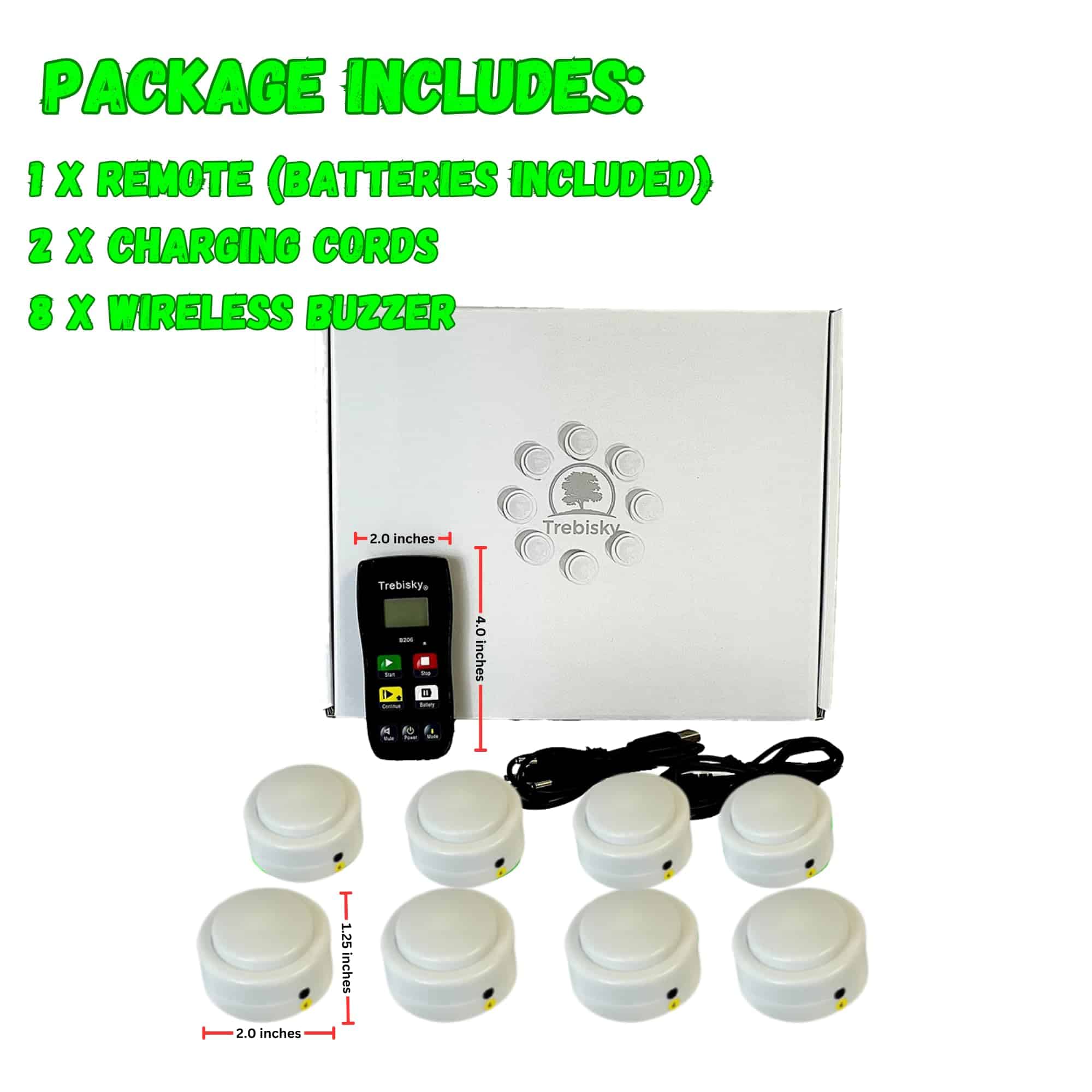 Sistema de timbre inalámbrico Trebisky diseñado para juegos de 8 jugadores como Jeopardy, Quiz Bowl, Feud Familiar, y más. El primer botón presionado parpadeará y sonará, y el número del botón ganador se mostrará en el control remoto para una competición justa. El sistema requiere solo 2 pilas AAA para el control remoto, mientras que los 8 botones de los jugadores tienen baterías recargables incorporadas con un cargador USB incluido para un mantenimiento sencillo. La simplicidad inalámbrica con una consola principal y 8 botones LED inalámbricos permite un alcance máximo de 25 pies, lo que brinda flexibilidad en la ubicación. Los educadores pueden aprovechar este sistema para transformar rápidamente las sesiones de revisión en un quiz interactivo e involucrante para los alumnos. Con posibilidades ilimitadas, este sistema de timbre agrega emoción y competitividad a cualquier juego de trivia estilo concursos.