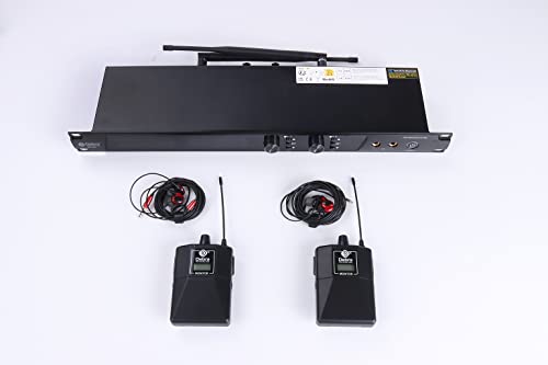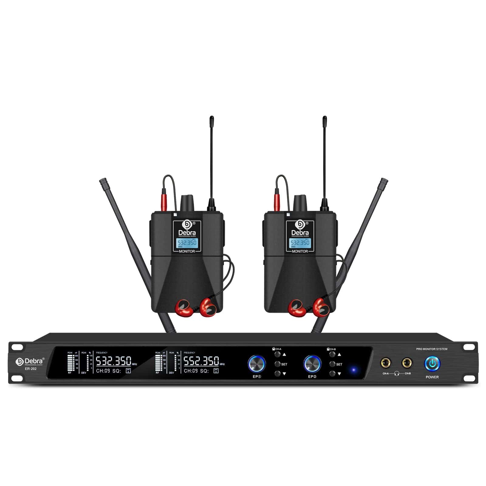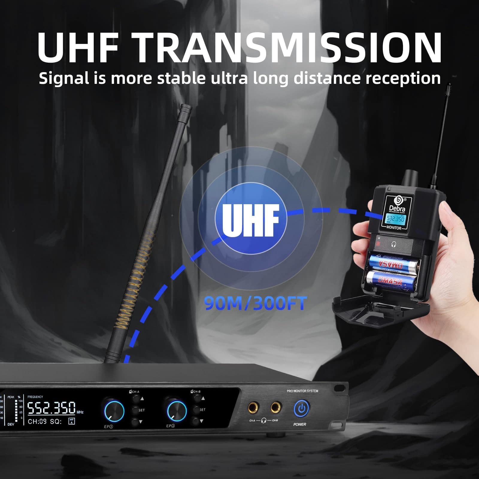 El Sistema de Monitoreo Inalámbrico en el Oído UHF PRO: El nuevo sistema UHF de D Debra Audio con lazo de fase PLL. Utilizando chips IC de alta calidad, mejora el rendimiento general, anti-reducción de frecuencia, anti-frecuencia en serie, tiene una señal más fuerte y estable, mejor relación señal-ruido. El rango de frecuencia es de 510 MHz a 580 MHz. Las 100 frecuencias preestablecidas para cada canal pueden cambiarse a voluntad, lo que puede evitar mejor la interferencia de señal. Adecuado para múltiples lugares: Circuito limitador incorporado que elimina la distorsión a niveles de entrada excesivos. El panel frontal de monitoreo de 1/4 de pulgada tiene el conector para auriculares. El panel trasero tiene entrada mixta de 6.35 y dos interfaces de entrada independientes de canal. Bueno para usar en escenarios, transmisiones, estudios de grabación, músicos, actuaciones de banda. Señal más estable, distancia efectiva más larga: En un escenario despejado sin obstrucciones, la distancia efectiva puede alcanzar los 800 pies. El mejor rango está dentro de 500-600 pies. La buena relación señal-ruido del rango dinámico, la buena anti-interferencia y la reproducción perfecta del sonido original. Diseño de características: El transmisor tiene panel de visualización LCD, pantalla de RF y AF. El receptor está equipado con pantalla LCD, indicador de suministro de energía y recepción de RF. El panel puede monitorear la potencia de la batería.