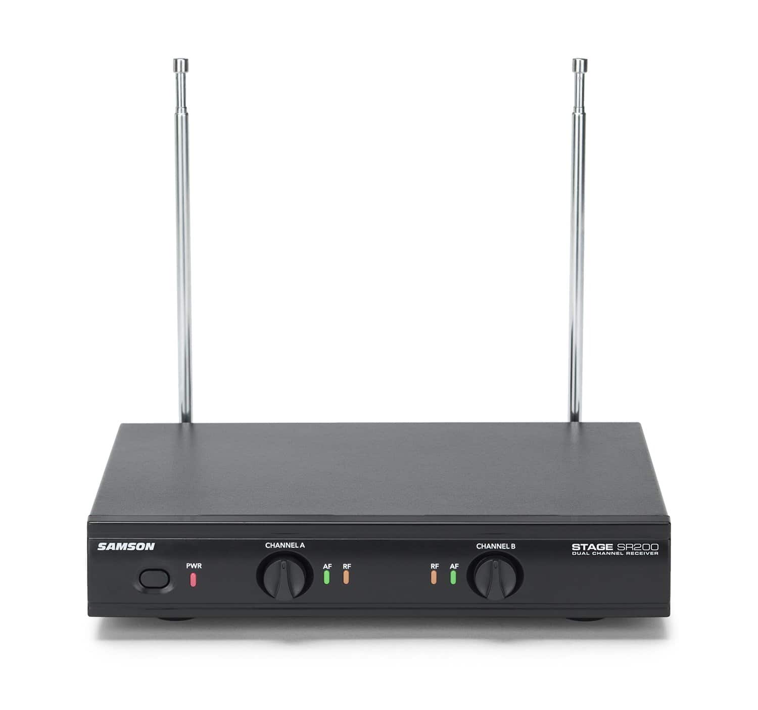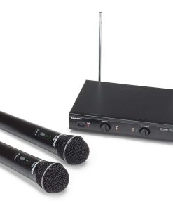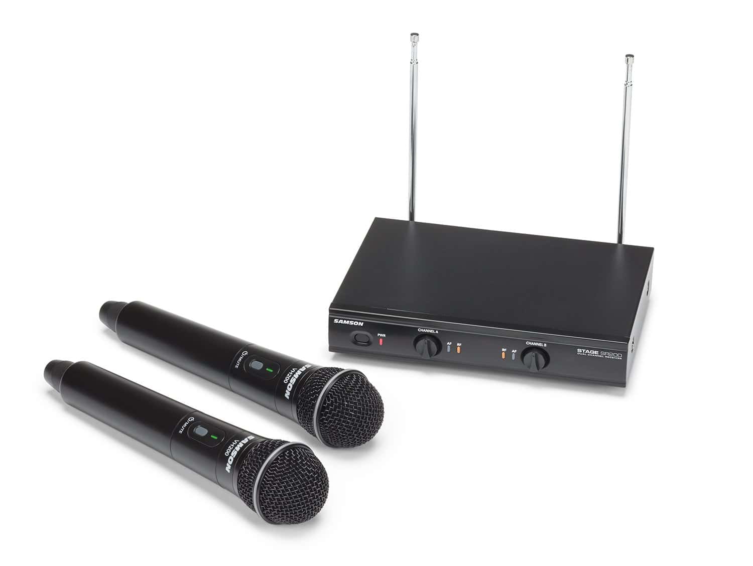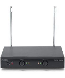 El Stage 200 de Samson es un sistema de micrófono inalámbrico de doble canal que proporciona dos micrófonos dinámicos de mano que transmiten a un único receptor de metal resistente. Cada micrófono de mano cuenta con el elemento de micrófono Q6 de Samson, que brinda un sonido nítido y claro, junto con un rendimiento inalámbrico VHF fiable para karaoke en casa, presentaciones en vivo, educación, lugares de culto y otras aplicaciones para dos intérpretes.