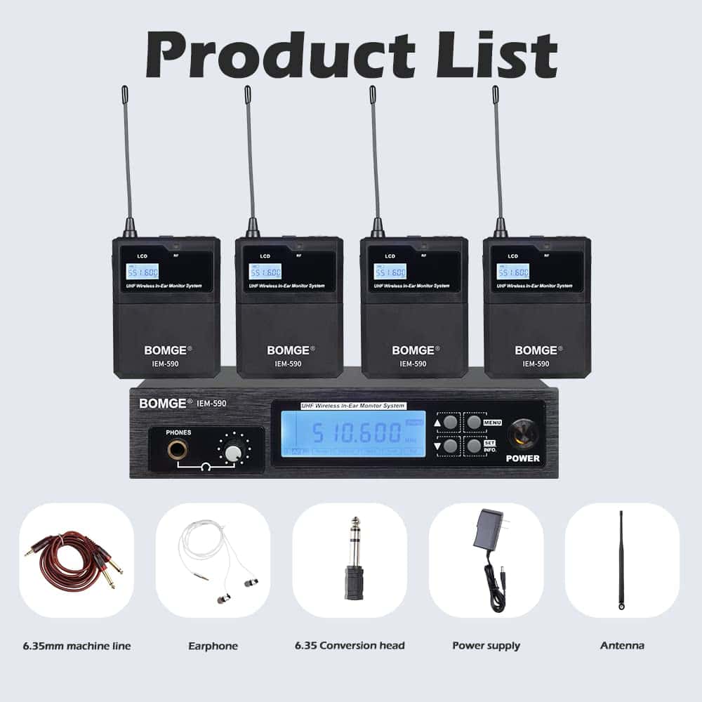 1. RENDIMIENTO INALÁMBRICO: Banda UHF 470-608 MHz, frecuencia fija de 32 MHz, fácil de usar. El sistema inalámbrico permite a los usuarios moverse libremente en el escenario y en el estudio con una distancia de operación de 140 a 160 pies en espacio abierto, línea de visión. 2. UTILIZADO EN ACTUACIONES EN ESCENA Y EMISIÓN DE SONIDO – Circuito limitador integrado que elimina la distorsión bajo niveles de entrada excesivos. El panel frontal de monitoreo estéreo de 1/4 de pulgada tiene el conector para auriculares. Utilizado en escenario, puede reemplazar el equipo tradicional de monitoreo de sonido complejo, lograr un efecto de escucha admirable. 3. Circuito de expansión dinámica, mejora en gran medida la relación señal-ruido. Pantalla LED simple, diseño completamente nuevo. 4. Receptor y transmisor: indicador de bajo consumo de energía y luz indicadora de recepción de RF. Necesita dos pilas AA y circuito de energía eficiente, larga duración (no incluido en el paquete). Transmisor con salida de auriculares de 6,35 mm, luz indicadora de señal AF, con conector de balanceado y desbalanceado. 5. Lo que obtienes: 1 transmisor inalámbrico UHF, 4 receptores de bodypack, 4 auriculares intrauditivos, 1 adaptador de corriente, 1 antena, 2 cables de 6,5 mm a 6,35 mm, 1 manual de usuario. 6. Uso versátil: Este sistema inalámbrico de monitoreo intrauditivo UHF es ideal para grabaciones de estudio, actuaciones en escenario, exposiciones, discursos, conferencias, instrucción, etc. Los bastidores metálicos gratuitos pueden montar el sistema en un rack para un uso profesional.