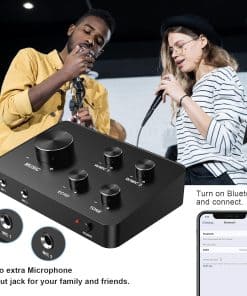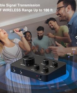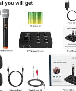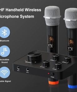 1. Sistema de Micrófono Inalámbrico Este mezclador de karaoke incluye 2 micrófonos inalámbricos de mano y 2 entradas de micrófono con cable. Puede conectar micrófonos con cable adicionales si es necesario. Control de volumen separado para cada micrófono inalámbrico.