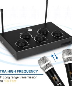 El sistema de micrófono inalámbrico también es un mezclador de sonido equipado con controles de ajuste giratorio que le permiten ajustar fácilmente el eco, tono y volumen de los micrófonos y la música al nivel deseado. Viene con Ultra High Frequency (UHF) que es menos probable que esté sujeto a interferencias de otros equipos. Tiene 16 frecuencias seleccionables y cumple con las últimas regulaciones de la FCC. Ofrece una calidad de sonido excelente y un rango de operación de hasta 100 pies en línea de visión. Perfecto para karaoke, música de DJ y fiestas en casa. El receptor tiene conectores de entrada 3.5mm (1/8 ) TRS/Optical/Coaxial y conectores de salida para una fácil configuración con su sistema de cine en casa o altavoz. Compatible con una variedad de dispositivos, incluidos TV, smart TV, reproductor de Blu-ray, portátil, iPad, tableta, sistema de cine en casa, receptor y altavoz, entre otros.