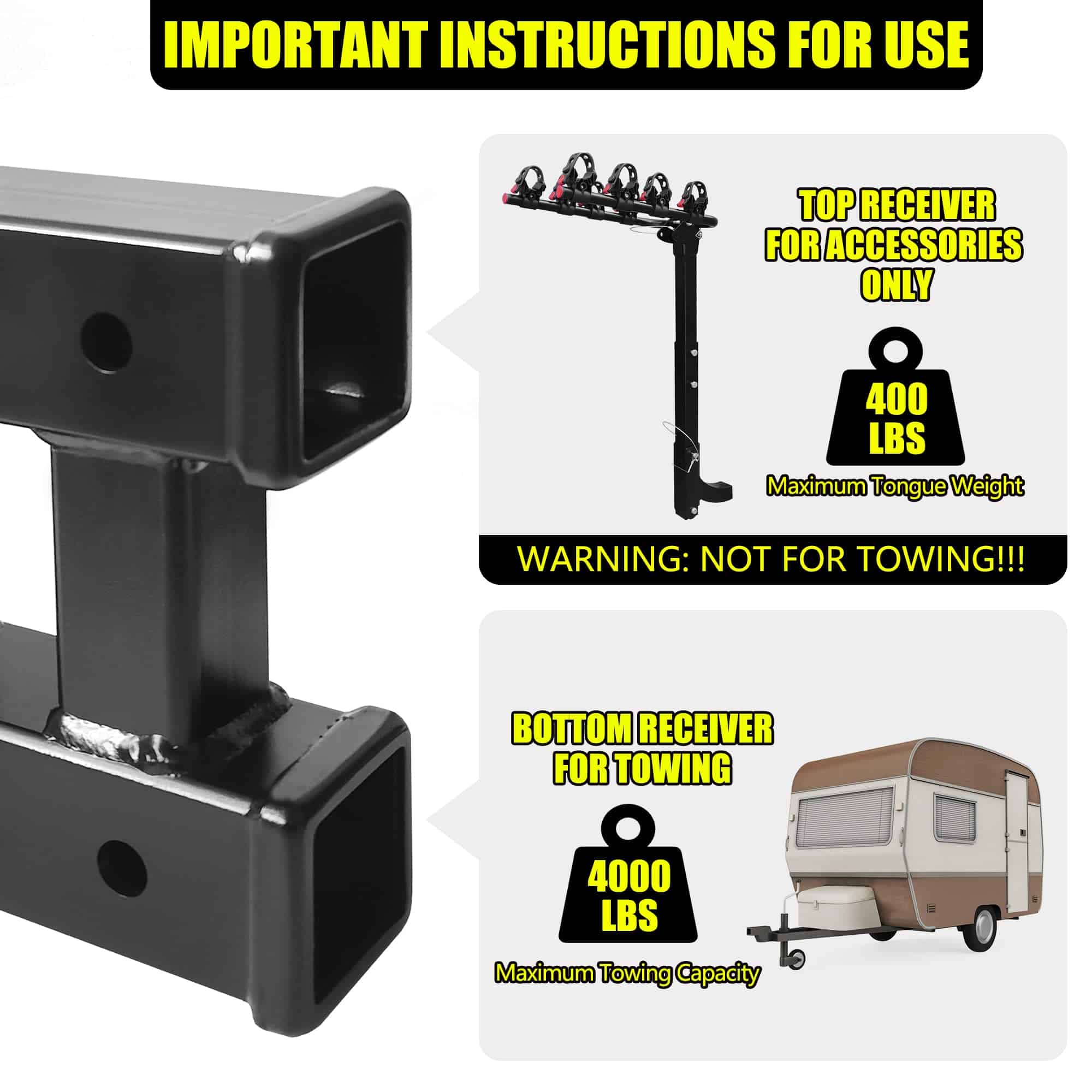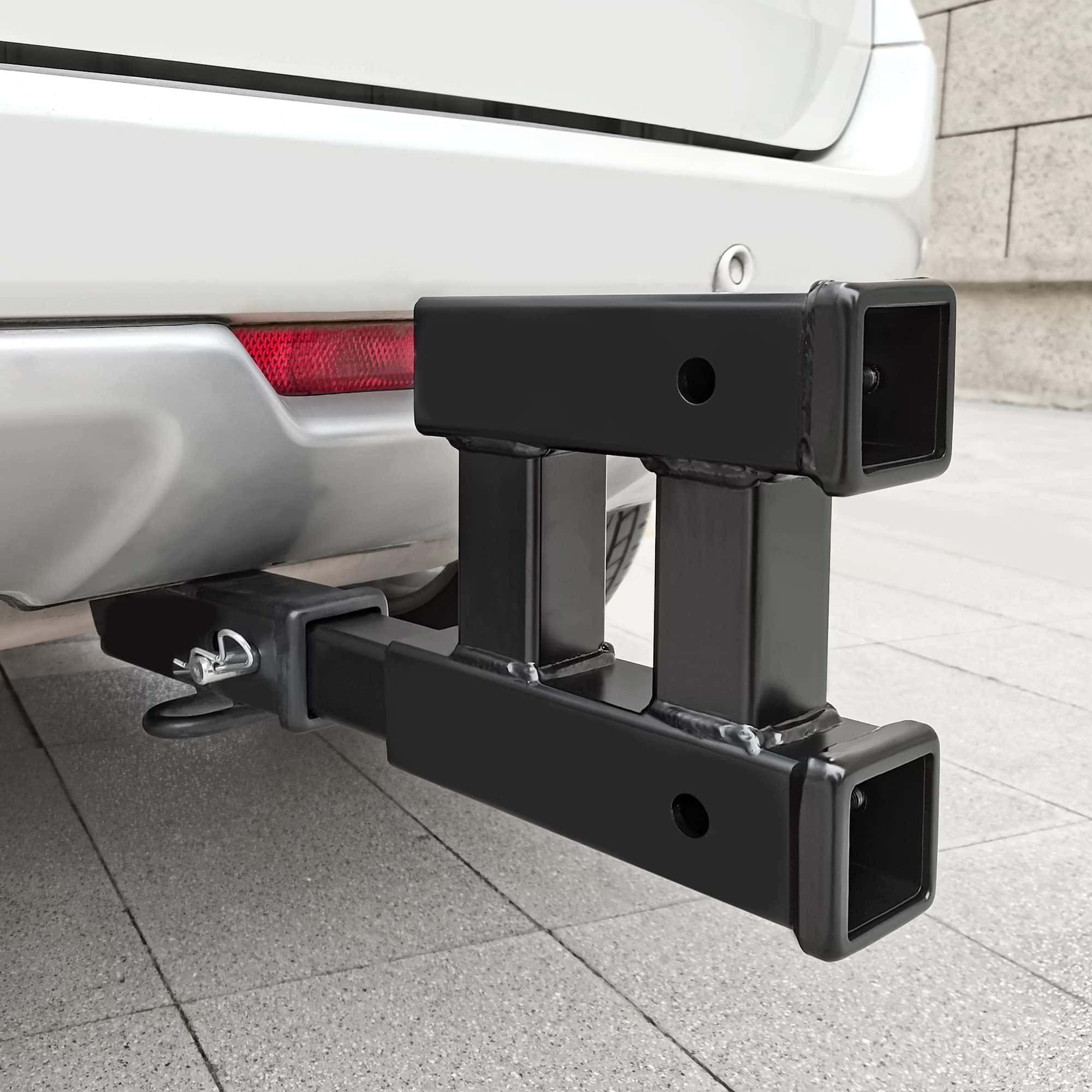1. COMPATIBILIDAD: El extensor de receptor doble se ajusta a receptores estándar de 2″ clase III y clase IV, utiliza un pasador de 5/8″ de receptor para conectar a su vehículo, convierte un solo receptor en dos y le permite remolcar un remolque mientras usa sus accesorios de montaje en el receptor como portabicicletas, portaequipajes y racks.