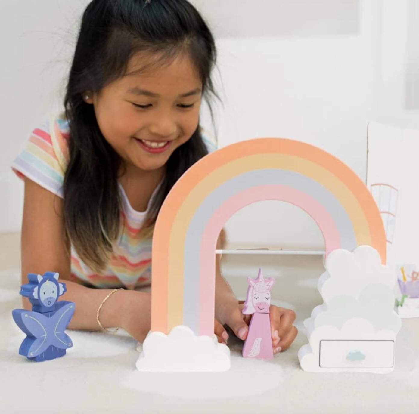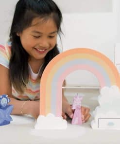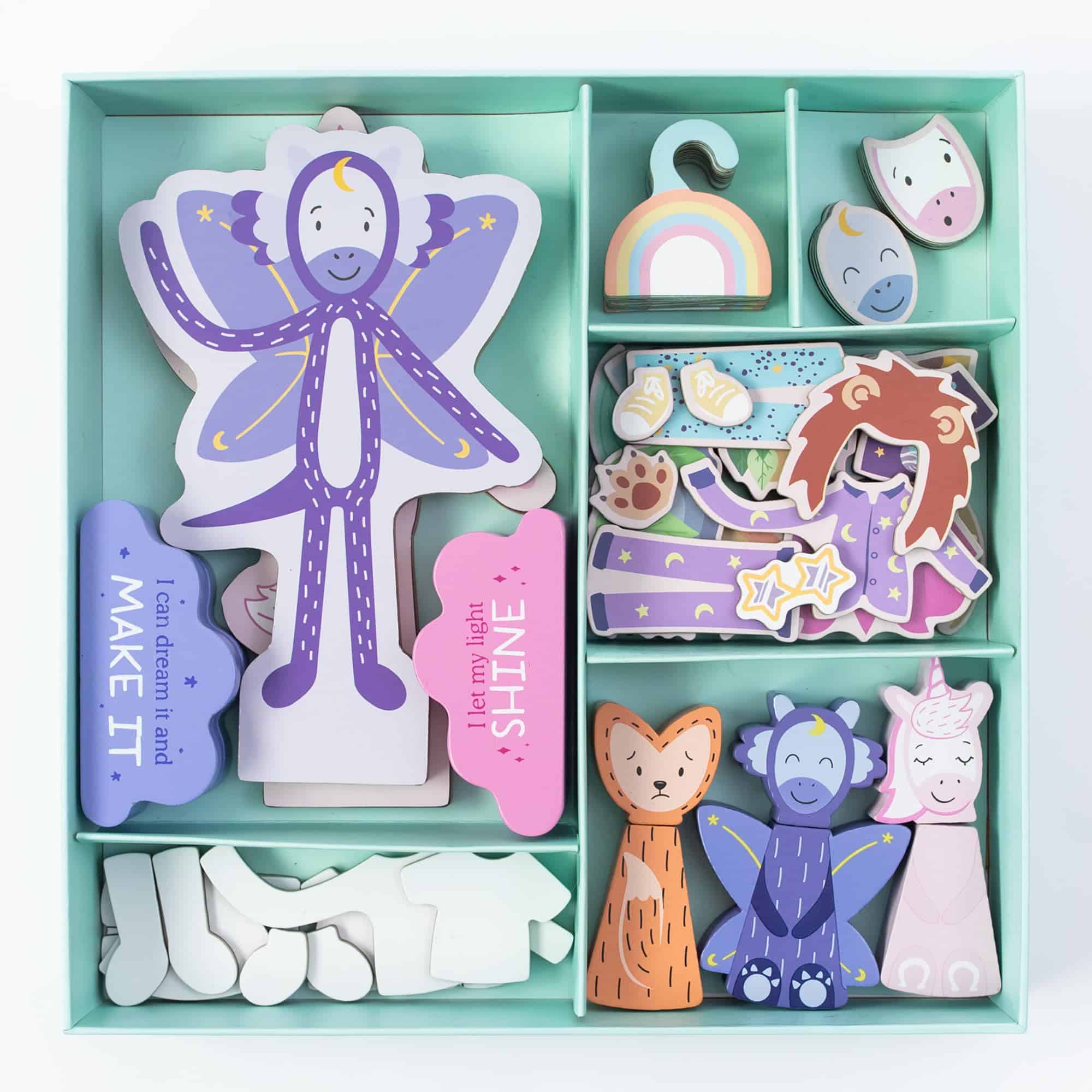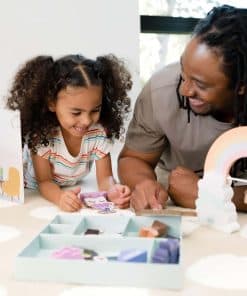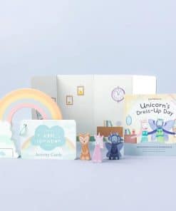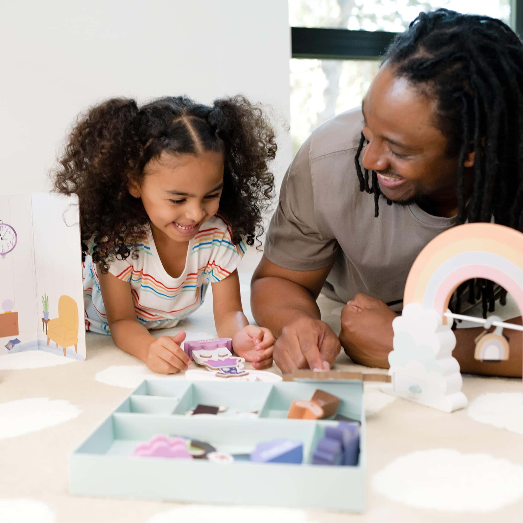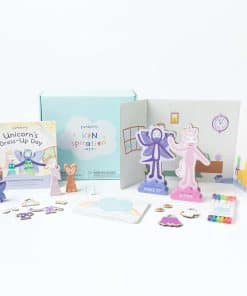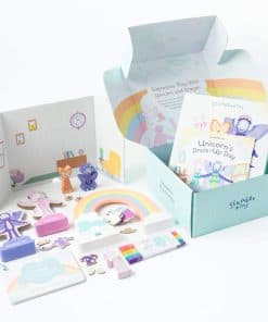 2. Cada Kit de Inspiración Incluye un Libro de Cuentos infundido con aprendizaje socioemocional, elementos de construcción mundial que preparan el escenario para la aventura, juguetes creados con la intención de inspirar la imaginación y tarjetas de actividades que fomentan el juego independiente y la conexión.