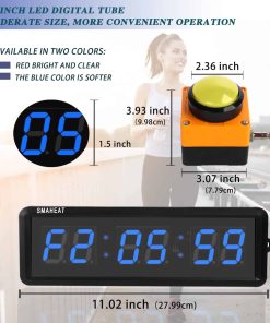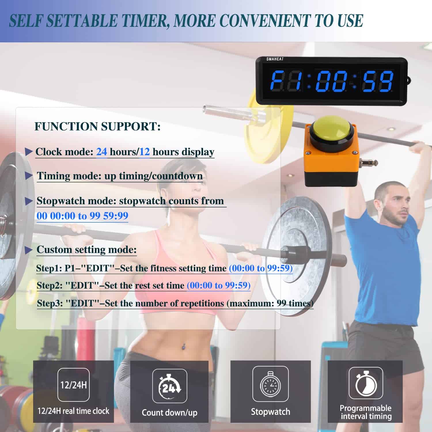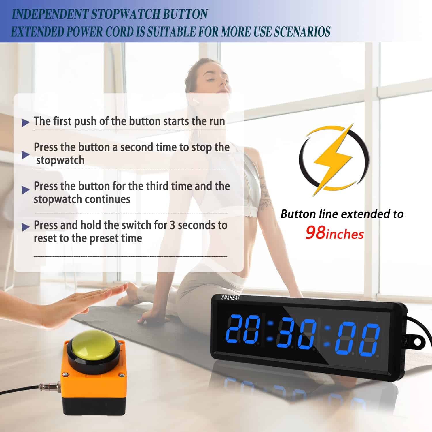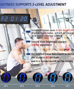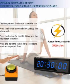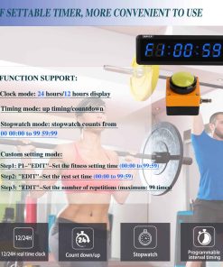 1. Cronómetro de intervalos: cronómetro multifunción actualizado, compatible con reloj en tiempo real de 12 horas y 24 horas, cuenta regresiva, cronometraje, cronómetro, modo de intervalo personalizado y equipado con botón de interruptor cronómetro. El cable de alimentación externo se extiende a 98 pulgadas (250CM), adecuado para más escenarios. 2. Programación de temporizador de intervalos: la función de programación de temporizador guarda hasta 10 programas personalizados, P0-P10 en el reloj de intervalos, cada uno con 9 intervalos personalizados (de F1 MM: SS C1 MM: SS a F9 MM: SS C9 MM: SS), puede admitir hasta 99 rondas, configurar fácilmente el tiempo, intervalo, repeticiones, tiempo de descanso a través del botón de control remoto, recordar los números y programas correspondientes, ingresar al entrenamiento de recuperación con una tecla y facilitar el entrenamiento grupal. 3. Configuración de temporización: temporizador/cuenta regresiva hasta 99:59:59, cronómetro hasta 99:59:59, inicio/fin a través del control remoto, botón de interruptor completamente con cable: el tiempo primero presiona el botón se presiona para iniciar la ejecución, la segunda vez presiona el botón detener ejecutar, presionar el botón una tercera vez para continuar. Botón Presione y mantenga presionado durante 3 segundos para restablecer al tiempo preestablecido. 4. Ajuste de brillo y zumbador: el cronómetro de fitness es una pantalla LED ultra brillante de 1.5 pulgadas de alto Carácter. La carcasa está hecha de aleación de aluminio, que es muy ligera y duradera. Las dimensiones son 11 (ancho) x 3.55 (alto) x 1.4 (profundidad). El brillo digital se puede ajustar en 5 niveles, y el zumbador te recuerda que inicies o termines el sonido del dispositivo (presionando la tecla M8 una vez hará sonar el zumbador una vez), indicando que el sonido se ha apagado. Presionar la tecla M8 nuevamente hará sonar el zumbador tres veces, indicando que el sonido del zumbador se ha encendido). 5. Contáctenos: el cronómetro de fitness requiere alimentación de 5V DC o 6V DC. El paquete del producto incluye un adaptador de corriente de entrada 100-240VAC salida 6VDC, así como un soporte en forma de anillo y soporte para la instalación. Viene con un control remoto. La batería del control remoto es de 2xAAA (no incluye la batería). Este cronómetro solo puede ser controlado por el control remoto o el botón de control. Por favor, guarde las propiedades del control remoto.