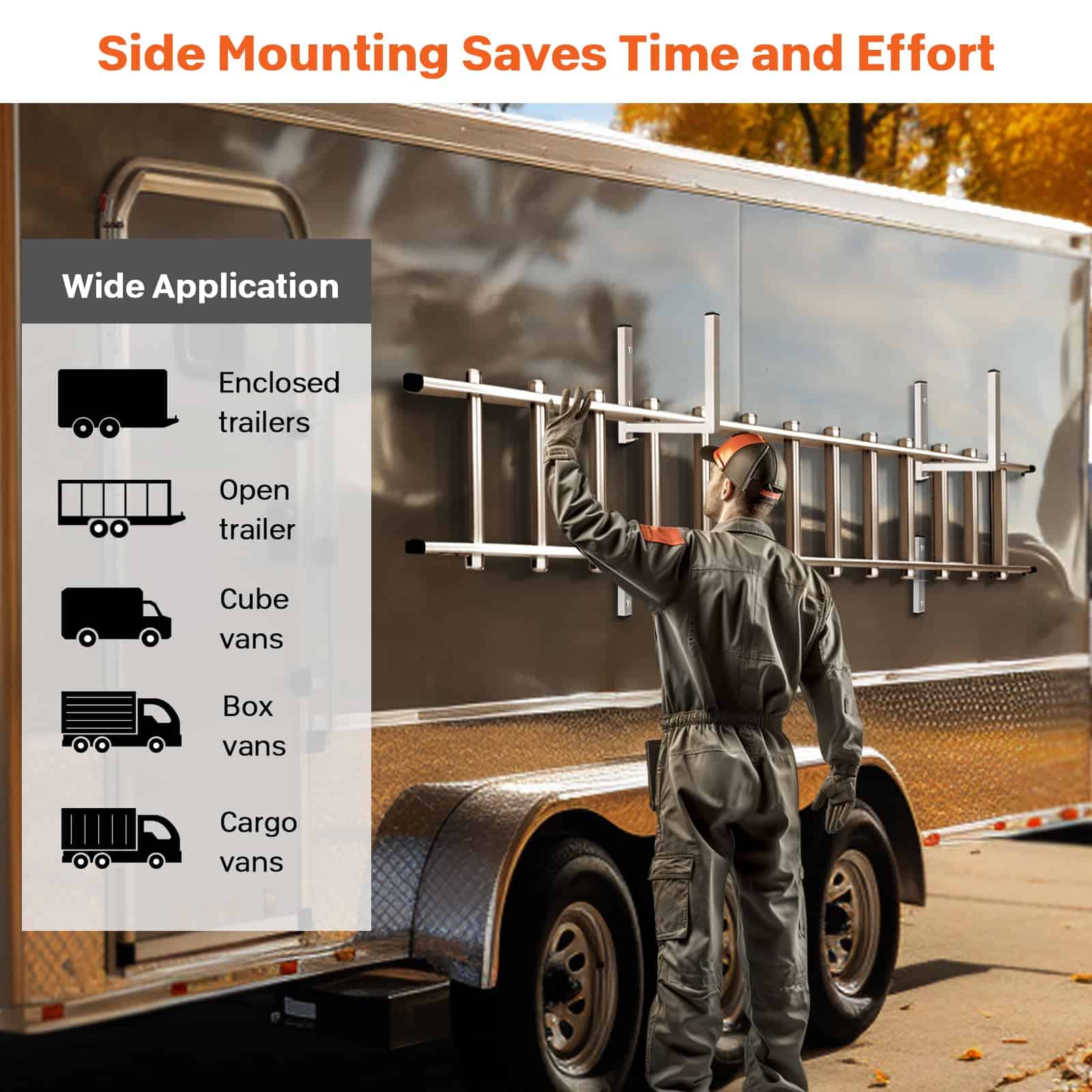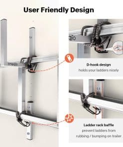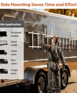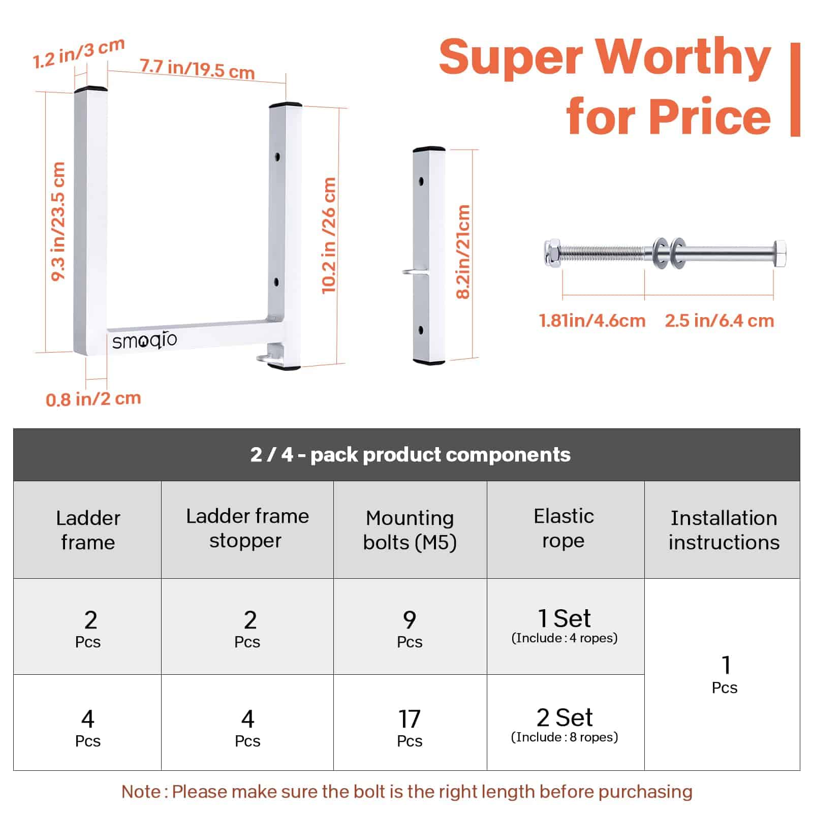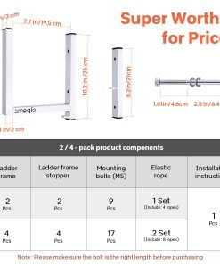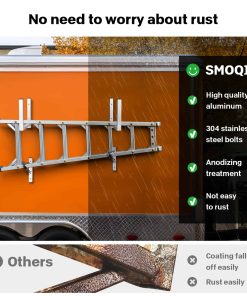 SMOQIO Soporte para Escalera de Remolque, 2 Soportes de Escalera de Aluminio para Remolque montados en el Lado con Capacidad de 200 lbs, Soporte de Escalera para Remolque Cerrado con Buffle y Gancho en D para Pared Lateral. El soporte para escalera de remolque SMOQIO está hecho de aluminio de alta calidad, ligero y sin carga. Superficie oxidada con una fuerte resistencia a la abrasión y la corrosión; Los pernos semitroquelados (no enroscados 2.5 pulgadas/6.4 cm, enroscados 1.8 pulgadas/4.6 cm) de las piezas de repuesto están hechos de acero inoxidable 304, que es resistente y a prueba de corrosión. ¡No habrá colores de óxido desagradables en tu remolque incluso después de la lluvia!. Los soportes de escalera para remolque de SMOQIO se sueldan finamente para garantizar la estabilidad y resistencia de la estructura de carga. Capacidad de carga de 200 lb para soportes dobles para cumplir con tus necesidades básicas de carga. El soporte para escalera de remolque cerrado de SMOQIO está equipado con un diseño de gancho D: te proporciona un punto de hebilla, que te ayuda a fijar y bloquear tu escalera de forma conveniente. Viene con una guía de instrucciones detallada, lo que facilita tu instalación. Proporciona dos opciones de ensamblaje de 2 soportes y 4 soportes. Elige según la cantidad y el tipo de escaleras que tengas: flexible de instalar, libre de combinar. Usando las tiras de bafle y cuerdas elásticas, la escalera puede fijarse bien y evitar que la escalera roce y golpee el remolque. El soporte para escalera de remolque de SMOQIO para remolques cerrados, método de instalación de montaje lateral adecuado para carga de escaleras exteriores o interiores en la mayoría de los remolques cerrados y parcialmente abiertos (donde la altura de los montantes de la pared es suficiente) – Es fácil de alcanzar cuando lo necesitas. ¡Ahorro de esfuerzo y tiempo extra, mejora tu rendimiento de instalación y completa tu misión de trabajo con anticipación!