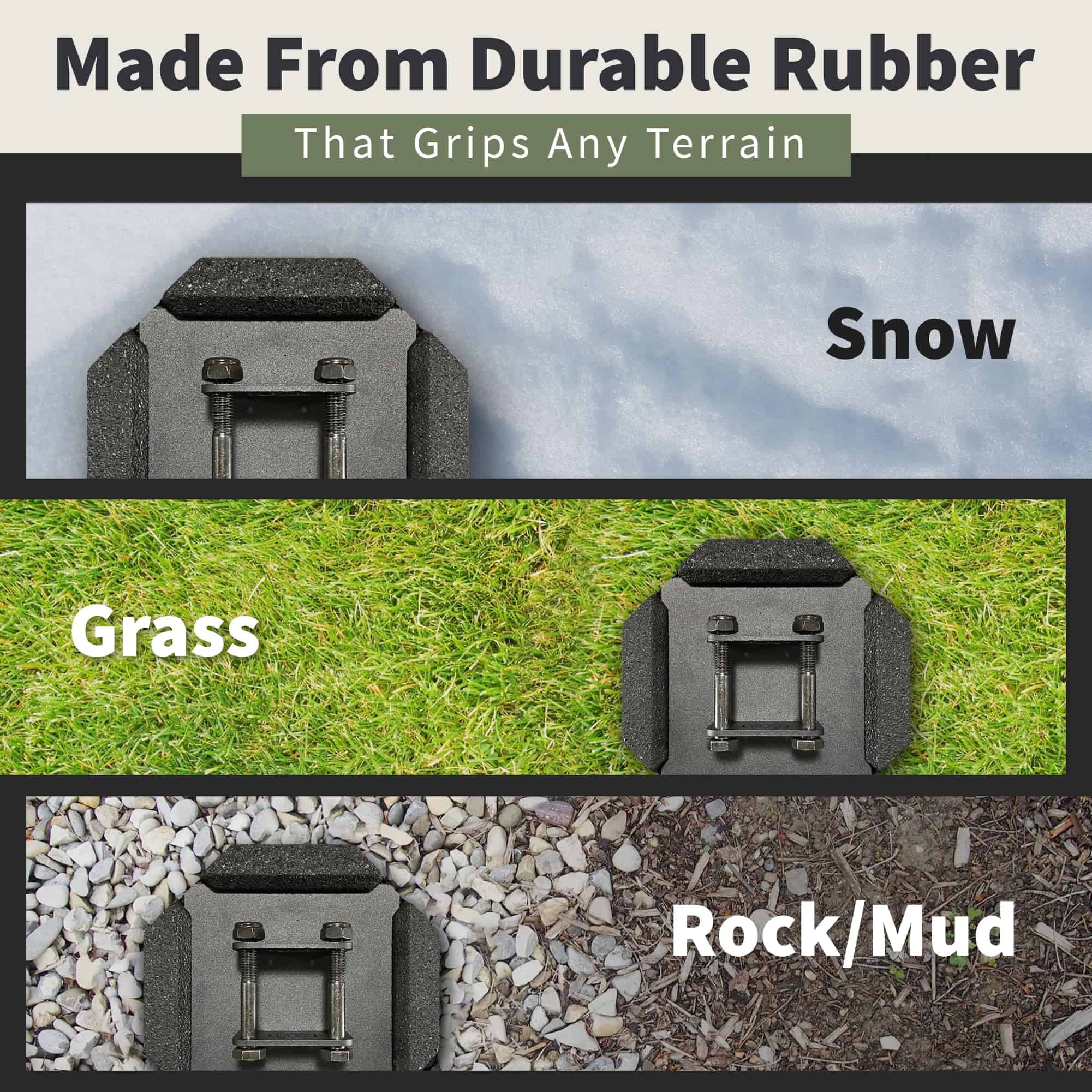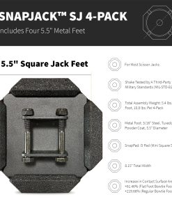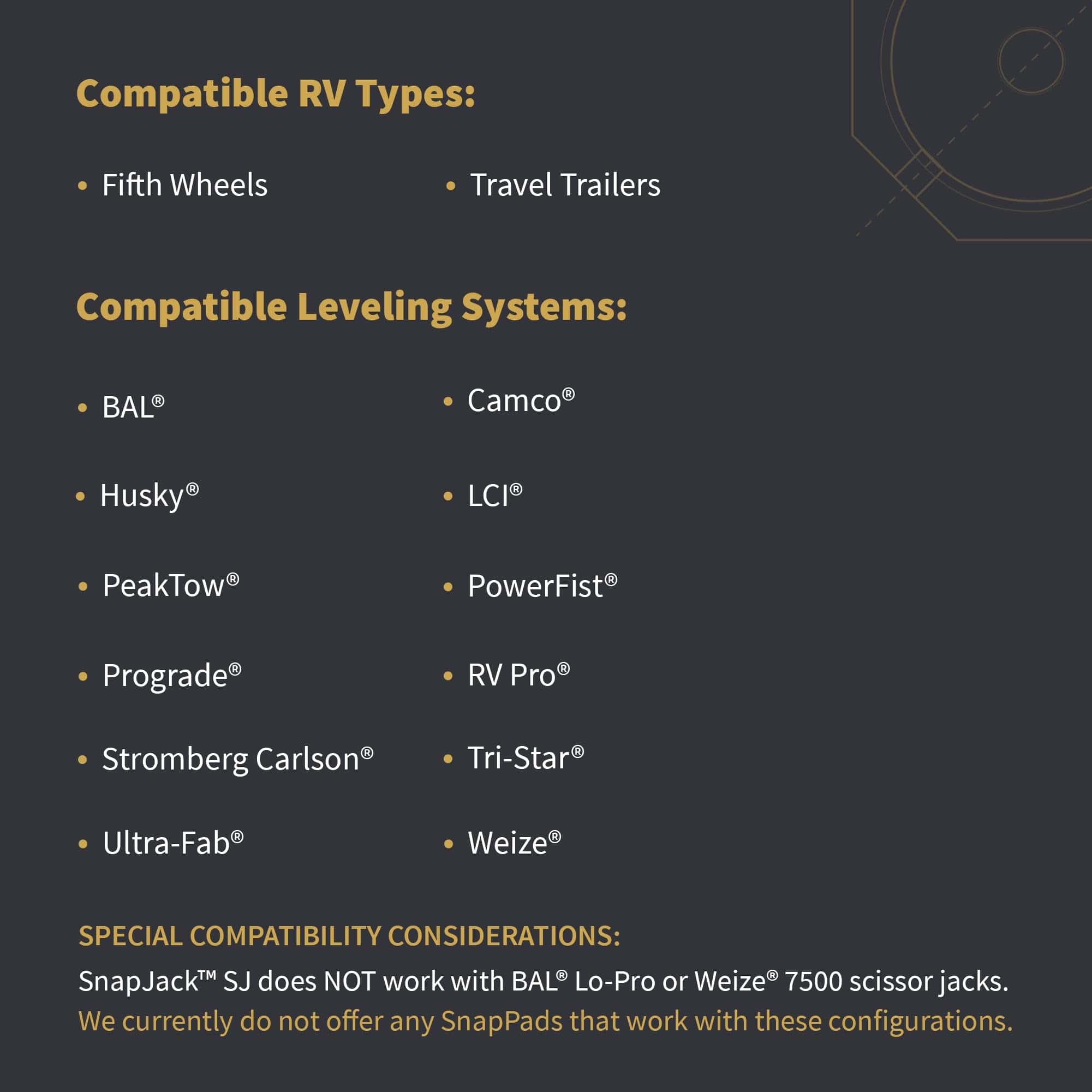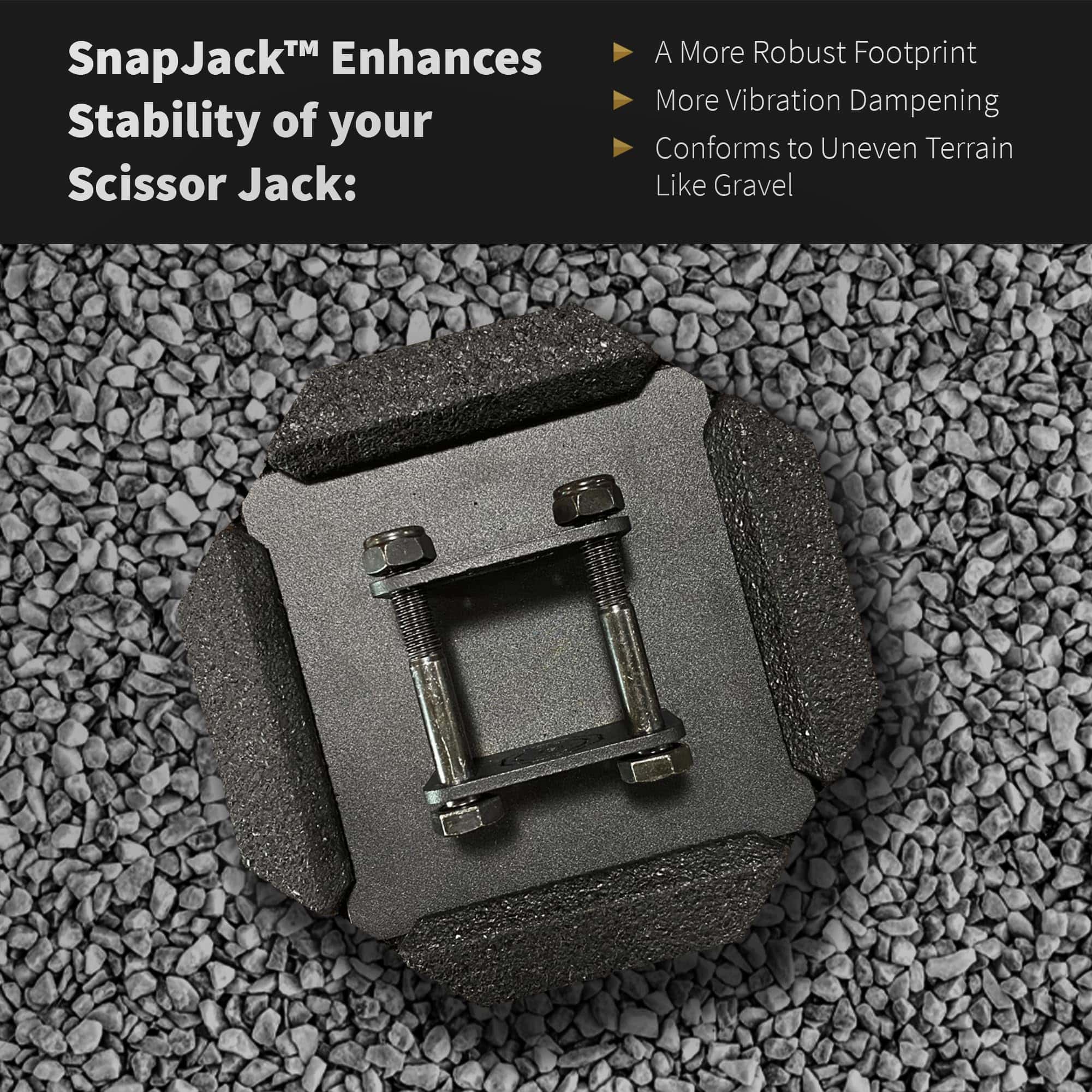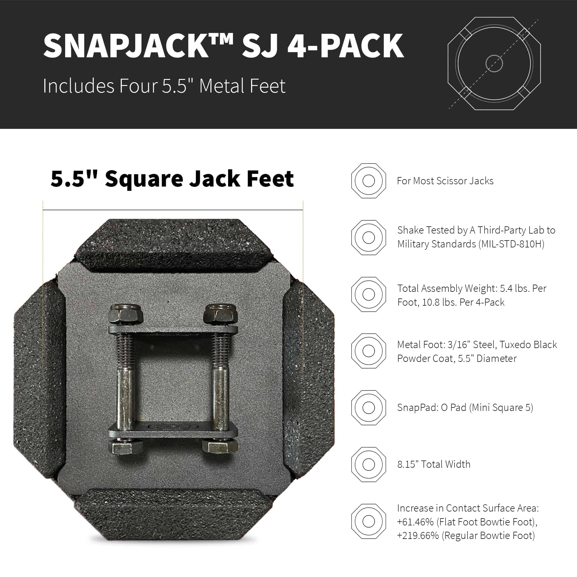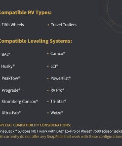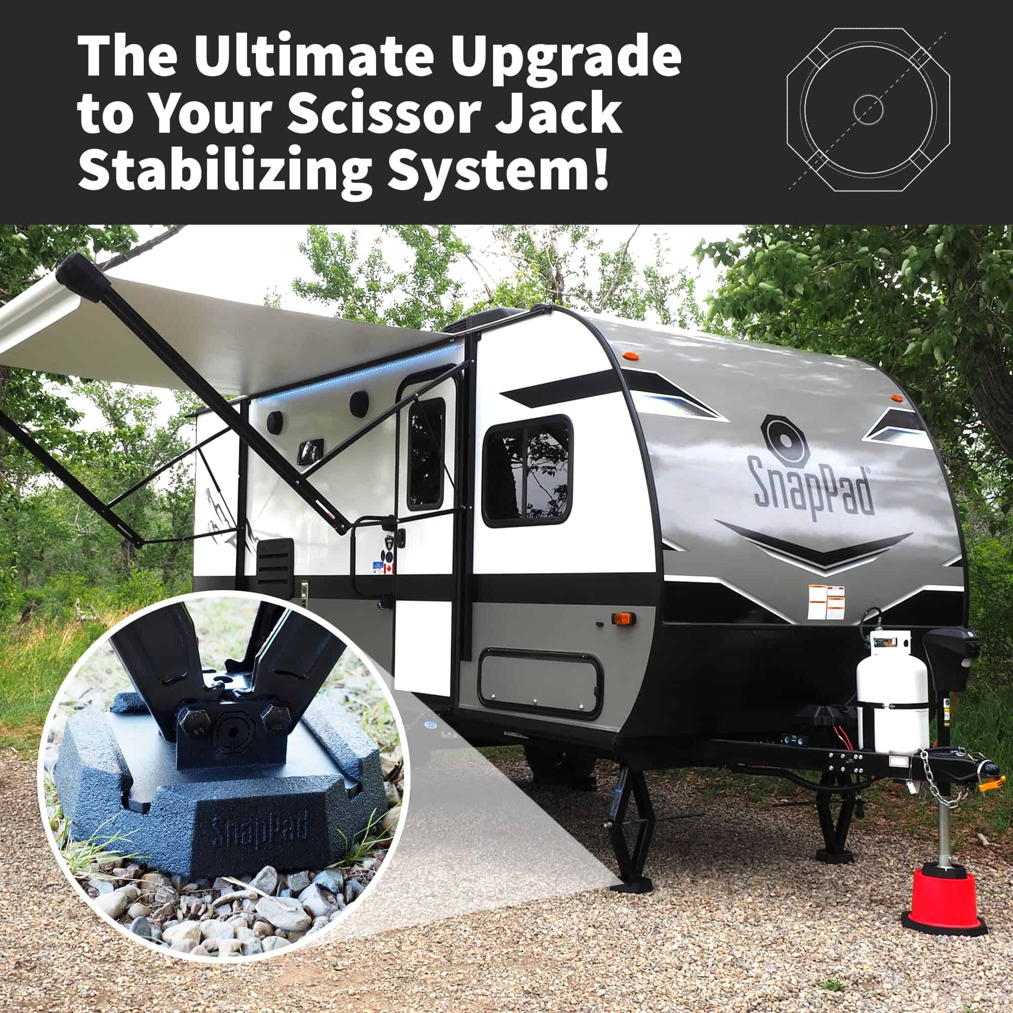 La Actualización Definitiva para su Sistema de Estabilización de Gato de Tijera y Accesorios Esenciales para Remolques de Viaje. Ahora puede llevar su configuración de nivelación de promedio a increíble con estos accesorios para RV para exteriores. SnapJack SJ es un kit de nivelación de gato de tijera para RV que reemplaza su pie estándar con un gato de metal premium y un SnapPad preinstalado. No se preocupe, su kit también incluye todos los tornillos que necesita para hacer el cambio (fácilmente). Amplíe su huella en al menos un 61% (y hasta un 219%) sobre su pie de fábrica de triángulo y obtenga todos los beneficios clásicos de SnapPad para su equipo con estos accesorios para viajes en casas rodantes – más estabilidad, más conveniencia, más agarre y menos desplazamiento o hundimiento en terrenos inciertos. Actualice sus gatos estabilizadores y de tijera RV con unos nuevos «zapatos elegantes» y haga que la configuración sea más segura y fácil que nunca antes. Consideraciones Especiales: Tenga en cuenta: las versiones actuales de las almohadillas de gato SnapJack SJ NO funcionan con los Gatos de Tijera BAL LoPro. Si no está seguro de si sus gatos de tijera funcionarán para su equipo, visite nuestra página de Contacto. Funciona con la mayoría de las marcas de gatos de tijera Área de superficie aumentada de al menos un 61% y hasta un 219% SnapPad hecho de caucho reciclado americano Pie de metal personalizado hecho en EEUU Características del Producto de los niveladores de RV SnapPad SnapJack SJ: Para una amplia variedad de marcas de gatos de tijera Verificado por un laboratorio de terceros para pruebas de vibración según normas militares (MIL-STD-810H) Peso total del conjunto: 5.4 libras por pie, 10.8 libras por paquete de 2 pies Pie de metal: acero de 3/16″, recubrimiento en polvo negro tuxedo, diámetro de 5,5″ SnapPad: O Pad (Mini Cuadrado 5) 8.15″ de ancho total Clase métrica 8.8, tuerca de bloqueo con inserción de nylon, M8x1.25, negro Clase métrica 8.8, tornillo/bulón de cabeza hexagonal de acero, M8x1.25, roscado parcialmente, 65mm, negro Aumento en el área de contacto: +61.46% (pie de triángulo plano), +219.66% (pie de triángulo regular) Tipos de RV Compatibles: Casas Quinta Ruedas Casas Rodantes Marcas de Gatos de Tijera Compatibles: BAL Camco Husky LCI PeakTow PowerFist Prograde RV Pro Stromberg Car