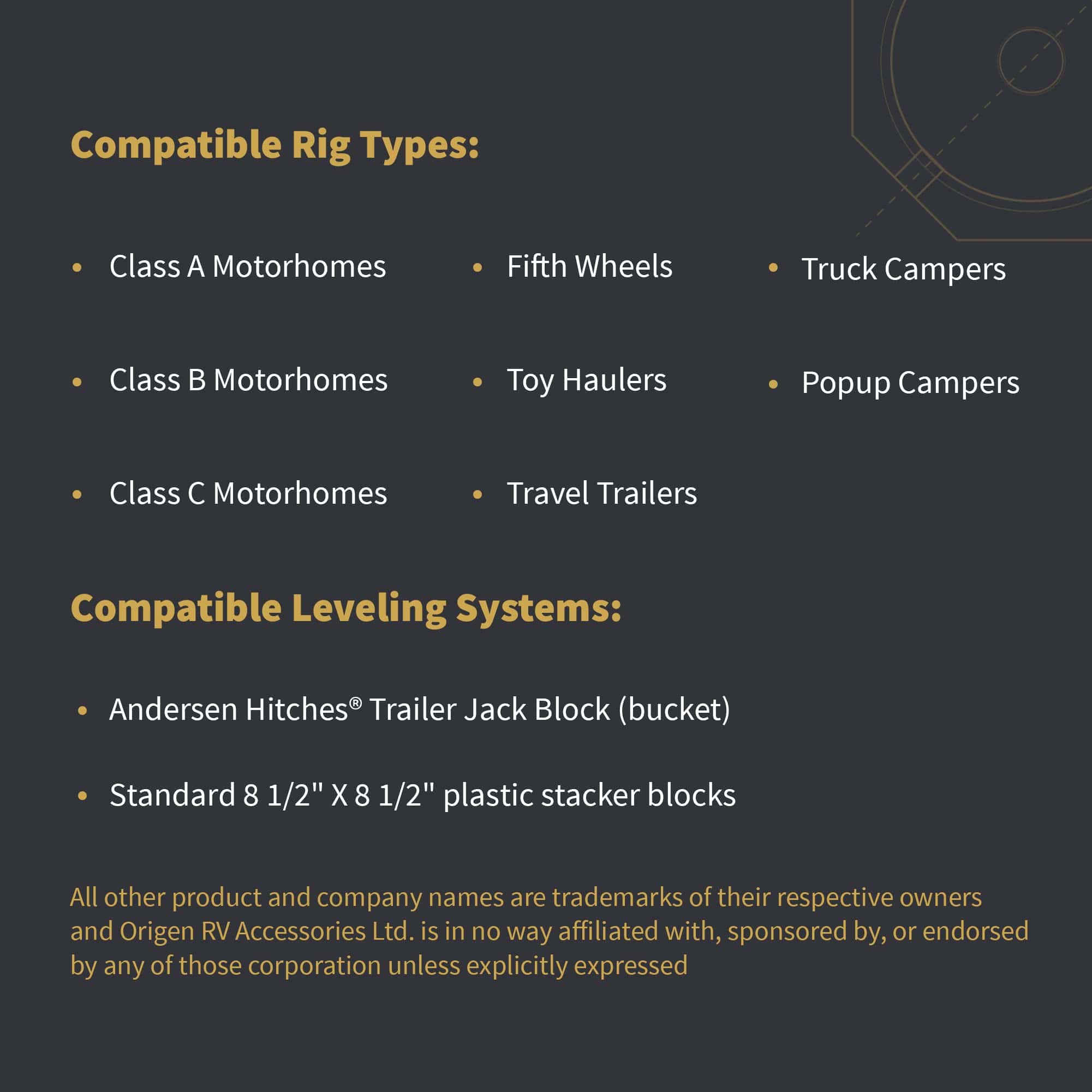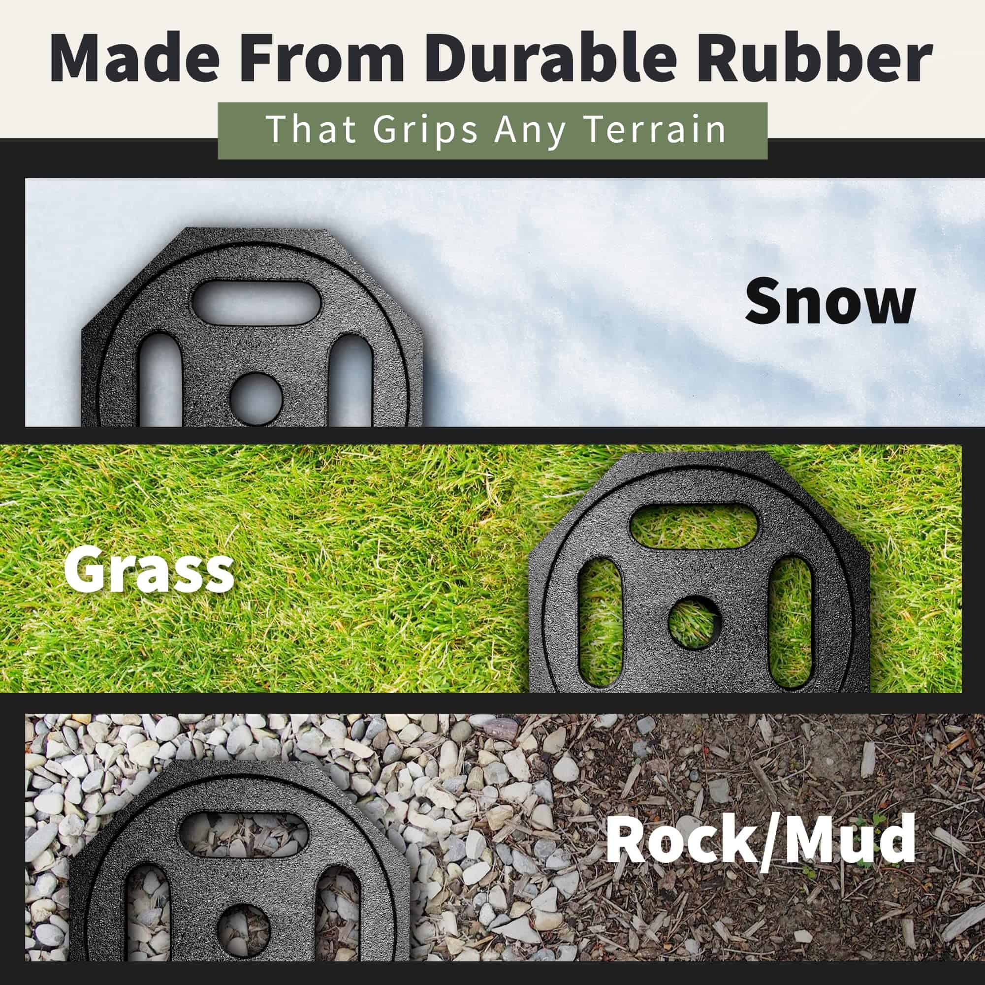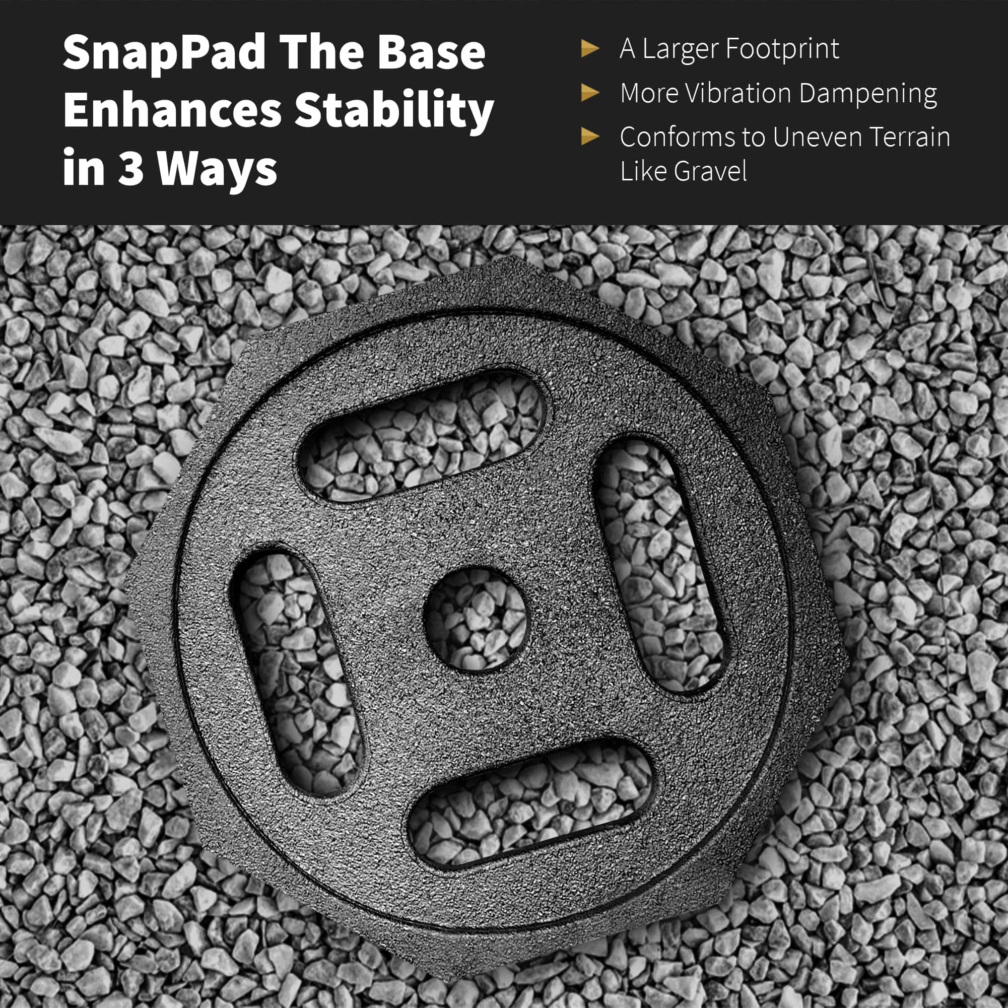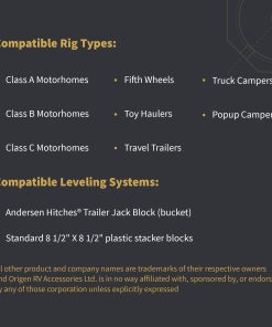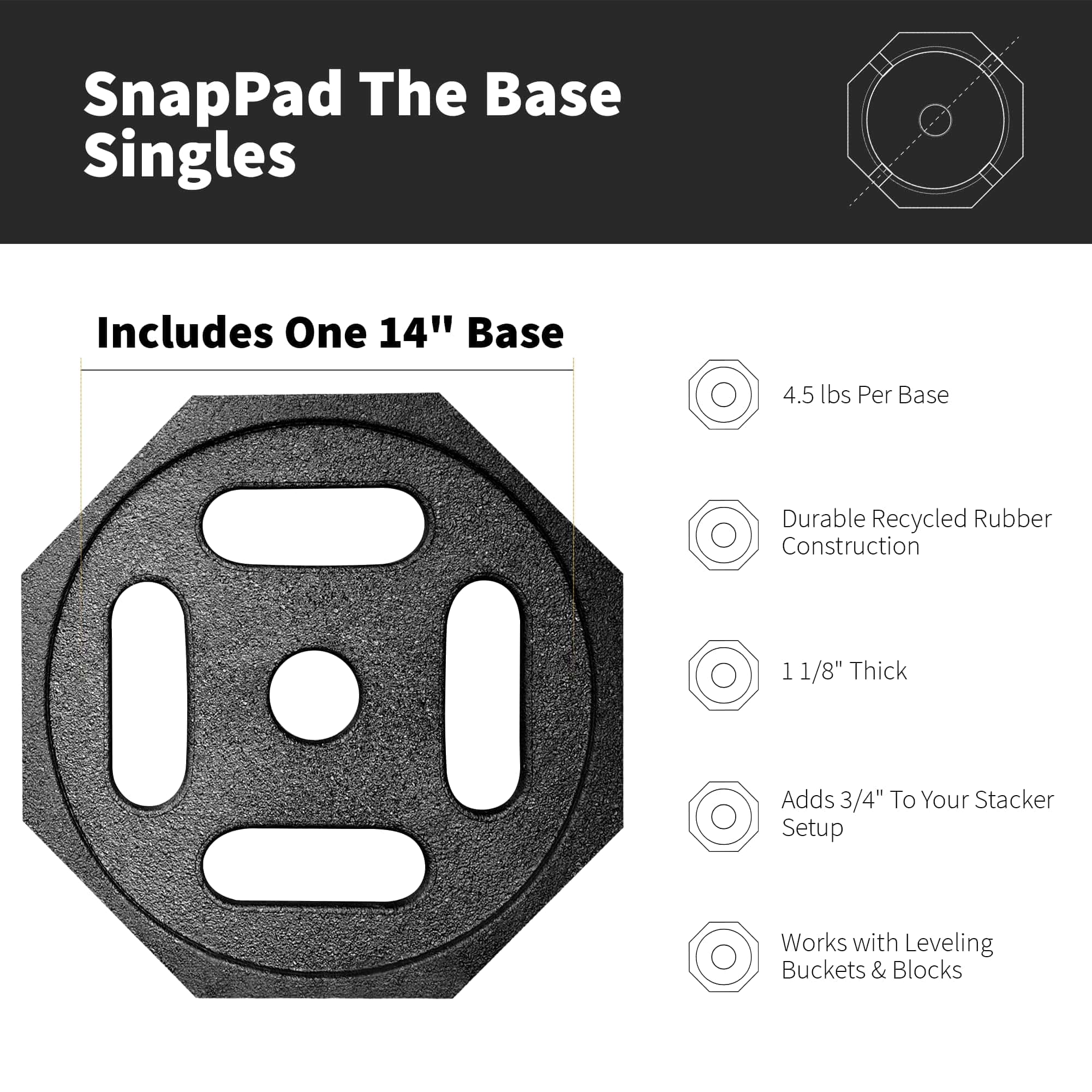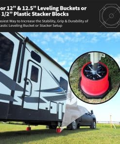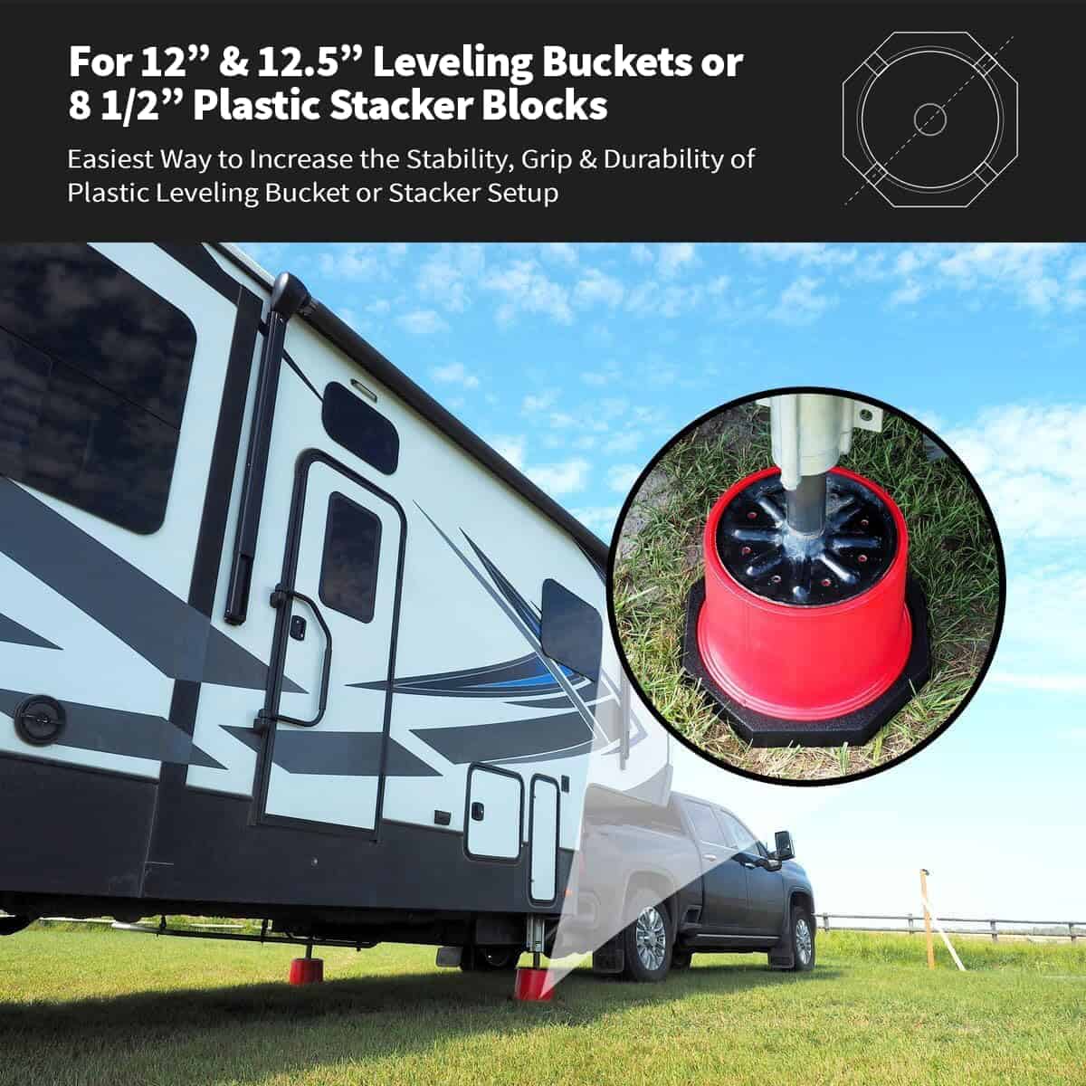 Cracked lips, crush damage, sinkage, unwanted movement – RVers know that dealing with various plastic leveling solutions can be a challenge. With the Base RV leveling blocks by SnapPad, you quickly and easily increase the footprint and durability of your bucket jack blocks or plastic stacker setup. The Base camper leveling blocks are the easiest way to increase the stability, grip, and durability of your plastic leveling bucket or stacker setup. Snap on these must-have camper accessories and say goodbye to crawling under your rig every time you set up. Made in the USA from recycled American tires, SnapPad The Base RV jack pads increase stability in 3 ways: a larger footprint, more vibration dampening, and by conforming to uneven terrain like gravel. Made from the same rugged recycled rubber that SnapPads is famous for, The Base trailer jack block is a universal stability-enhancing solution that fits Andersen Hitches Trailer Jack Block, as well as a wide variety of standard 8 X 8 stacker blocks or 12.5″ leveling buckets. The Base trailer leveling blocks are engineered to be resistant to UV exposure, water, heat, oil, tar, mud, and other environmental hazards. Absorbing the daily punishment of the road and elements, these RV leveling jacks protect your plastic leveling buckets & blocks from damage by gravel, concrete, asphalt, and the environment.