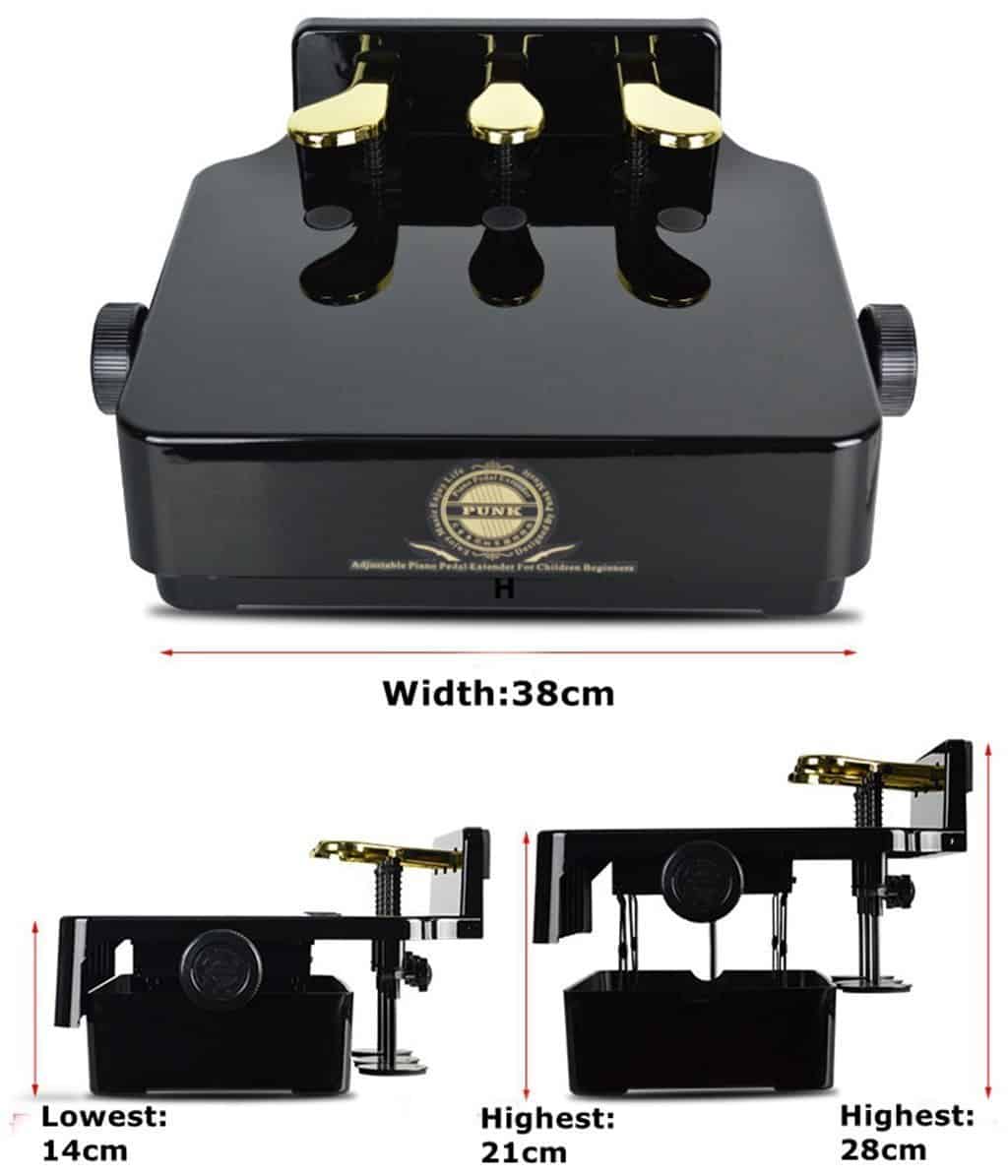 1. Nuevo diseño y nuevo material de ABS. Ligero pero portátil. 2. Diseño con 3 pedales. También se aplica al piano de dos pedales. Ajustable fácilmente de 5.5″ a 9″. 3. Diseño redondo y suave del borde. Protege a tus hijos de lastimarse. 4. Compatible con cualquier piano. No requiere montaje. Regalo perfecto para las fiestas. 5. Diseñado para ser ligero y portátil. Si necesitas un extensor de pedal de piano más pesado y de madera, por favor busca: B094Y62CCL.