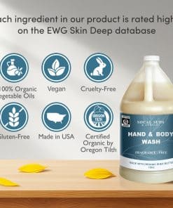 SoCal Suds & Company presenta su Jabón de Manos y Cuerpo Orgánico Certificado de 128 oz con Manteca de Karité, un producto diseñado para pieles sensibles que buscan un limpiador suave y nutritivo. Con una fórmula a base de ingredientes naturales, este jabón corporal hidratante es ideal para toda la familia, desde bebés hasta mascotas. Su textura sedosa y suave, enriquecida con aceites orgánicos y manteca de karité, deja la piel limpia, suave y nutrida en cada aplicación. Certificado orgánico por Oregon Tilth, este jabón de manos y cuerpo está libre de productos químicos dañinos, ofreciendo una opción segura y limpia para el uso diario. Apto para todo tipo de piel, este jabón corporal contienen ingredientes naturales que calman, hidratan y protegen la piel sensible, seca o normal. Su envase fácil de usar lo convierte en un producto práctico para el uso diario en el hogar o los viajes. Descubre la suavidad y el cuidado que proporciona el Jabón de Cuerpo y Manos Orgánico Certificado de SoCal Suds & Company y disfruta de una piel suave, lisa y refrescada después de cada ducha.