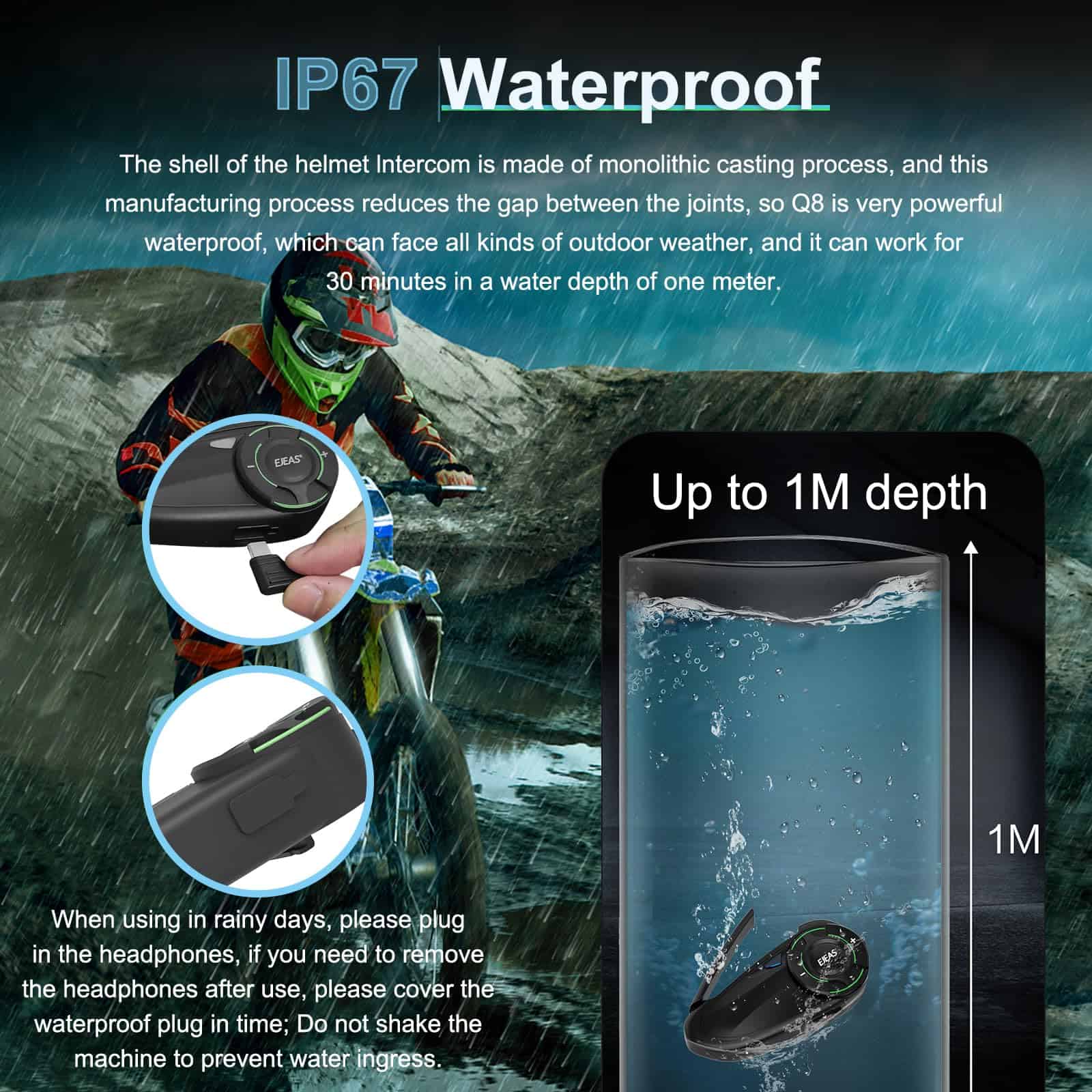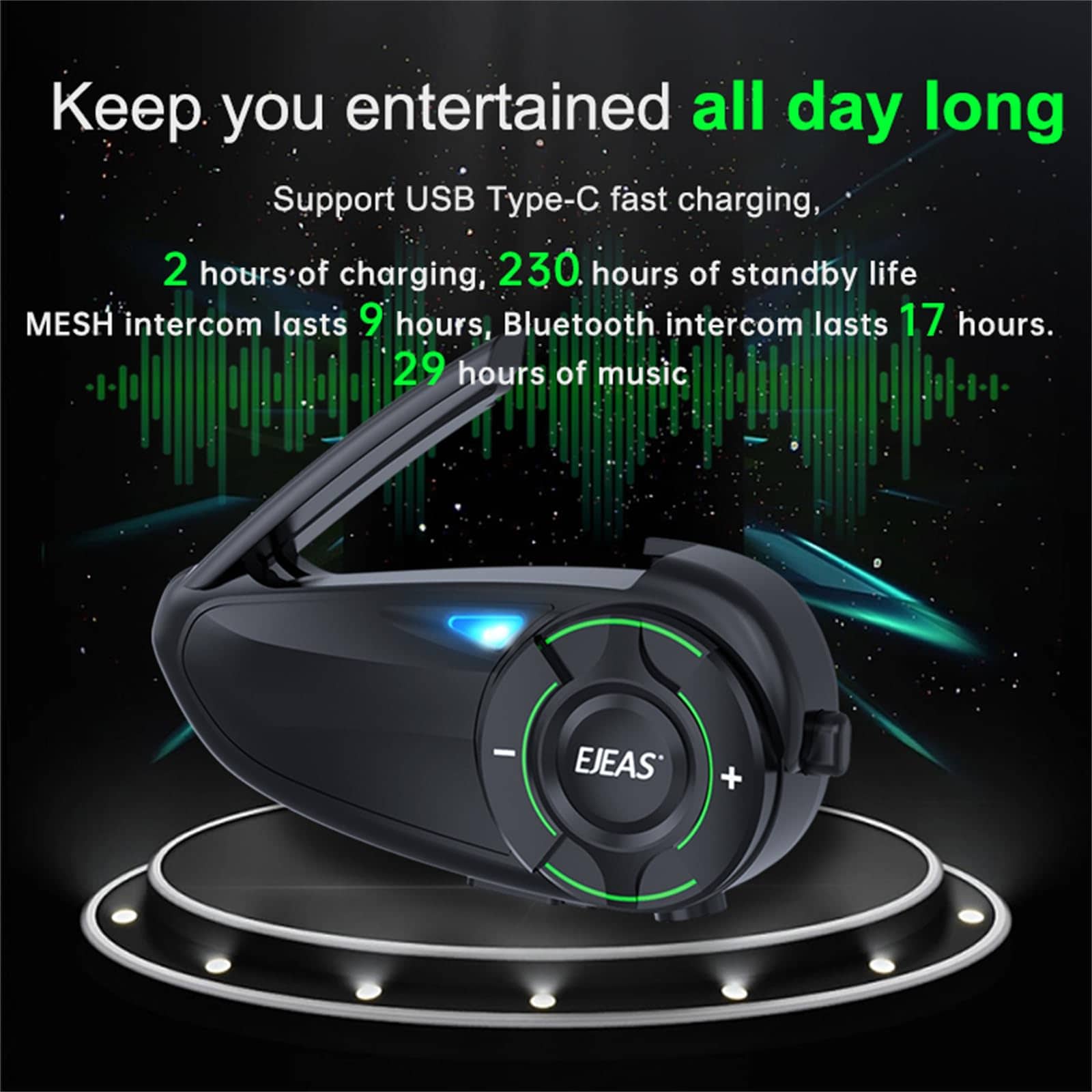 El headset de intercomunicación de malla actualizado está diseñado específicamente para uso en exteriores, manteniéndote en contacto cercano con amigos. Para entornos obstruidos como túneles, pendientes pronunciadas y curvas, tiene una fuerte penetración y señales ultra estables. La distancia máxima de intercomunicación entre dos cascos medidos en secciones de carretera no abiertas es de 1300 pies, y la distancia máxima de intercomunicación en secciones de carretera abiertas es de 2600 pies. No quiere interrumpir la música y la radio FM al hablar con sus amigos. Este headset de intercomunicación de procesamiento de audio múltiple puede satisfacer sus necesidades. Durante el intercomunicador, el volumen de la música y la FM disminuye automáticamente, por lo que no se perderá ninguna comunicación con sus compañeros de equipo. También hay una función para compartir música con compañeros de equipo, lo cual es muy adecuado para compañeros de equipo cercanos y hace que el viaje sea más interesante. Este auricular de intercomunicación Q8 está diseñado específicamente para condiciones climáticas adversas que van desde -20 a -10 , brindándole una experiencia de conducción al aire libre más segura y conveniente. La batería de alta capacidad integrada de 1200 mAh es el doble de la capacidad de la batería del auricular de intercomunicación en el mercado. El tiempo de espera es de 230 horas y puede reproducir música durante 29 horas. Resistente al agua, al polvo, al viento y a la reducción de ruido: el altavoz emite un sonido estéreo de alta calidad y puede comunicarse claramente incluso a velocidades de 140 yardas por hora y 80 millas/h. Equipado con clasificación de impermeabilidad IP67, no teme a los días lluviosos e incluso puede funcionar durante 3 horas bajo el agua por un metro. Proporcione garantía de comunicación para sus eventos de ciclismo profesional. Botón simple: simplemente haga clic en el botón de encendido para responder a las llamadas entrantes. Equipado con una función de asistente de voz de activación por voz, mantenga presionado el botón de encendido durante un segundo para despertar. Características adicionales consideradas, conectividad de auricular de intercomunicación de marca cruzada, conectividad de auricular Bluetooth, Bluetooth 5.1