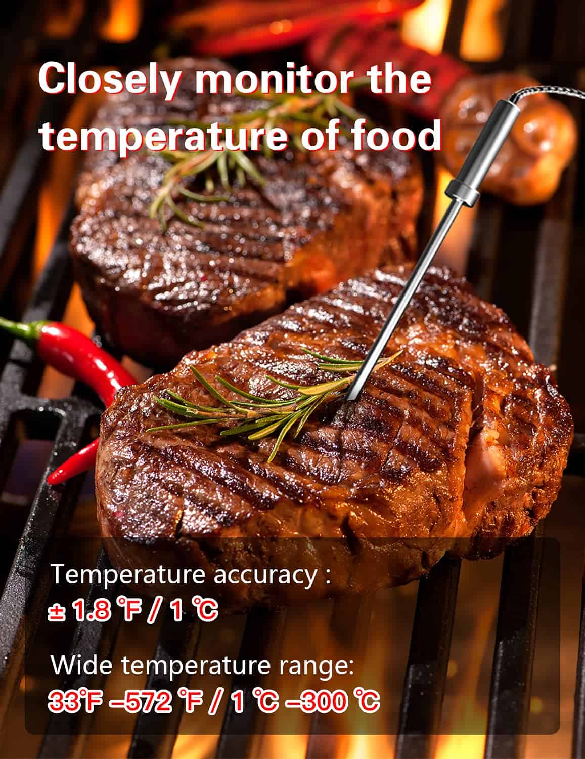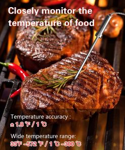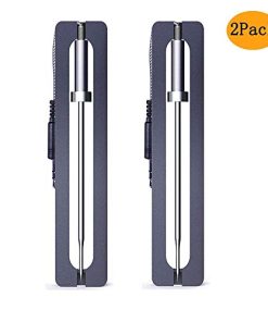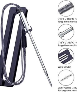 Este set incluye 2 sondas de acero inoxidable de grado alimenticio. El cable de acero inoxidable y el mango de aluminio garantizan durabilidad. El diseño de empaque ABS evita que la mano sea pinchada por la punta de la aguja y facilita su almacenamiento. El cable tiene una longitud de 41.3 pulgadas / 105 cm y el diámetro de la sonda es de 5.5 pulgadas / 14 cm. Las sondas pueden soportar temperaturas de hasta 716 F (380 C). Recuerda que estas son exclusivamente para termómetros de parrilla Bfour con conexión Bluetooth, no son compatibles con otras marcas de termómetros.