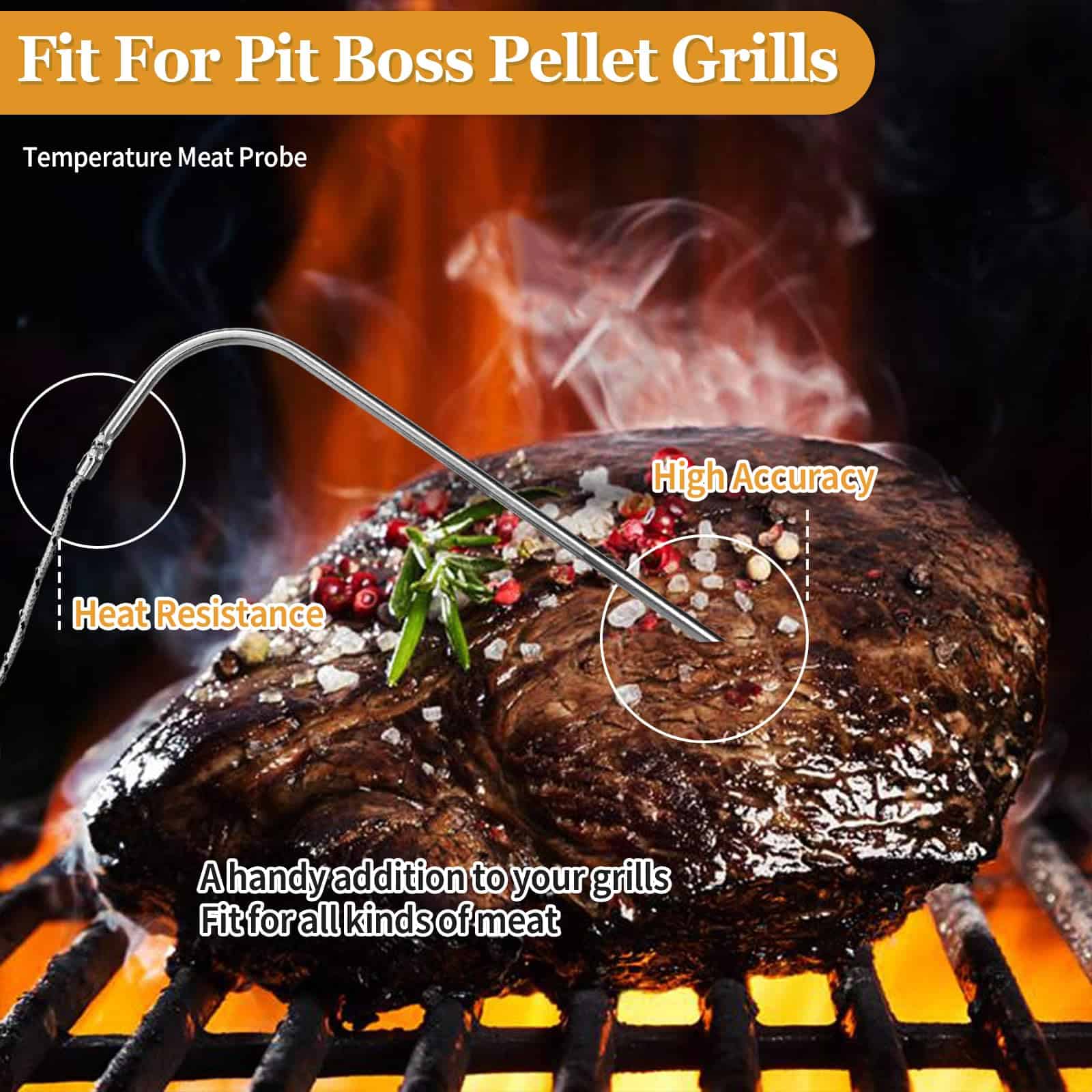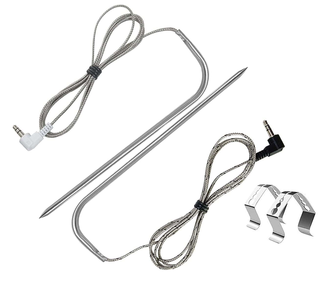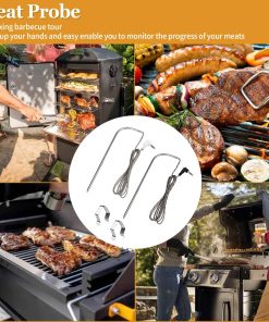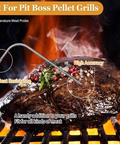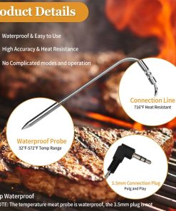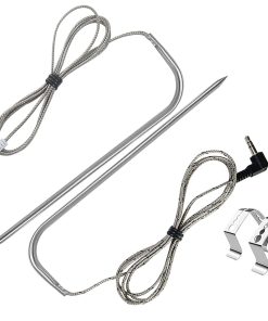 Sondas de carne de repuesto para parrilla de pellets de madera Traeger, compatibles con la serie de parrillas y ahumadores Pit Boss. Reemplace la sonda de temperatura OEM con este termómetro de carne compatible con la mayoría de las parrillas de barbacoa Traeger, como Bronson 20, Deluxe Elite 300, Eastwood 22, Eastwood 34, Heartland, Texas Elite 34, Lil Tex Elite 22, Elite 34, Junior Elite 20, Lonestar 20, Pro 20, Pro Series 34, Renegade Elite 20, Renegade Pro, Select Elite, Select Pro Tailgater, Century, Century 22, Century 34, Longhorn Steer, Pro Series 22, Silverton, Executive, Double Commercial Trailer, XL (No apto para parrillas Masterbuilt y Camp Chef). La sonda de acero inoxidable de grado alimenticio es impermeable y puede soportar temperaturas de hasta 1000 F (500 C). La sonda está equipada con un cable de acero inoxidable resistente al calor que puede soportar temperaturas de hasta 718 F (380 C), junto con una interfaz de compresión de 3 capas con enchufe de 3.5 mm para una fácil conexión. Es compatible con parrillas y ahumadores de pellets Pit Boss con capacidad de sonda de carne digital. La sonda está diseñada para controlar la temperatura de la carne o la parrilla, proporciona una medición precisa y rápida, y es fácil de limpiar. La punta de la sonda se puede enjuagar con agua y el enchufe de 3.5 mm no es resistente al agua ni compatible con termómetros portátiles.