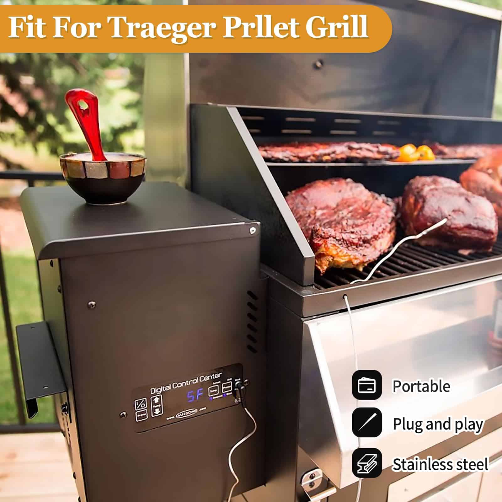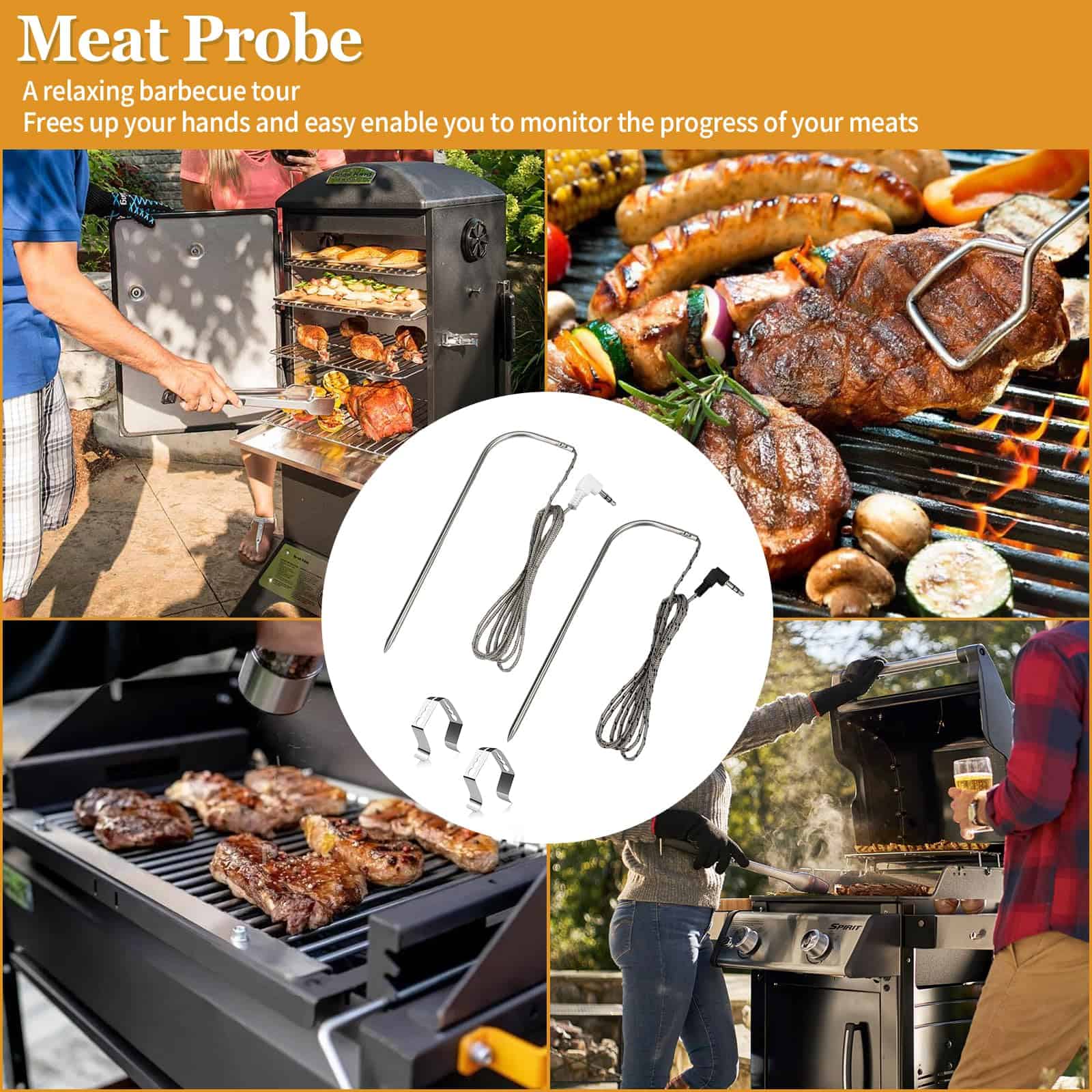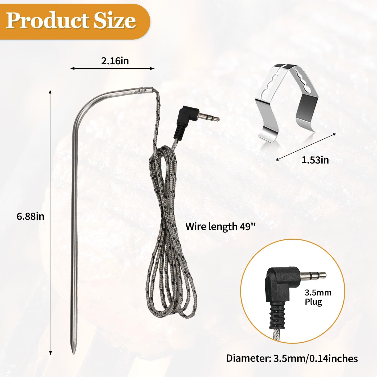 Sondas de carne de repuesto para parrilla de pellets de madera Traeger, compatibles con la serie de parrillas y ahumadores Pit Boss. Reemplace la sonda de temperatura OEM con este termómetro de carne compatible con la mayoría de las parrillas de barbacoa Traeger, como Bronson 20, Deluxe Elite 300, Eastwood 22, Eastwood 34, Heartland, Texas Elite 34, Lil Tex Elite 22, Elite 34, Junior Elite 20, Lonestar 20, Pro 20, Pro Series 34, Renegade Elite 20, Renegade Pro, Select Elite, Select Pro Tailgater, Century, Century 22, Century 34, Longhorn Steer, Pro Series 22, Silverton, Executive, Double Commercial Trailer, XL (No apto para parrillas Masterbuilt y Camp Chef). La sonda de acero inoxidable de grado alimenticio es impermeable y puede soportar temperaturas de hasta 1000 F (500 C). La sonda está equipada con un cable de acero inoxidable resistente al calor que puede soportar temperaturas de hasta 718 F (380 C), junto con una interfaz de compresión de 3 capas con enchufe de 3.5 mm para una fácil conexión. Es compatible con parrillas y ahumadores de pellets Pit Boss con capacidad de sonda de carne digital. La sonda está diseñada para controlar la temperatura de la carne o la parrilla, proporciona una medición precisa y rápida, y es fácil de limpiar. La punta de la sonda se puede enjuagar con agua y el enchufe de 3.5 mm no es resistente al agua ni compatible con termómetros portátiles.