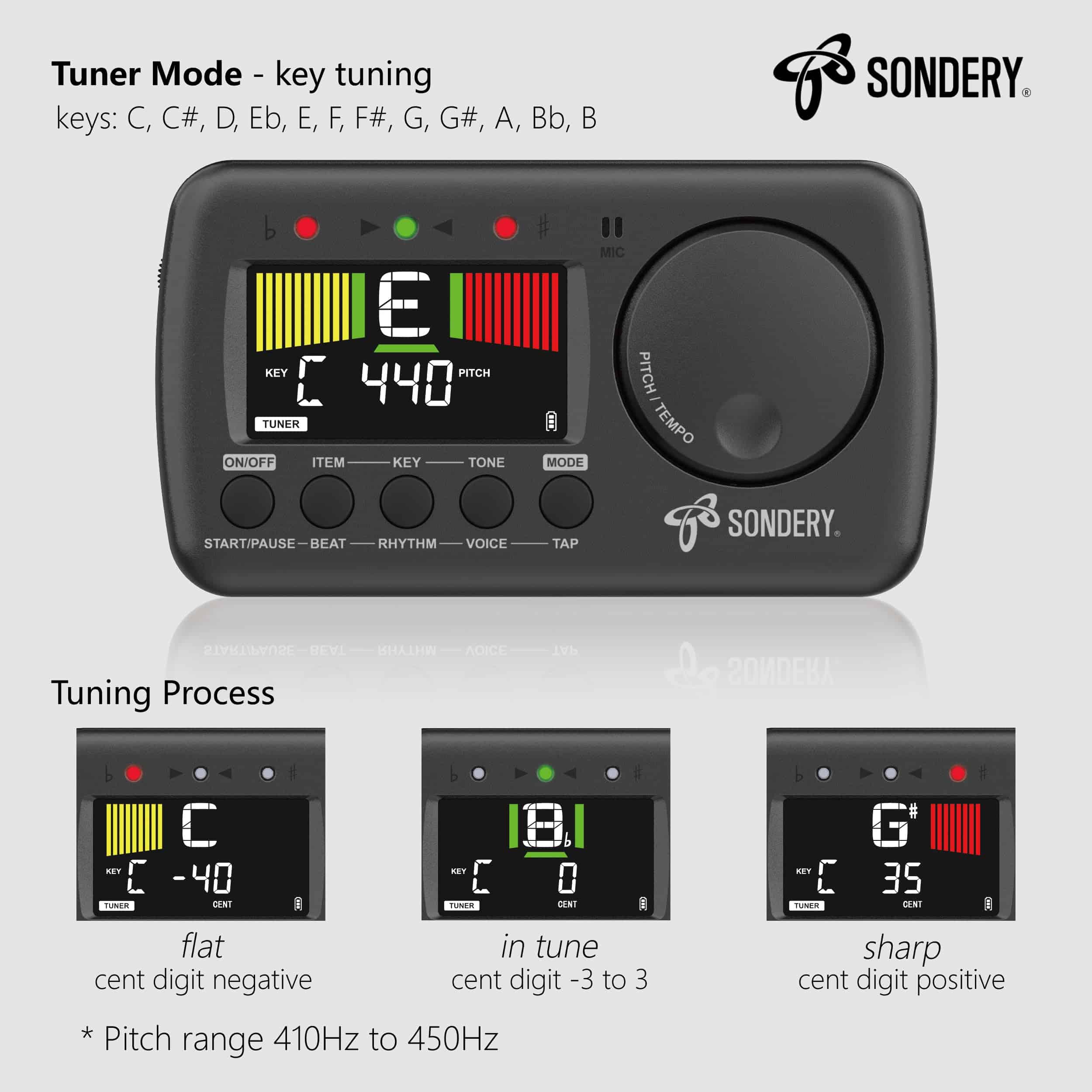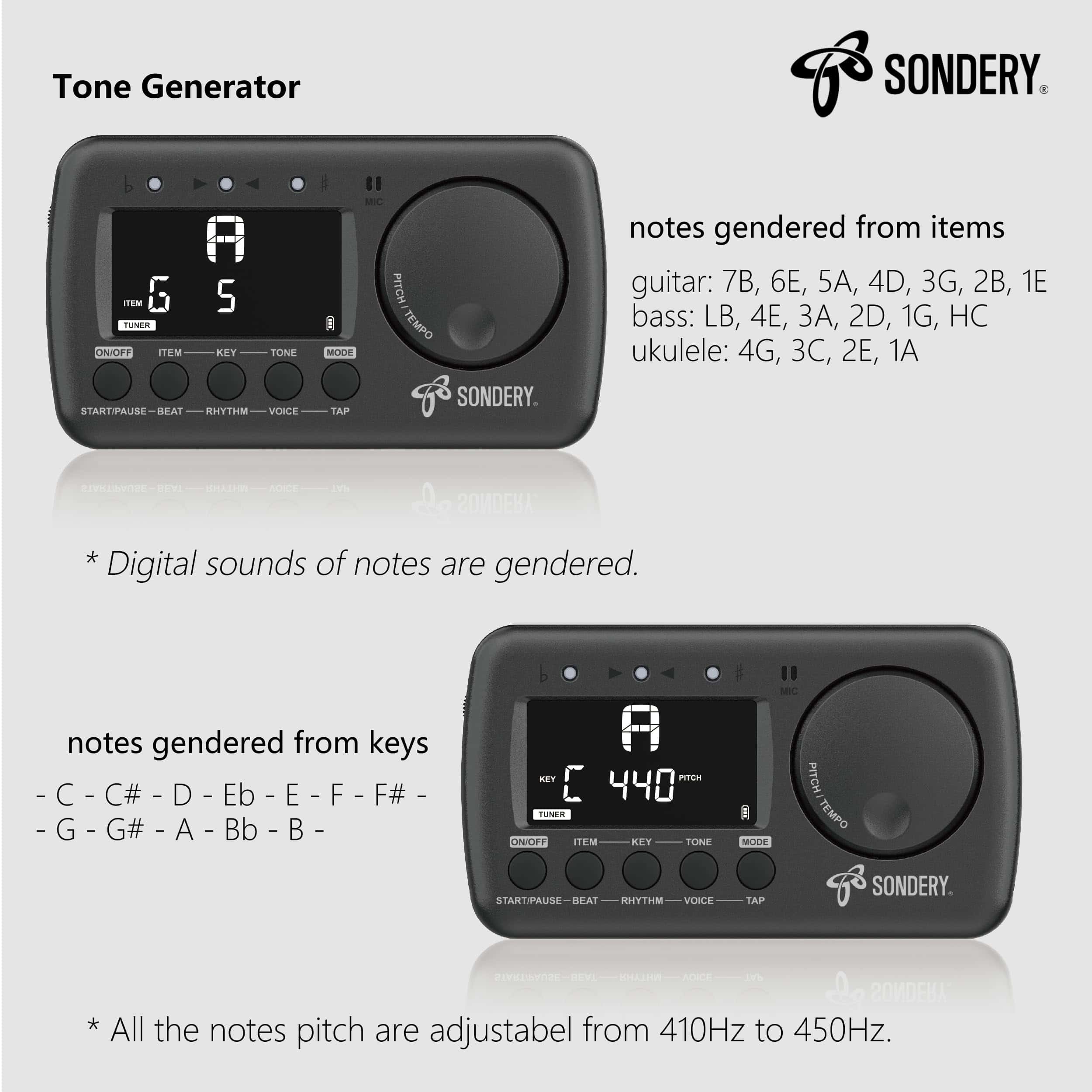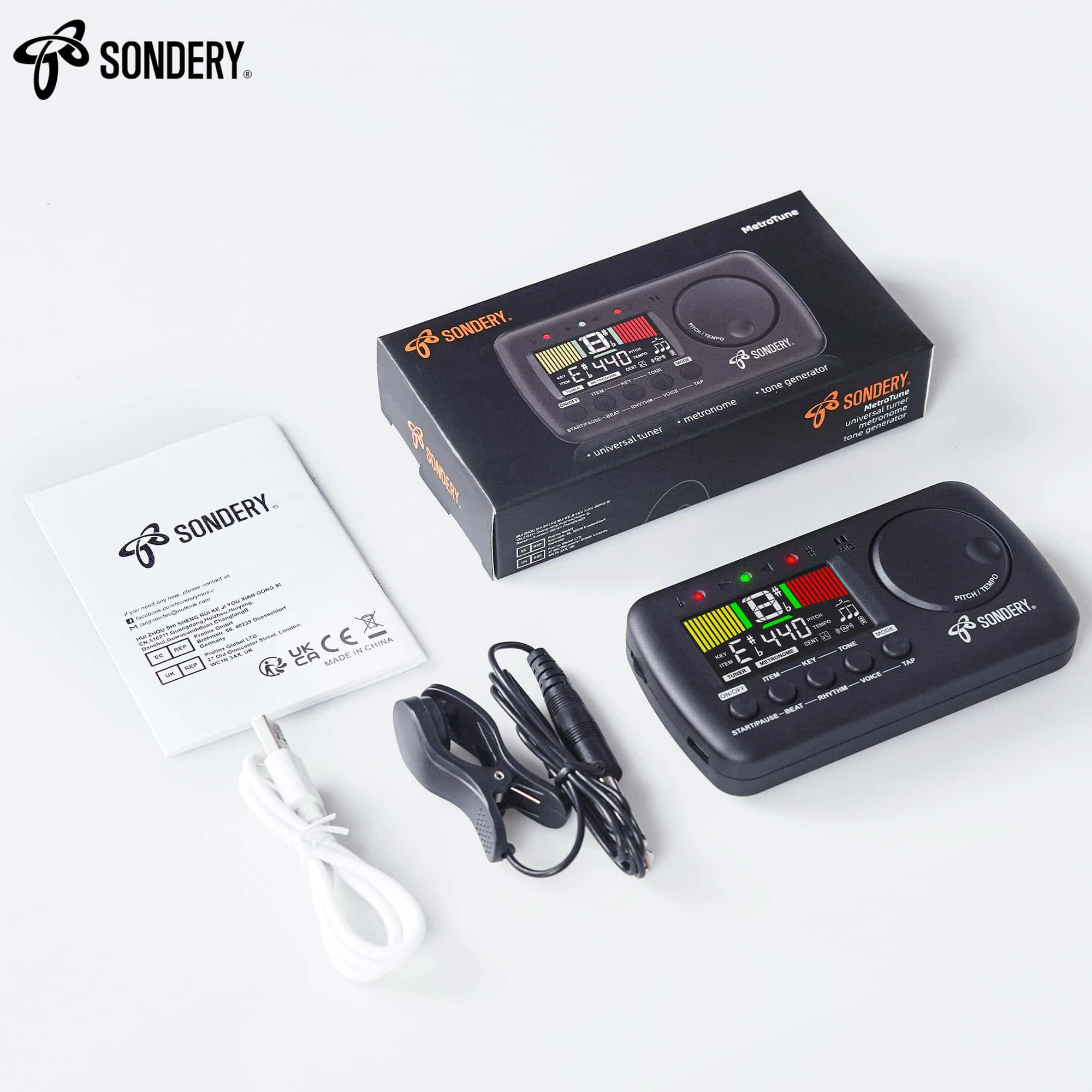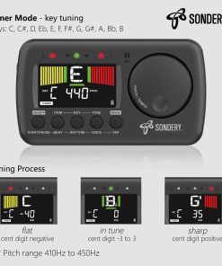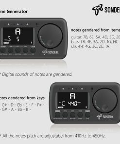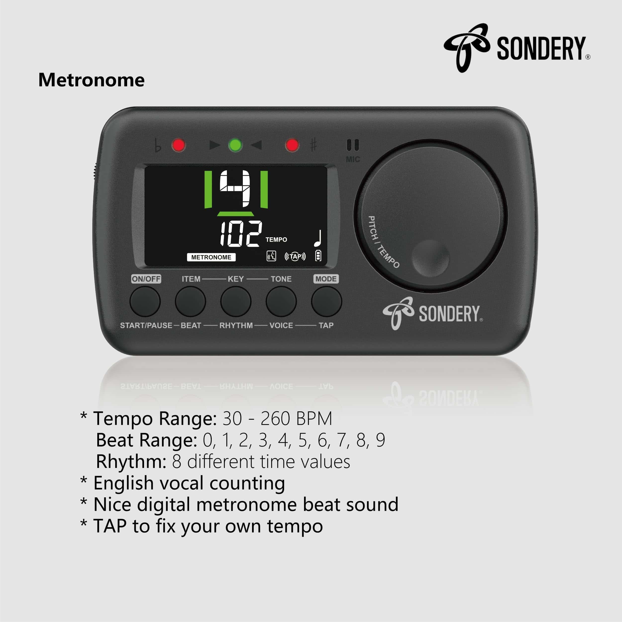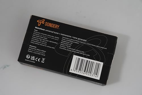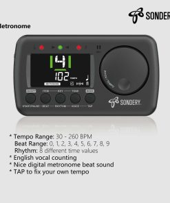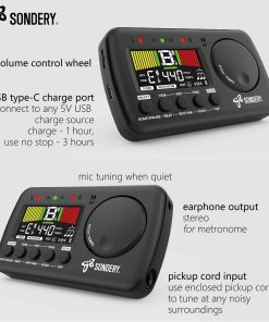 Sondery Afinador y Metrónomo para Todos los Instrumentos. Afinador rápido y preciso con varios elementos de afinación cromática, guitarra, bajo y ukelele, 12 claves de afinación diferentes y calibración de tono de 410Hz a 450Hz, con método de afinación utilizando micrófono interno o cable de recogida incluido. Metrónomo vocal en inglés con tempo de 30-260bpm, ajuste de tempo autónomo tocando, ritmos de 0 a 9 y 8 ritmos diferentes. El conteo vocal en inglés ayuda enormemente a seguir el ritmo correctamente. Dial JOG diseñado para un uso fácil, permite ajustar rápidamente el tempo deseado para el metrónomo y cambiar a un tono en el Generador de Tono y el Afinador. Recargable, se puede conectar a cualquier fuente de alimentación USB de 5V con el cable USB tipo C incluido para cargar el dispositivo. Con una batería de Li de 600mAH en su interior, solo 1 hora de carga para un funcionamiento ininterrumpido de 5 horas. ¡Ahorra muchas baterías!