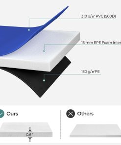 3. Su Durabilidad Radica en. Su material duradero compuesto por una cubierta de PVC (500D) de 310 g resistente a los rayos UV y al agua, espuma EPE de 15 mm de grosor, parte inferior de PE de 130 g, y costuras expertas, que se comprometen a proteger tu trampolín en días lluviosos y soleados por igual.