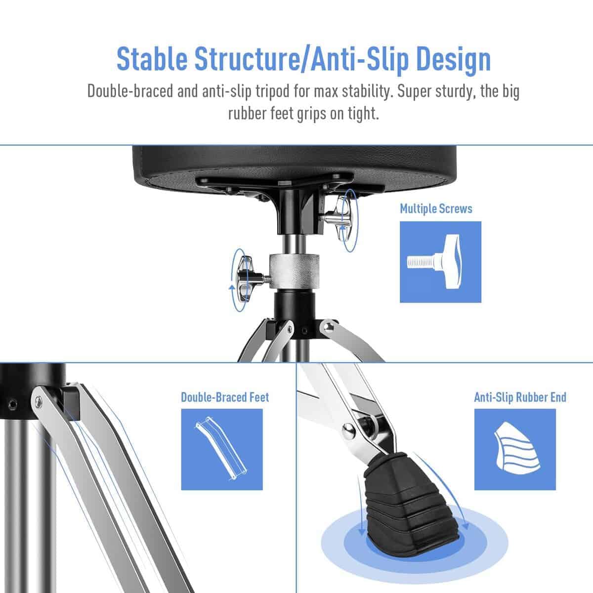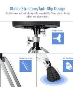 1. Asiento Acolchado Cómodo: Asiento de batería de 3.15 pulgadas / 8 cm de grosor con esponja de alta densidad en el interior que proporciona un soporte suave y firme para los bateristas durante la batería de larga duración, que también es duradero y elástico. 2. Base de Piernas de Doble Reforzado: La banqueta de batería es estable y duradera con una base de patas de doble refuerzo, y también está libre de distorsiones al sostener personas de peso pesado. Peso máximo soportado: 450 lb / 200 kg. 3. Ajuste de Altura Giratorio: De 16.93in a 23.62in, este taburete para bateristas es giratorio para satisfacer la necesidad de alturas ajustables específicas, en lugar de pasos de altura fijos. La vara giratoria sólida de 0.9 pulgadas representa durabilidad y profesionalismo. 4. Antideslizante: Este taburete de tres patas tiene tres mangas de goma antideslizantes para evitar que la banqueta de batería SONICAKE se deslice mientras tocas la batería. 5. Ampliamente Utilizado: la banqueta de batería SONICAKE puede ser de gran utilidad para una variedad de músicos como tecladista, guitarrista, incluso un músico de viento metal, merece tener un taburete altamente cómodo donde pueda sentarse y simplemente disfrutar tocando su instrumento musical.