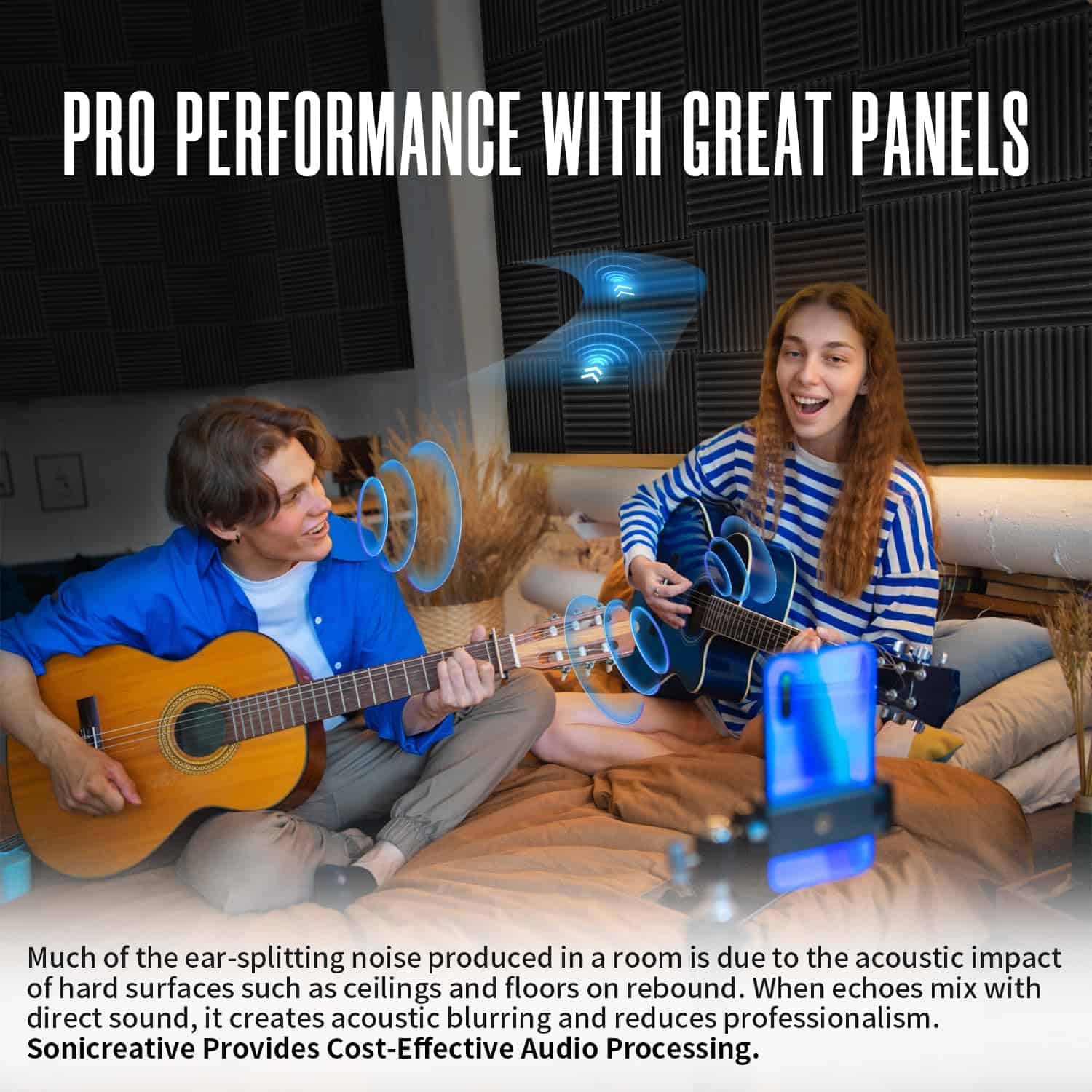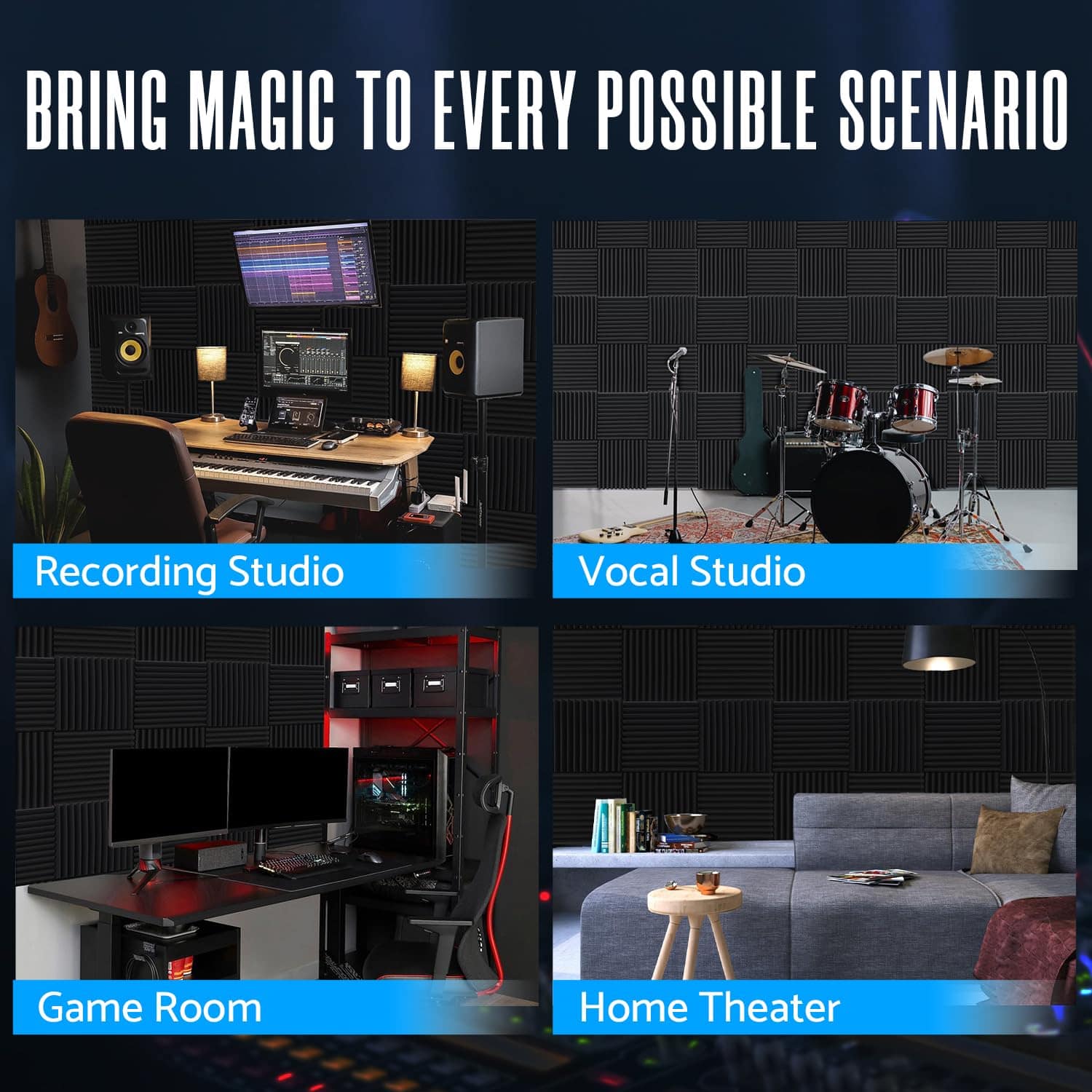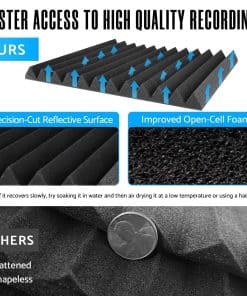 Nuestras paneles de espuma acústica en forma de cuña Sonicreative están diseñadas con 12 surcos que maximizan la reducción del área de contacto entre las unidades. Esto obliga a las ondas de sonido a seguir múltiples trayectorias en espiral, refractando eficazmente las ondas de sonido. La superficie porosa absorbe fácilmente la energía del sonido, proporcionando una solución efectiva para gestionar la reverberación del sonido en interiores. Nuestras paneles de espuma acústica son de material altamente resistente que vuelve rápidamente a su forma original incluso después de ser comprimido y embalado durante un período prolongado. Los paneles insonorizantes acústicos recuperan rápidamente su forma en solo 3-5 horas de dispersión y ventilación. NOTA: Si no recupera su forma, sumerja los paneles de pared de reducción de ruido en agua durante un minuto, luego escurra el agua y séquelo a baja temperatura o al aire/sol. Nuestros paneles de pared insonorizantes de alta densidad están hechos de espuma de poliuretano de alta calidad respetuosa con el medio ambiente, no tóxica y libre de formaldehído. Sometida a una serie de innovadores procesos de alta temperatura, resultando en una elasticidad y resistencia incomparables, mejorando enormemente la durabilidad y la vida útil. Puede esperar el mejor rendimiento en gestión del sonido sin comprometer la calidad. Nuestros paneles de espuma acústica de 1 pulgada canceladores de ruido económicos son más adecuados para áreas grandes del estudio y son no tóxicos y libres de olores para afectar su trabajo. No solo es adecuado para estudios de grabación, sala de ensayo, sala de cine en casa, estudio de voz, sala de juegos, sala de control y otros lugares, sino que también se puede instalar en paredes, puertas, techos, etc. Nuestro panel absorbente de sonido está hecho de espuma absorbente de sonido suave y de grado profesional, que es suave y flexible. NOTA: Este producto no incluye una herramienta adhesiva, pero puede comprar nuestro adhesivo cuadrado por separado (buscar B0CFV11LVN). Úselo para transformar su espacio de trabajo.