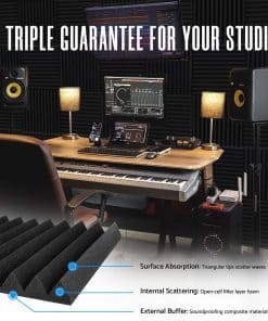 1. Nuestras paneles de espuma acústica en forma de cuña están diseñadas con 12 surcos que maximizan la reducción del área de contacto entre las unidades. Esto obliga a las ondas de sonido a seguir múltiples trayectorias en espiral, refractando eficazmente las ondas de sonido. La superficie porosa absorbe fácilmente la energía del sonido, proporcionando una solución efectiva para gestionar la reverberación del sonido en interiores. 2. Nuestras paneles de espuma acústica son de material altamente resistente que vuelve rápidamente a su forma original incluso después de ser comprimido y embalado durante un período prolongado. Los paneles insonorizantes acústicos recuperan rápidamente su forma en solo 3-5 horas de dispersión y ventilación. NOTA: Si no recupera su forma, sumerja los paneles de pared de reducción de ruido en agua durante un minuto, luego escurra el agua y séquelo a baja temperatura o al aire/sol. 3. Nuestros paneles de pared insonorizantes de alta densidad están hechos de espuma de poliuretano de alta calidad respetuosa con el medio ambiente, no tóxica y libre de formaldehído. Sometida a una serie de innovadores procesos de alta temperatura, resultando en una elasticidad y resistencia incomparables, mejorando enormemente la durabilidad y la vida útil. Puede esperar el mejor rendimiento en gestión del sonido sin comprometer la calidad. 4. OPCIÓN LIBRE DE OLORES Y ECONÓMICA Nuestros paneles de espuma acústica de 1 pulgada canceladores de ruido económicos son más adecuados para áreas grandes del estudio y son no tóxicos y libres de olores para afectar su trabajo. No solo es adecuado para estudios de grabación, sala de ensayo, sala de cine en casa, estudio de voz, sala de juegos, sala de control y otros lugares, sino que también se puede instalar en paredes, puertas, techos, etc. 5. INSTALACIÓN Nuestro panel absorbente de sonido está hecho de espuma absorbente de sonido suave y de grado profesional, que es suave y flexible. NOTA: Este producto no incluye una herramienta adhesiva, pero puede comprar nuestro adhesivo cuadrado por separado (buscar B0CFV11LVN). Úselo para transformar su espacio de trabajo.