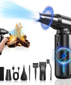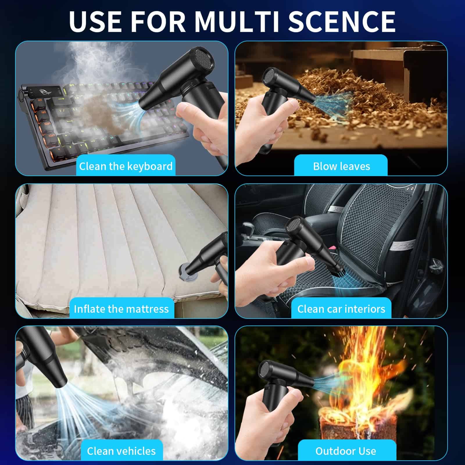 2. Amplia Aplicación: El soplador de aire eléctrico viene con 3 boquillas y 3 cepillos, haciéndolo adecuado para una variedad de escenarios, como la limpieza de PC, teclados u otros dispositivos electrónicos. Además de un kit de limpieza para el hogar y un soplador para autos, también funciona bien para actividades al aire libre como inflar y encender fuegos.
