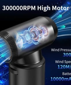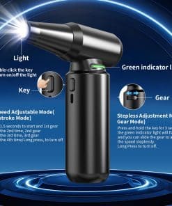 1. Ventilador Turbo de Súper Potencia: El soplador de aire comprimido AEDNX X20 alcanza velocidades de hasta 300,000 RPM, ofreciendo una velocidad máxima del viento de 120m/s. Esto le permite limpiar eficazmente el polvo y los residuos. El soplador de aire eléctrico también cuenta con 3 modos de velocidad ajustable y un modo de ajuste de velocidad continuo para adaptarse a diversas necesidades de limpieza.