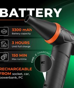 5. Carga Segura y Rápida: Nuestro soplador de aire recargable es seguro y tiene una capacidad de carga rápida USB-C, que puede cargarse completamente en 3 horas. Con características de seguridad incorporadas como prevención de cortocircuitos, protección contra corrientes excesivas, administración de sobrecargas y control de descargas excesivas, puede estar seguro de que su soplador de aire es tanto potente como confiable, protegiendo sus dispositivos de posibles riesgos