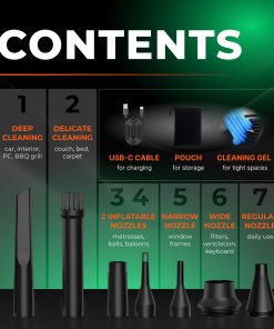 2. Potente Soplador de Aire Inalámbrico para Diversas Aplicaciones: Nuestro soplador de polvo ofrece un impresionante motor de 150,000 RPM y un conjunto de 7 boquillas intercambiables. Sobresale en limpiar delicadamente electrónicos sensibles como PS5, Xbox, consolas y piezas de computadoras, al tiempo que ofrecer la capacidad de inflar globos, colchones y pelotas. Utilice sus boquillas de precisión para una limpieza profunda en espacios estrechos como marcos de ventanas, interiores de automóviles y áreas de parrilla.