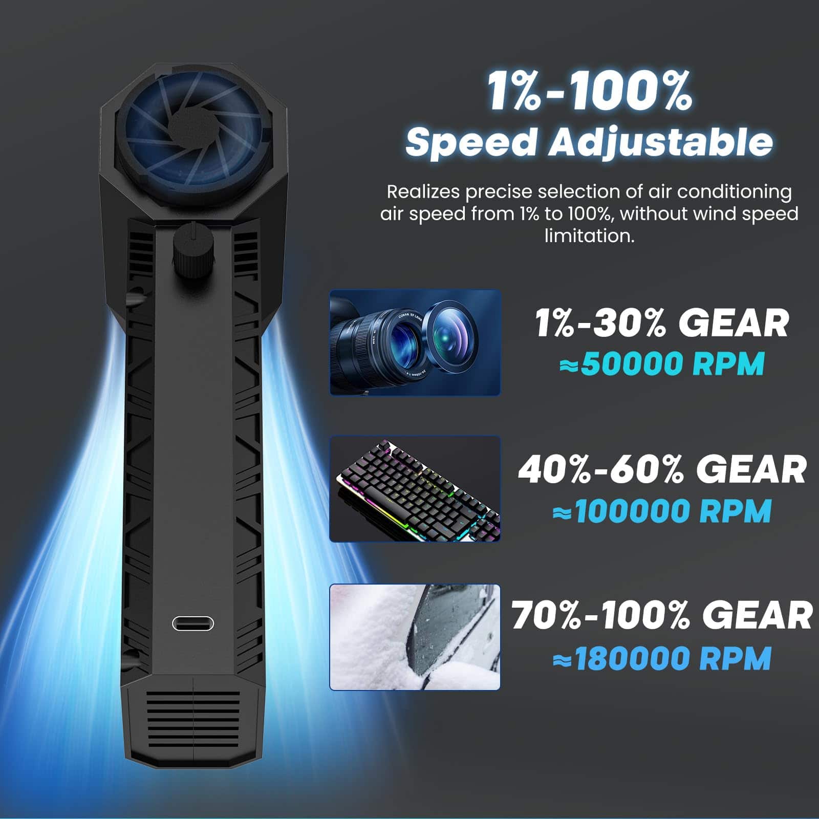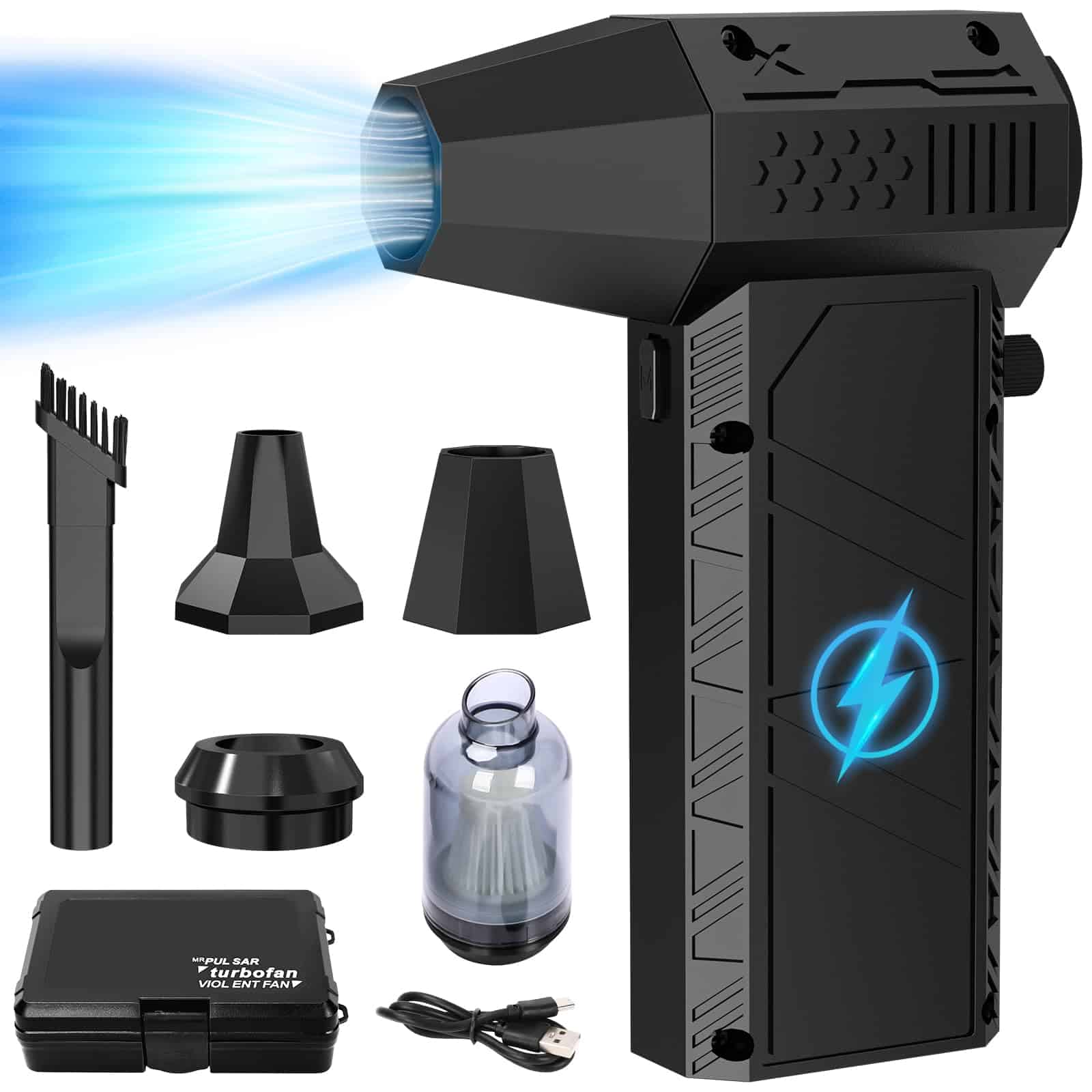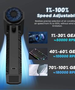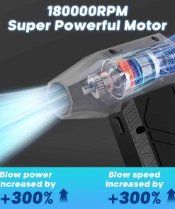 1. Motor de Turbina Súper Potente de 180,000 RPM Este soplador de aire comprimido tiene una velocidad máxima de 180,000 RPM, proporcionando hasta 200G de presión de aire y más de 80 m/s de velocidad de aire. El motor de turbina de ultra alta velocidad garantiza un rendimiento superior y un flujo de aire potente, permitiéndote eliminar fácilmente la suciedad oculta en cada grieta de tu teclado o cualquier dispositivo electrónico con máxima eficiencia, haciéndolo extremadamente conveniente de usar en colecciones de polvo en tu hogar, oficina o coche.