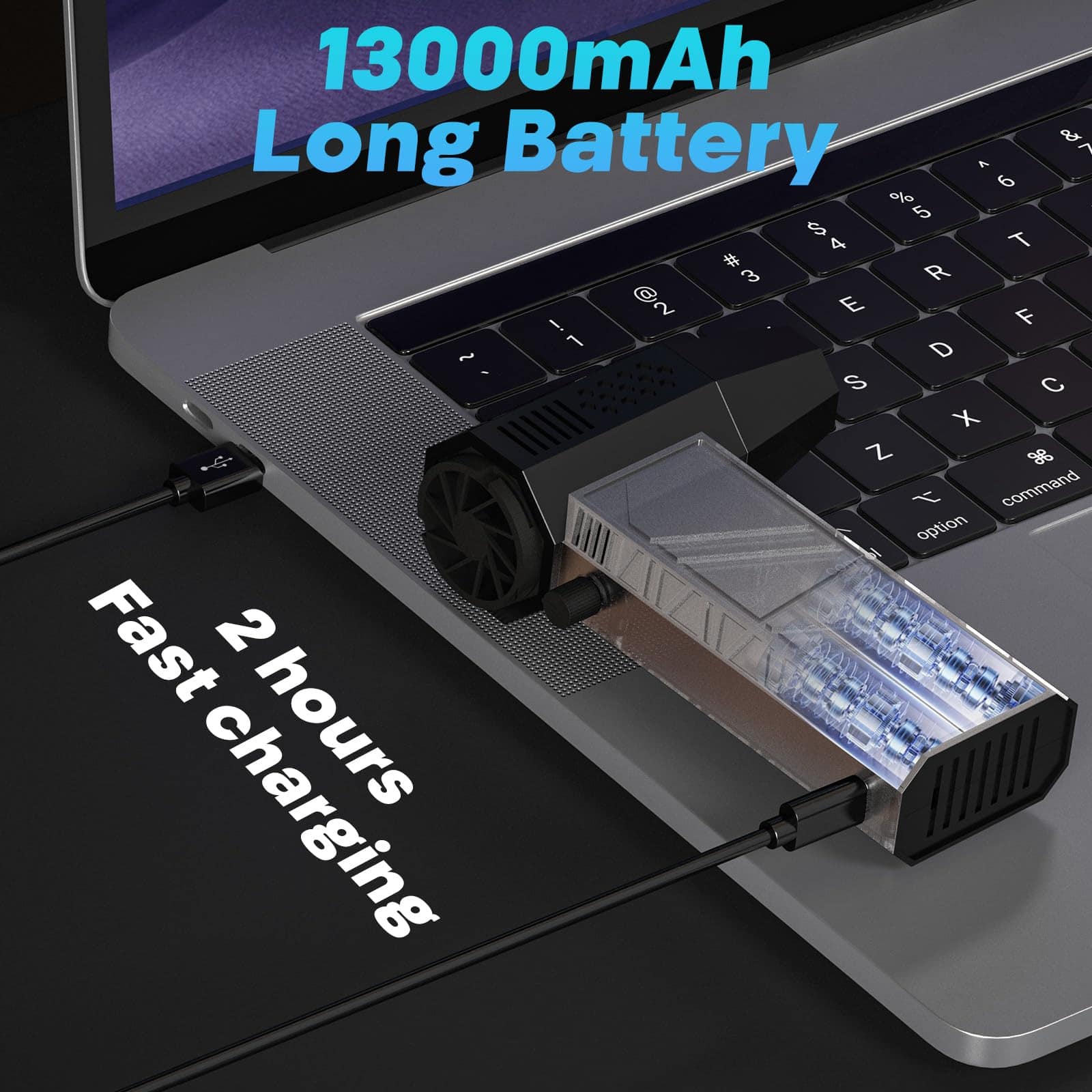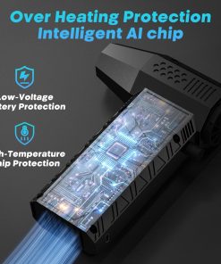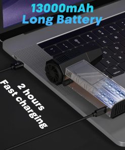 4. Batería de Larga Duración de 13000mAh y Carga Rápida Este soplador de aire eléctrico está equipado con una batería de 13000mAh para un tiempo de uso extendido y garantiza un rendimiento duradero. Con carga rápida Type-C, puede cargarse completamente en 2-2.5 horas. En el ajuste de velocidad más bajo, puede funcionar hasta 60 minutos, proporcionando energía confiable para tus tareas de limpieza. Además, nuestra batería de gran capacidad especialmente personalizada cuenta con protección de temperatura, protección de corriente y protección contra cortocircuitos.
