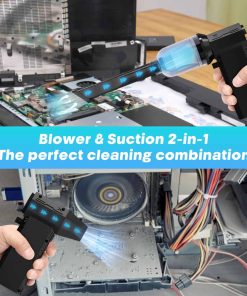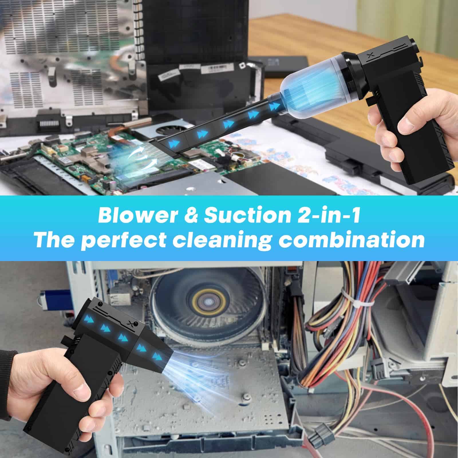 6. Función de Vacío Incorporada Comparado con los colectores de polvo comprimidos en lata tradicionales, nuestros productos no solo pueden rociar un fuerte flujo de aire para limpiar, sino que también tienen una función de succión de polvo incorporada, que puede succionar directamente el polvo, los desechos y las partículas finas, evitando que el polvo vuele por todas partes, haciendo que el proceso de limpieza sea más eficiente y limpio. Esto no solo mejora la experiencia del usuario, sino que también reduce el trabajo de limpieza adicional, lo que es especialmente adecuado para las necesidades de limpieza de equipos de precisión, productos electrónicos, interiores de coches y entornos de oficina.