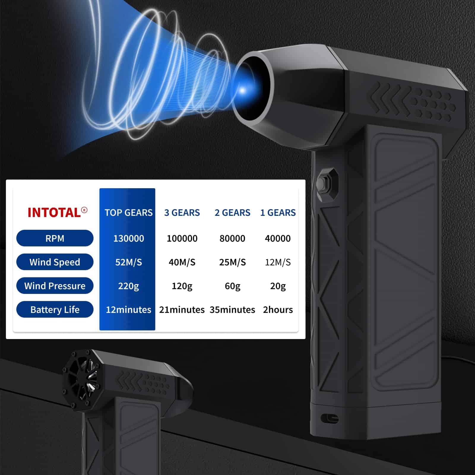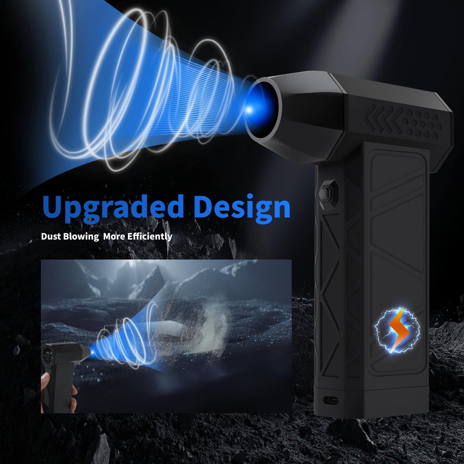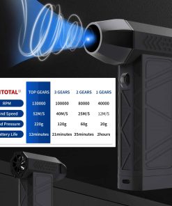 1. Rendimiento Potente: La velocidad máxima del motor del recolector de polvo de aire comprimido es de 130,000 RPM, la presión máxima del viento es de 220 gramos, y la velocidad máxima del viento supera los 52 m/s (super tifón 51,0 m/s).